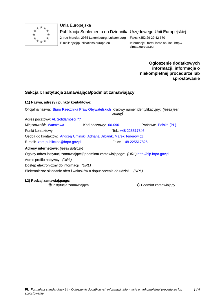 Unia Europejska Publikacja Suplementu do Dziennika Urzędowego Unii Europejskiej 2, rue Mercier, 2985 Luxembourg, Luksemburg Faks: +352 29 29 42 670 E-mail: [email protected] Informacje i formularze on-line: http:// simap.europa.eu Ogłoszenie dodatkowych informacji, informacje o niekompletnej procedurze lub sprostowanie Sekcja I: Instytucja zamawiająca/podmiot zamawiający I.1) Nazwa, adresy i punkty kontaktowe: Oficjalna nazwa: Biuro Rzecznika Praw Obywatelskich Krajowy numer identyfikacyjny: (jeżeli jest znany) _____ Adres pocztowy: Al. Solidarności 77 Miejscowość: Warszawa Kod pocztowy: 00-090 Punkt kontaktowy: _____ Państwo: Polska (PL) Tel.: +48 225517846 Osoba do kontaktów: Andrzej Umiński, Adriana Urbanik, Marek Tenerowicz E-mail: [email protected] Faks: +48 225517826 Adresy internetowe: (jeżeli dotyczy) Ogólny adres instytucji zamawiającej/ podmiotu zamawiającego: (URL) http://bip.brpo.gov.pl Adres profilu nabywcy: (URL) _____ Dostęp elektroniczny do informacji: (URL) _____ Elektroniczne składanie ofert i wniosków o dopuszczenie do udziału: (URL) _____ I.2) Rodzaj zamawiającego: Instytucja zamawiająca Podmiot zamawiający PL Formularz standardowy 14 - Ogłoszenie dodatkowych informacji, informacje o niekompletnej procedurze lub sprostowanie 1/4 Sekcja II: Przedmiot zamówienia II.1.1) Nazwa nadana zamówieniu: Kompleksowa usługa ochrony osób i mienia wybranych obiektów Biura Rzecznika Praw Obywatelskich II.1.2) Krótki opis zamówienia lub zakupu: (podano w pierwotnym ogłoszeniu) Przedmiotem zamówienia jest kompleksowa ochrona wybranych obiektów Biura Rzecznika Praw Obywatelskich wraz z przyległymi terenami oraz znajdujących się w nich osobami i mieniem: Obiekt nr 1 – Warszawa, ul. Długa 23/25 Obiekt nr 2 – Warszawa, al. Solidarności 77 Obiekt nr 3 – Gdańsk, ul. Chmielna 54/57 Obiekt nr 4 – Wrocław, ul. Wierzbowa 5 W ramach usługi Wykonawca zapewnia patrol interwencyjny co najmniej dwuosobowy. Wykonawca współpracuje z pracownikami Straży BRPO w oparciu o wytyczne BRPO. Klauzula społeczna: na podstawie art. 29 ust. 4 pkt 4 ustawy PZP, Zamawiający wymaga, aby Wykonawca zatrudnił co najmniej 15 kwalifikowanych pracowników ochrony świadczących usługę w zakresie bezpośredniej ochrony fizycznej w obiektach Zamawiającego na terenie Warszawy, Gdańska i Wrocławia na podstawie umowy o pracę zgodnie z Kodeksem Pracy, w tym 14 w pełnym wymiarze czasu pracy (pełen etat), natomiast 1 we Wrocławiu w niepełnym wymiarze czasu pracy zgodnie z Kodeksem Pracy, przez cały okres realizacji przedmiotu zamówienia. Uwaga: Niedopuszczalne jest zatrudnianie pracowników realizujących zadania ochronne na podstawie umów cywilnoprawnych, co oznacza, że każda roboczogodzina w ramach realizowanego kontraktu, musi być wypracowana przez pracownika ochrony wyłącznie w ramach stosunku pracy. Zamawiający wymaga, aby do wykonania przedmiotu umowy był kierowany personel, którego wynagrodzenie za pracę jest równe lub przekracza równowartość minimalnego wynagrodzenia za pracę, o którym mowa w ustawie z dnia 10.10.2002 r. o minimalnym wynagrodzeniu za pracę (tj. Dz. U. z 2015 r., poz. 2008). W przypadku powzięcia przez Zamawiającego informacji o naruszeniu przez Wykonawcę powyższych zobowiązań, Zamawiający niezwłocznie zawiadomi o tym fakcie Państwową Inspekcję Pracy celem podjęcia przez nią stosownego postępowania wyjaśniającego w tej sprawie. Obowiązek znajduje zastosowanie w szczególności w przypadku, gdy personel Wykonawcy będzie świadczył usługi na podstawie umowy cywilnoprawnej, zamiast na podstawie umowy o pracę. II.1.3) Wspólny Słownik Zamówień (CPV) Główny przedmiot Dodatkowe przedmioty Słownik główny 79710000 79711000 Słownik uzupełniający (jeżeli dotyczy) PL Formularz standardowy 14 - Ogłoszenie dodatkowych informacji, informacje o niekompletnej procedurze lub sprostowanie 2/4 Sekcja IV: Procedura IV.1)Rodzaj procedury (podano w pierwotnym ogłoszeniu) Otwarta Ograniczona Ograniczona przyspieszona Negocjacyjna Negocjacyjna przyspieszona Dialog konkurencyjny Negocjacyjna z uprzednim ogłoszeniem Negocjacyjna bez uprzedniego ogłoszenia Negocjacyjna z publikacją ogłoszenia o zamówieniu Negocjacyjna bez publikacji ogłoszenia o zamówieniu Udzielenie zamówienia bez uprzedniej publikacji ogłoszenia o zamówieniu w Dzienniku Urzędowym Unii Europejskiej IV.2)Informacje administracyjne IV.2.1)Numer referencyjny: (podano w pierwotnym ogłoszeniu) BDG-WZP.261.1.2016 IV.2.2)Dane referencyjne ogłoszenia w przypadku ogłoszeń przesłanych drogą elektroniczną: Pierwotne ogłoszenie przesłane przez eNotices TED eSender Login: ENOTICES_wzpbrpo Dane referencyjne ogłoszenia: 2016-040462 rok i numer dokumentu IV.2.3)Ogłoszenie, którego dotyczy niniejsza publikacja: Numer ogłoszenia w Dz.U.: _____ z dnia: ______ (dd/mm/rrrr) IV.2.4)Data wysłania pierwotnego ogłoszenia: 01/04/2016 (dd/mm/rrrr) PL Formularz standardowy 14 - Ogłoszenie dodatkowych informacji, informacje o niekompletnej procedurze lub sprostowanie 3/4 Sekcja VI: Informacje uzupełniające VI.1) Ogłoszenie dotyczy: Procedury niepełnej Sprostowania Informacji dodatkowych VI.2) Informacje na temat niepełnej procedury udzielenia zamówienia: Postępowanie o udzielenie zamówienia zostało przerwane Postępowanie o udzielenie zamówienia uznano za nieskuteczne Zamówienia nie udzielono Zamówienie może być przedmiotem ponownej publikacji VI.3) Informacje do poprawienia lub dodania : VI.3.1) Zmiana oryginalnej informacji podanej przez instytucję zamawiającą Publikacja w witrynie TED niezgodna z oryginalną informacją, przekazaną przez instytucję zamawiającą Oba przypadki VI.3.2) W ogłoszeniu pierwotnym W odpowiedniej dokumentacji przetargowej (więcej informacji w odpowiedniej dokumentacji przetargowej) W obu przypadkach (więcej informacji w odpowiedniej dokumentacji przetargowej) VI.3.3) Tekst, który należy poprawić w 