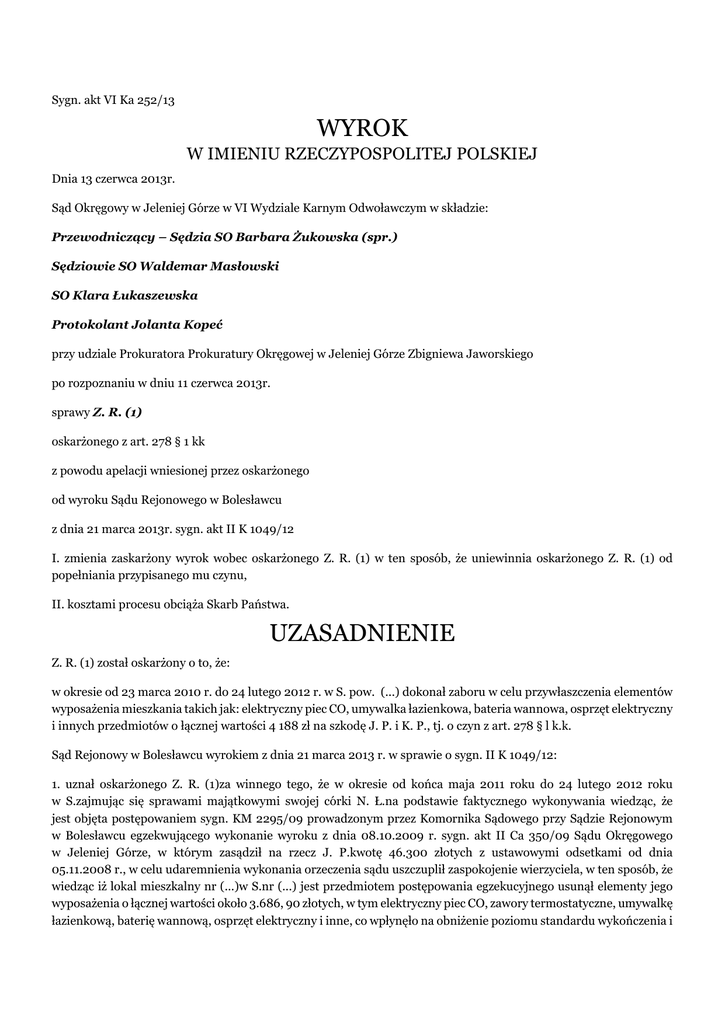 Sygn. akt VI Ka 252/13 WYROK W IMIENIU RZECZYPOSPOLITEJ POLSKIEJ Dnia 13 czerwca 2013r. Sąd Okręgowy w Jeleniej Górze w VI Wydziale Karnym Odwoławczym w składzie: Przewodniczący – Sędzia SO Barbara Żukowska (spr.) Sędziowie SO Waldemar Masłowski SO Klara Łukaszewska Protokolant Jolanta Kopeć przy udziale Prokuratora Prokuratury Okręgowej w Jeleniej Górze Zbigniewa Jaworskiego po rozpoznaniu w dniu 11 czerwca 2013r. sprawy Z. R. (1) oskarżonego z art. 278 § 1 kk z powodu apelacji wniesionej przez oskarżonego od wyroku Sądu Rejonowego w Bolesławcu z dnia 21 marca 2013r. sygn. akt II K 1049/12 I. zmienia zaskarżony wyrok wobec oskarżonego Z. R. (1) w ten sposób, że uniewinnia oskarżonego Z. R. (1) od popełniania przypisanego mu czynu, II. kosztami procesu obciąża Skarb Państwa. UZASADNIENIE Z. R. (1) został oskarżony o to, że: w okresie od 23 marca 2010 r. do 24 lutego 2012 r. w S. pow. (...) dokonał zaboru w celu przywłaszczenia elementów wyposażenia mieszkania takich jak: elektryczny piec CO, umywalka łazienkowa, bateria wannowa, osprzęt elektryczny i innych przedmiotów o łącznej wartości 4 188 zł na szkodę J. P. i K. P., tj. o czyn z art. 278 § l k.k. Sąd Rejonowy w Bolesławcu wyrokiem z dnia 21 marca 2013 r. w sprawie o sygn. II K 1049/12: 1. uznał oskarżonego Z. R. (1)za winnego tego, że w okresie od końca maja 2011 roku do 24 lutego 2012 roku w S.zajmując się sprawami majątkowymi swojej córki N. Ł.na podstawie faktycznego wykonywania wiedząc, że jest objęta postępowaniem sygn. KM 2295/09 prowadzonym przez Komornika Sądowego przy Sądzie Rejonowym w Bolesławcu egzekwującego wykonanie wyroku z dnia 08.10.2009 r. sygn. akt II Ca 350/09 Sądu Okręgowego w Jeleniej Górze, w którym zasądził na rzecz J. P.kwotę 46.300 złotych z ustawowymi odsetkami od dnia 05.11.2008 r., w celu udaremnienia wykonania orzeczenia sądu uszczuplił zaspokojenie wierzyciela, w ten sposób, że wiedząc iż lokal mieszkalny nr (...)w S.nr (...) jest przedmiotem postępowania egzekucyjnego usunął elementy jego wyposażenia o łącznej wartości około 3.686, 90 złotych, w tym elektryczny piec CO, zawory termostatyczne, umywalkę łazienkową, baterię wannową, osprzęt elektryczny i inne, co wpłynęło na obniżenie poziomu standardu wykończenia i funkcjonalności lokalu, a tym samym na obniżenie jego wartości rynkowej na szkodę J. P., na rzecz którego mieszkanie zostało przysądzone, stanowiącego przestępstwo z art. 300 § 2 k.k. i za to na podstawie art. 300 § 2 k.k. wymierzył mu karę 4 (czterech) miesięcy pozbawienia wolności, 2. na podstawie art. 69 § l i 2 k.k. i art. 70 § l pkt l k.k. wykonanie orzeczonej wobec oskarżonego kary pozbawienia wolności warunkowo zawiesił na okres próby 2 (dwóch) lat; 3. na podstawie art. 72 § 2 k.k. orzekł wobec oskarżonego obowiązek naprawienia szkody w całości poprzez uiszczenie kwoty 3.686,90 (trzy tysiące sześćset osiemdziesiąt sześć 90/100) złotych na rzecz J. P. i K. P. w terminie 6 (sześciu) miesięcy licząc od uprawomocnienia się wyroku; 4. zasądził od oskarżonego na rzecz oskarżycieli posiłkowych J. P. i K. P. kwotę 420 (czterysta dwadzieścia) złotych tytułem kosztów ustanowionego pełnomocnika w sprawie, 5. na podstawie art. 627 k.p.k. zasądził od oskarżonego na rzecz Skarbu Państwa koszty sądowe i na podstawie art. 2 ust. l pkt 2 ustawy z dnia 23 czerwca 1973 r. o opłatach w sprawach karnych wymierzył mu opłatę w kwocie 120 (sto dwadzieścia) złotych. Powyższy wyrok zaskarżył w całości oskarżony, kwestionując w osobiście złożonej apelacji przypisanie mu sprawstwa i winy inkryminowanego czynu. Wskazał na błędnie przeprowadzone postępowanie dowodowe, brak obciążających go dowodów w postaci dokumentacji zdjęciowej wykonanej podczas przeszukania oraz nieprawidłową ocenę dowodów w postaci zeznań J. P. i wyjaśnień oskarżonego. Skarżący zarzucił także, iż prawomocny wyrok w sprawie cywilnej został wydany w wyniku oszustwa pełnomocnika powoda i nie powinien być uwzględniony. Skarżący nie postawił wniosków apelacyjnych, lecz z treści złożonego środka zaskarżenia wynika, że domaga się on zmiany zaskarżonego wyroku poprzez uniewinnienie Z. R. (1) od popełnienia przypisanego mu czynu. Sąd Okręgowy zważył, co następuje: Apelacja wniesiona przez oskarżonego spowodować musiała zmianę zaskarżonego wyroku. Wobec wniesienia środka zaskarżenia wyłącznie na korzyść oskarżonego, koniecznym było uniewinnienie oskarżonego od popełnienia przypisanego mu czynu opisanego w części dyspozytywnej wyroku. Skoro prokurator złożony środek odwoławczy cofnął (a nadto był on skierowany wyłącznie przeciwko rozstrzygnięciu o karze), niemożliwe było rozstrzygniecie dla oskarżonego niekorzystne w stosunku do treści wyroku Sądu I instancji i jego pisemnego uzasadnienia. Jakkolwiek Sąd Rejonowy przeprowadził wszystkie istotne dla wszechstronnego wyjaśnienia sprawy dowody, dokonując ich pogłębionej analizy i dochodząc na tej podstawie do w przeważającej mierze zgodnych z prawdą ustaleń faktycznych, nie był uzasadniony wniosek, że zarzucane Z. R. (1) zachowanie należało zakwalifikować jako czyn spełniający znamiona występku z art. 300 § 2 k.k. Sąd I instancji niezasadnie przyjął, że czyn przypisany oskarżonemu wyczerpuje znamiona czynu zabronionego stypizowanego w tym przepisie. Sąd Okręgowy na wstępie jednakże wskazuje, że niesłuszne są postawione w apelacji zarzuty dotyczące naruszeń prawa procesowego i błędnego procedowania w zakresie zbierania i oceny dowodów. Sąd Rejonowy przeprowadził w niniejszej sprawie prawidłowe postępowanie, nie dopuszczając się mogącej mieć wpływ na treść wyroku podniesionej w apelacji oskarżonego obrazy przepisów postępowania regulujących zasady oceny dowodów, w szczególności art. 7 k.p.k. Przepis ten stanowi, ż