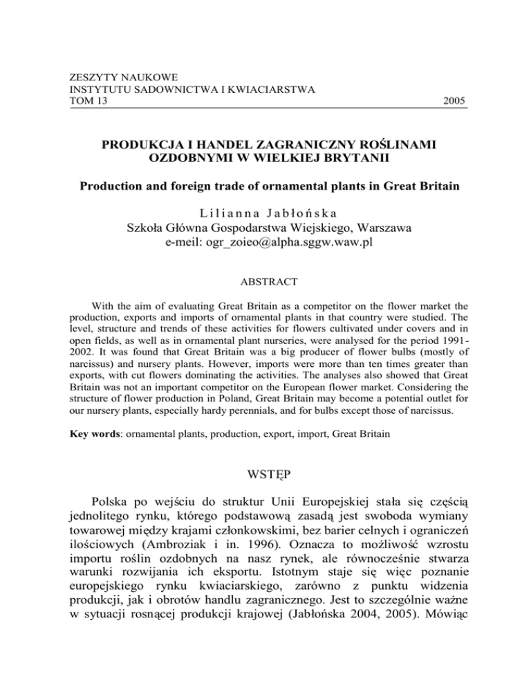 ZESZYTY NAUKOWE INSTYTUTU SADOWNICTWA I KWIACIARSTWA TOM 13 2005 PRODUKCJA I HANDEL ZAGRANICZNY ROŚLINAMI OZDOBNYMI W WIELKIEJ BRYTANII Production and foreign trade of ornamental plants in Great Britain Lilianna Jabł o ńs k a Szkoł a Gł ówna Gospodarstwa Wiejskiego, Warszawa e-meil: [email protected] ABSTRACT With the aim of evaluating Great Britain as a competitor on the flower market the production, exports and imports of ornamental plants in that country were studied. The level, structure and trends of these activities for flowers cultivated under covers and in open fields, as well as in ornamental plant nurseries, were analysed for the period 19912002. It was found that Great Britain was a big producer of flower bulbs (mostly of narcissus) and nursery plants. However, imports were more than ten times greater than exports, with cut flowers dominating the activities. The analyses also showed that Great Britain was not an important competitor on the European flower market. Considering the structure of flower production in Poland, Great Britain may become a potential outlet for our nursery plants, especially hardy perennials, and for bulbs except those of narcissus. Key words: ornamental plants, production, export, import, Great Britain WSTĘP Polska po wejś ciu do struktur Unii Europejskiej stał a sięczę ś cią jednolitego rynku, którego podstawowązasadąjest swoboda wymiany towarowej mię dzy krajami czł onkowskimi, bez barier celnych i ograniczeń iloś ciowych (Ambroziak i in. 1996). Oznacza to moż liwoś ćwzrostu importu roś lin ozdobnych na nasz rynek, ale równocześ nie stwarza warunki rozwijania ich eksportu. Istotnym staje się więc poznanie europejskiego rynku kwiaciarskiego, zarówno z punktu widzenia produkcji, jak i obrotów handlu zagranicznego. Jest to szczególnie waż ne w sytuacji rosną cej produkcji krajowej (Jabł ońska 2004, 2005). Mówią c Rynek roś lin ozdobnych w Wielkiej Brytanii o europejskim rynku roś lin ozdobnych, wymienia sięprzede wszystkim takie kraje, jak Holandia, Wł ochy czy Hiszpania, będą ce najwię kszymi producentami i eksporterami, oraz Niemcy przodują ce w imporcie. Zapomina sięnatomiast o takim dużym producencie jak Wielka Brytania (Jabł ońska 1999, Janiszewska 1999, Jabł ońska 2003, Marosz 2004). Stą d też w niniejszej pracy dokonano dł ugookresowej analizy produkcji i handlu zagranicznego roś linami ozdobnymi w tym kraju, pozwalają cej na wstę pnąjego ocenęjako ewentualnego konkurenta i rynku zbytu dla polskiej produkcji. Dokonanie peł nej oceny wymaga dodatkowo przeprowadzenia badań wielkoś ci popytu i preferencji angielskich konsumentów, co był o niestety niemożliwe z powodu braku dostę pnych informacji. MATERIAŁI METODY W pracy analizowano wielkoś ći strukturęprodukcji roś lin ozdobnych oraz wielkoś ć i strukturę ich eksportu i importu, a także zmiany zachodzą ce w powyższych zjawiskach w latach 1991-2002. Badaniami obję to trzy dział y kwiaciarstwa: kwiaty cię te i roś liny doniczkowe spod osł on, produkcję kwiaciarską w gruncie oraz ozdobny materiał szkół karski. Kierunek i dynamikęzmian okreś lono za pomocąlinii tendencji liczonej metodąnajmniejszych kwadratów. Ze wzglę du na brak czę ś ci danych dotyczą cych importu materiał u szkół karskiego w latach 2001-2002, linie tendencji dla poszczególnych grup roś lin szkół karskich wyznaczono dla lat 1991-2000. Zmiany w strukturze produkcji i strukturze handlu zagranicznego analizowano na podstawie ś rednich wielkoś ci wyznaczonych dla okresów 3-letnich, tzn. lat 1991-93, 1995-97 i 2000-02, przy czym analizy struktury produkcji polowej oraz materiał u szkół karskiego odnosząsięjedynie do produkcji Walii i Anglii, stanowiącej okoł o 90% cał ej brytyjskiej produkcji i z tego wzglę du objętej szczegół owąinformacjąstatystyczną. Wszystkie analizy produkcji dotycząpowierzchni upraw, z wyją tkiem poszczególnych grup roś lin doniczkowych, których produkcja rejestrowana jest w sztukach. W analizie handlu zagranicznego kwiatami cię tymi uwzglę dniono gatunki wyszczególnione w scalonej nomenklaturze CN, w tym grupę„pozostał e”. Źródł em danych liczbowych wykorzystanych w analizach był y zamieszczone na stronach internetowych statystyki rzą dowe DEFRA (Department for Environment, Food and Rural Affairs), roczniki AIPH Rynek roś lin ozdobnych w Wielkiej Brytanii oraz prace magisterskie wykonane w Samodzielnej Pracowni Organizacji i Ekonomiki Ogrodnictwa SGGW. WYNIKI BADAŃ 1. Wielkoś ći kierunki zmian w produkcji roś lin ozdobnych Produkcja roś lin ozdobnych w Wielkiej Brytanii w latach 1991-2002 wykazuje tendencjęrosną cą . Powierzchnia ich upraw wzrastał a ś rednio rocznie o 197,8 ha, osią gają c w 2002 roku 16 698 ha (rys. 1). Niewielką rolęodgrywa w niej produkcja pod osł onami, która zajmuje jedynie okoł o 5% cał kowitego areał u upraw kwiaciarskich (tab. 1), choći tu odnotowano wzrost o 19,5 ha rocznie. Najwię ksze, rosną ce znaczenie ma produkcja szkół karskiego materiał u ozdobnego. Udziałszkół ek w cał kowitej powierzchni kwiaciarskiej wynosiłw latach 1991-93 ś rednio 52,4%, a w latach 2000-2002 już54,4%. W okresie tym areałszkół ek, przy ś redniorocznym wzroś cie o 144,0 ha, zwię kszyłsięz 7102 do 9028 ha. Niewielką tendencję rosną cą wykazuje także powierzchnia upraw kwiaciarskich w gruncie. Rocznie wzrastał a ona ś rednio o 34,28 ha. Pomimo wzrostu powierzchni z 5824 ha w latach 1991-93 do 6264 ha w latach 2000-02, jej udziałw cał kowitym areale obniżyłsięz 41,7 do 39,4%. Rys. 1. Poziom i tendencje zmian powierzchni (w ha) z produkcjąroś lin ozdobnych Level and trends of acreage (in ha) with ornamental plants production 18000 y = 197,81x + 13431 16000 14000 ha 12000 10000 y = 144,03x + 6944,3 8000 y = 34,276x + 5668,6 6000 4000 y = 19,5x + 817,83 2000 powierzchnia ogół emtotal acreage pod osł onami-under cover 0 91 92