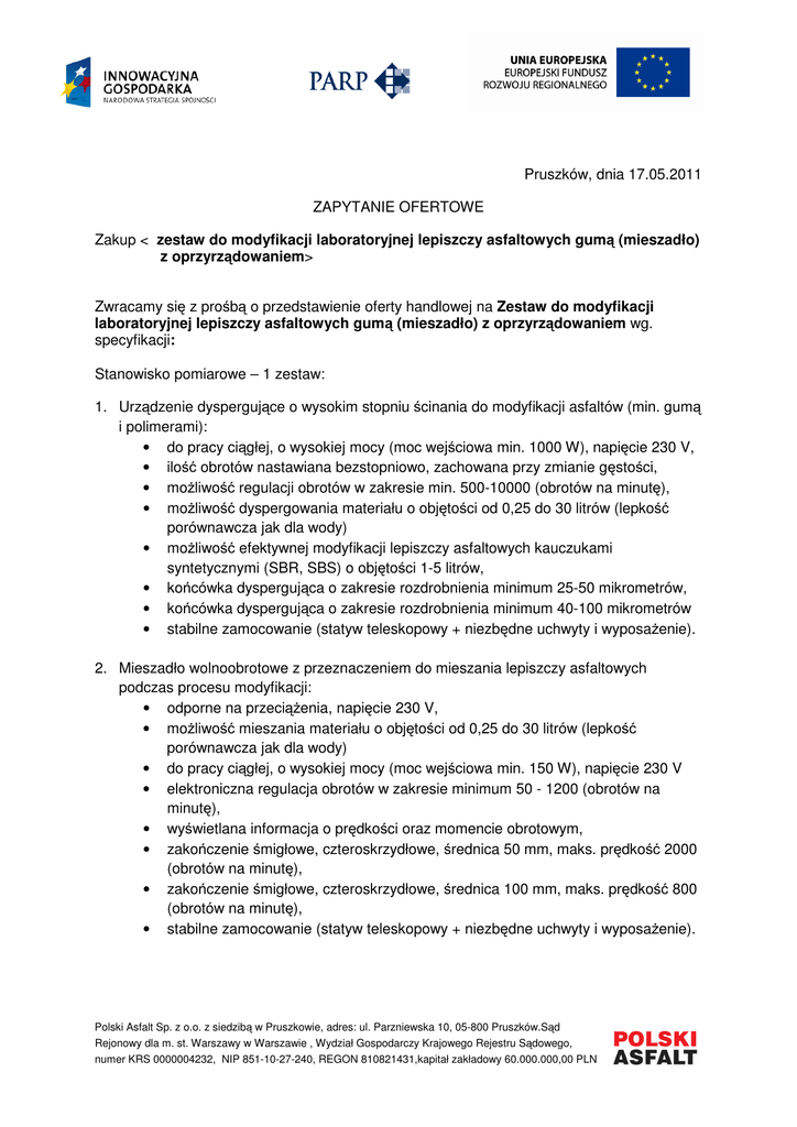 Pruszków, dnia 17.05.2011 ZAPYTANIE OFERTOWE Zakup < zestaw do modyfikacji laboratoryjnej lepiszczy asfaltowych gumą (mieszadło) z oprzyrządowaniem> Zwracamy się z prośbą o przedstawienie oferty handlowej na Zestaw do modyfikacji laboratoryjnej lepiszczy asfaltowych gumą (mieszadło) z oprzyrządowaniem wg. specyfikacji: Stanowisko pomiarowe – 1 zestaw: 1. Urządzenie dyspergujące o wysokim stopniu ścinania do modyfikacji asfaltów (min. gumą i polimerami): • do pracy ciągłej, o wysokiej mocy (moc wejściowa min. 1000 W), napięcie 230 V, • ilość obrotów nastawiana bezstopniowo, zachowana przy zmianie gęstości, • możliwość regulacji obrotów w zakresie min. 500-10000 (obrotów na minutę), • możliwość dyspergowania materiału o objętości od 0,25 do 30 litrów (lepkość porównawcza jak dla wody) • możliwość efektywnej modyfikacji lepiszczy asfaltowych kauczukami syntetycznymi (SBR, SBS) o objętości 1-5 litrów, • końcówka dyspergująca o zakresie rozdrobnienia minimum 25-50 mikrometrów, • końcówka dyspergująca o zakresie rozdrobnienia minimum 40-100 mikrometrów • stabilne zamocowanie (statyw teleskopowy + niezbędne uchwyty i wyposażenie). 2. Mieszadło wolnoobrotowe z przeznaczeniem do mieszania lepiszczy asfaltowych podczas procesu modyfikacji: • odporne na przeciążenia, napięcie 230 V, • możliwość mieszania materiału o objętości od 0,25 do 30 litrów (lepkość porównawcza jak dla wody) • do pracy ciągłej, o wysokiej mocy (moc wejściowa min. 150 W), napięcie 230 V • elektroniczna regulacja obrotów w zakresie minimum 50 - 1200 (obrotów na minutę), • wyświetlana informacja o prędkości oraz momencie obrotowym, • zakończenie śmigłowe, czteroskrzydłowe, średnica 50 mm, maks. prędkość 2000 (obrotów na minutę), • zakończenie śmigłowe, czteroskrzydłowe, średnica 100 mm, maks. prędkość 800 (obrotów na minutę), • stabilne zamocowanie (statyw teleskopowy + niezbędne uchwyty i wyposażenie). Polski Asfalt Sp. z o.o. z siedzibą w Pruszkowie, adres: ul. Parzniewska 10, 05-800 Pruszków.Sąd Rejonowy dla m. st. Warszawy w Warszawie , Wydział Gospodarczy Krajowego Rejestru Sądowego, numer KRS 0000004232, NIP 851-10-27-240, REGON 810821431,kapitał zakładowy 60.000.000,00 PLN 3. Naczynia ze stali niklowo-chromowej do modyfikacji lepiszczy asfaltowych o pojemnościach: • 1000 ml – 2 sztuki, ϕ100 mm, wys. 130 mm, • 2000 ml – 2 sztuki, ϕ120 mm, wys. 180 mm, • 5000 ml – 2 sztuki, ϕ180 mm, wys. 210 mm, • Stabilne zamocowania naczyń do modyfikacji (do każdego oddzielne o innej średnicy), niezbędne mufy i uchwyt napinający do bezpiecznego zamocowania naczyń na płycie grzewczej. 4. Płyta grzewcza z oprzyrządowaniem • do podgrzewania naczyń w zakresie temperatury min. 50-300°C, • moc grzewcza min. 1500 W, napięcie 230 V, • wymiary płyty grzewczej min. 250 x 250 mm, • odporne na działanie środków chemicznych, • wyposażona w wyświetlacz cyfrowy wskazujący parametry nagrzania, • możliwość połączenia płyty grzewczej z termometrem zewnętrznym i sondą zanurzeniową w lepiszczu asfaltowym, • termometr z możliwością bezpośredniej kontroli i sterowania temperaturą płyty grzewczej, • zakres pomiarowy termometru min. od -50°C do +300°C, • maksymalna głębokość zanurzenia termometru 200 mm, • dokładność pomiaru temperatury termometru min. ±0,2°C • stabilne zamocowanie termometru i sondy do statywu. Warunki dostawy i serwisu Urządzenia zostaną dostarczone i zainstalowane pod wskazany przez zamawiającego adres na terenie miasta Pruszkowa/Warszawy. Termin dostawy nastąpi w nieprzekraczalnym terminie 4 tygodni od podpisania umowy. Oferent zapewni 24 miesięczny serwis gwarancyjny. Oferent prowadzi i posiada własny dział serwisowy na terenie Polski i czas reakcji serwisu wynosi 24 godziny w miejscu instalacji urządzenia. Oferent zapewni serwis pogwarancyjny oferowanych urządzeń. Tytuł projektu: Opracowanie i wdrożenie innowacyjnej, przyjaznej środowisku technologii modyfikacji asfaltów drogowych gumą. Umowa o dofinansowanie nr: UDA-POIG.01.04.00-14-188/09-00 UDA-POIG.04.01.00-14188/09-00 Polski Asfalt Sp. z o.o. z siedzibą w Pruszkowie, adres: ul. Parzniewska 10, 05-800 Pruszków.Sąd Rejonowy dla m. st. Warszawy w Warszawie , Wydział Gospodarczy Krajowego Rejestru Sądowego, numer KRS 0000004232, NIP 851-10-27-240, REGON 810821431,kapitał zakładowy 60.000.000,00 PLN Dofinansowanego ze środków Unii Europejskiej w ramach: Program Operacyjny: Innowacyjna Gospodarka 2007-2013 Oś priorytetowa: I Badania i rozwój nowoczesnych technologii Działanie: 1.4. Wsparcie projektów celowych Konkurs realizowany na podstawie przepisów rozporządzenia Ministra Rozwoju Regionalnego z dn. 7 kwietnia 2008 r. w sprawie udzielania przez Polską Agencję Rozwoju Przedsiębiorczości pomocy finansowej w ramach Programu Operacyjnego Innowacyjna Gospodarka. 2007-2013. Oferta musi zawierać: 1) Dane oferenta a. Pełną nazwę oraz adres pocztowy b. Numer wpisu do KRS lub innego właściwego rejestru (z podaniem rejestru) c. Adres poczty elektronicznej oraz numer telefonu osoby kontaktowej 2) Datę sporządzenia oraz ważność oferty 3) Cenę całkowitą netto i brutto 4) Warunki i termin płatności 5) Maksymalny czas dostarczenia zamówienia 6) Informacje o doświadczeniu 7) Informację o formie i zakresie serwisu gwarancyjnego oraz pogwarancyjnego 8) Posiadane referencje (w formie listy: nazwa przedsiębiorstwa, osoba kontaktowa, numer telefonu) 9) Podpis (w tym elektroniczny) osoby lub osób upoważnionych do reprezentowania oferenta. Zamawiający zastrzega z niniejszym zapytaniem. sobie prawo nierozpatrywania ofert złożonych Wybór najkorzystniejszej oferty nastąpi w oparciu o następujące kryteria: Polski Asfalt Sp. z o.o. z siedzibą w Pruszkowie, adres: ul. Parzniewska 10, 05-800 Pruszków.Sąd Rejonowy dla m. st. Warsza