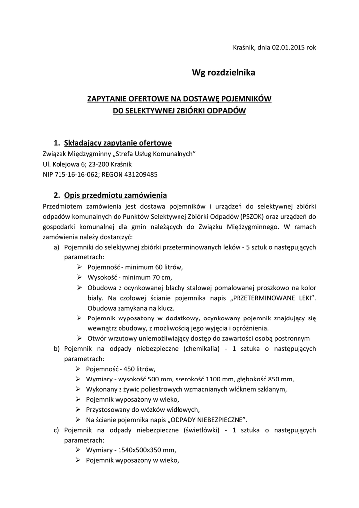 Kraśnik, dnia 02.01.2015 rok Wg rozdzielnika ZAPYTANIE OFERTOWE NA DOSTAWĘ POJEMNIKÓW DO SELEKTYWNEJ ZBIÓRKI ODPADÓW 1. Składający zapytanie ofertowe Związek Międzygminny „Strefa Usług Komunalnych” Ul. Kolejowa 6; 23-200 Kraśnik NIP 715-16-16-062; REGON 431209485 2. Opis przedmiotu zamówienia Przedmiotem zamówienia jest dostawa pojemników i urządzeń do selektywnej zbiórki odpadów komunalnych do Punktów Selektywnej Zbiórki Odpadów (PSZOK) oraz urządzeń do gospodarki komunalnej dla gmin należących do Związku Międzygminnego. W ramach zamówienia należy dostarczyć: a) Pojemniki do selektywnej zbiórki przeterminowanych leków - 5 sztuk o następujących parametrach: Pojemność - minimum 60 litrów, Wysokość - minimum 70 cm, Obudowa z ocynkowanej blachy stalowej pomalowanej proszkowo na kolor biały. Na czołowej ścianie pojemnika napis „PRZETERMINOWANE LEKI”. Obudowa zamykana na klucz. Pojemnik wyposażony w dodatkowy, ocynkowany pojemnik znajdujący się wewnątrz obudowy, z możliwością jego wyjęcia i opróżnienia. Otwór wrzutowy uniemożliwiający dostęp do zawartości osobą postronnym b) Pojemnik na odpady niebezpieczne (chemikalia) - 1 sztuka o następujących parametrach: Pojemność - 450 litrów, Wymiary - wysokość 500 mm, szerokość 1100 mm, głębokość 850 mm, Wykonany z żywic poliestrowych wzmacnianych włóknem szklanym, Pojemnik wyposażony w wieko, Przystosowany do wózków widłowych, Na ścianie pojemnika napis „ODPADY NIEBEZPIECZNE”. c) Pojemnik na odpady niebezpieczne (świetlówki) - 1 sztuka o następujących parametrach: Wymiary - 1540x500x350 mm, Pojemnik wyposażony w wieko, d) e) f) g) Przystosowany do wózków widłowych, Przystosowany do składowania w kilku warstwach. Na ścianie pojemnika napis „ODPADY NIEBEZPIECZNE”. Kontener stalowy, cynkowany ogniowo 1100 l - 5 sztuk o następujących parametrach: Pojemność - 1100 litrów, Wymiary - wysokość 1200 mm, szerokość 1060 mm, długość 1200 mm, Pokrywa półokrągła, której ciężar jest równoważony sprężynami, otwór spustowy, ułatwiający mycie, zamknięty nakrętką, mechanizm podtrzymujący półotwartą pokrywę, koła z możliwością pełnego obrotu, dwa koła hamowane, uchwyty do rozładunku, Kontener z tworzywa 1100 l - 5 sztuk o następujących parametrach: Pojemność - 1100 litrów, Wymiary - wysokość 1200 mm, szerokość 1060 mm, długość 1200 mm, Pokrywa półokrągła, koła z możliwością pełnego obrotu, dwa koła hamowane, uchwyty do rozładunku, Kontener KP7 otwarty - 3 sztuki o następujących parametrach: Pojemność - 7000 litrów, Wymiary - wysokość 1520 mm, szerokość 1770 mm, długość 3680 mm, Kontener z blachy stalowej: dno 3mm/ścianki 2mm, Kontener wzmacniany kształtownikami i tłoczeniami w ścianach, Kontener pomalowany farbami antykorozyjnymi na kolor zielony, Kontener przystosowany do transportu samochodami hakowymi i bramowymi, Kontener wyposażony w uchwytu umożliwiające zamocowanie plandeki, Tylna ściana kontenera wyposażona w drzwi dwudzielne, Kontener wyposażony w rolki jezdne. Kontener KP7 zamknięty - 1 sztuka o następujących parametrach: Pojemność - 7000 litrów, Wymiary - wysokość 1520 mm, szerokość 1770 mm, długość 3680 mm, Kontener z blachy stalowej: dno 3mm/ścianki 2mm, Kontener wzmacniany kształtownikami i tłoczeniami w ścianach, Kontener pomalowany farbami antykorozyjnymi na kolor zielony, Kontener przystosowany do transportu samochodami hakowymi i bramowymi, Tylna ściana kontenera wyposażona w drzwi dwudzielne, Kontener wyposażony w rolki jezdne. h) Kosz uliczny betonowy - 20 sztuk. Specyfikacja zgodnie z załącznikiem nr 1 do zapytania ofertowego o następujących parametrach: Materiał - beton odlewniczy piaskowany lub malowany Pojemność - 70 litrów, Szerokość - 43 cm, Długość - 46 cm, Wysokość - 80 cm, Ciężar - około 132 kg, Kolor do uzgodnienia po podpisaniu umowy, i) Wkłady betonowe do koszy ulicznych pasujących do kosza wymienionego w ust. 2 pkt. h). Stal ocynkowana z popielniczką - 40 sztuk j) Pojemnik na piasek - 5 sztuk o następujących parametrach: Pojemność - 150 kg, Długość - 86 cm, Wysokość - 81 cm, Głębokość - 74 cm, Materiał - polietylen, Pojemnik przystosowany do przewożenia na wózkach widłowych, Możliwość magazynowania w stosach zajmujących niewielką powierzchnię. k) Paleta wychwytująca pod 4 beczki - 1 sztuka o następujących parametrach: Materiał - polietylen, Pojemność - 240 l, Długość - 140 cm, Szerokość - 140 cm, Wysokość - 27 cm, l) Pojemniki na przepracowany olej - 2 sztuki o następujących parametrach: Pojemność - 200 litrów, Wymiary - wysokość 1250 mm, szerokość 760 mm, głębokość 760 mm, Konstrukcja dwupłaszczowa, Czujnik przecieku, Zabezpieczenie przeciwwypełnieniowe. Na ścianie pojemnika napis „PRZEPRACOWANY OLEJ” Termin wykonania zamówienia: 30 dni od dnia podpisania umowy, Okres gwarancji: Dla przedmiotu zamówienia określonego w punktach od a) do k) - 3 lata, Dla przedmiotu zamówienia określonego w punkcie l) - na szczelność 10 lat, na wyposarzenie 2 lata, Miejsce dostarczenia urządzeń do zbiórki odpadów: Miasto Kraśnik: • Kosz betonowy - 20 szt. • Wkłady betonowe - 40 szt. • Pojemnik na przeterminowane leki - 2 szt. Gmina Kraśnik: • Kontener KP-7 otwarty - 2 szt. • Pojemnik na przeterminowane leki - 1 szt. Gmina Niedrzwica Duża: • Pojemnik na przeterminowane leki - 1 szt. • Kontener z tworzywa 1100 l - 3 szt. • Wanna pod pojemniki do olejów i chemikaliów - 1 szt. Gmina Zakrzówek: • pojemniki na przepracowany olej - 1 szt. • pojemnik na odpady niebezpieczne (chemikalia) - 1 szt. • pojemnik na odpady niebezpieczne (świetlówki) - 1 szt. • pojemnik na przeterminowane leki - 1 szt. • kontener KP-7 zamknięty - 1 szt. Gmina Strzyżewice: • kontener KP 7 otwarty - 1 szt. • kontener stalowy, cynkowany ogniowo 1100 l - 2 sz