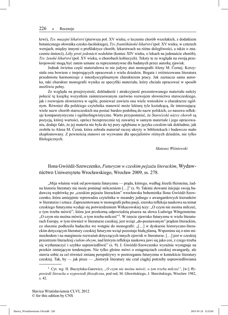 226 • Recenzje krwi), Tzv. muzejní lékařství (pierwsza poł. XV wieku, o leczeniu chorób wszelakich, z dodatkiem botanicznego słownika czesko-łacińskiego), Tzv. františkánské lékařství (poł. XV wieku, w czterech wersjach, między innymi o profilaktyce chorób, lekarstwach na różne dolegliwości, a także o znaczeniu śmierci), Léky proti jedenácti neduhům (koniec XIV wieku, o lekach na jedenaście chorób), Tzv. ženské lékařství (poł. XV wieku, o chorobach kobiecych). Teksty te ze względu na swoją przekrojowość mogą być zatem uznane za reprezentatywne dla badanych przez autorkę zjawisk. Jednak świetna część materiałowa to nie jedyny atut monografii Aleny M. Černej. Korzystała ona bowiem z inspirujących opracowań z wielu dziedzin. Bogata i zróżnicowana literatura przedmiotu harmonizuje z interdyscyplinarnym charakterem pracy. Jak zaznacza sama autorka, taki charakter monografii wynika ze specyfiki materiału, który chciała opracować w sposób możliwie pełny. Ze względu na przejrzystość, dokładność i atrakcyjność prezentowanego materiału należy polecić tę książkę wszystkim zainteresowanym zarówno rozwojem słownictwa staroczeskiego, jak i rozwojem słownictwa w ogóle, ponieważ zawiera ona wiele wniosków o charakterze ogólnym. Również dla polskiego czytelnika stanowić może lekturę tyle kształcącą, ile interesującą: wiele nazw chorób staroczeskich ma postać bardzo podobną do nazw polskich, co nasuwa refleksje komparatystyczne i ogólnolingwistyczne. Warto przypomnieć, że Staročeské názvy chorob są pozycją, której wartości, oprócz bezsprzecznie tej zawartej w samym materiale i jego opracowaniu, dodaje fakt, że jej materia nie była do tej pory zgłębiana w języku czeskim tak dokładnie, jak zrobiła to Alena M. Černá, która zebrała materiał raczej ukryty w bibliotekach i badawczo mało eksploatowany. Z pewnością stanowi on wyzwanie dla specjalistów różnych dziedzin, nie tylko filologicznych. Mateusz Wiśniewski Ilona Gwóźdź-Szewczenko, Futuryzm w czeskim pejzażu literackim, Wydawnictwo Uniwersytetu Wrocławskiego, Wrocław 2009, ss. 278. „Mija właśnie wiek od powstania futuryzmu — prądu, którego, według Józefa Heisteina, żadna historia literatury nie może pominąć milczeniem […]” (s. 9). Takimi słowami inicjuje swoją badawczą wędrówkę po „czeskim pejzażu literackim” wrocławska bohemistka Ilona Gwóźdź-Szewczenko, która umiejętnie wprowadza czytelnika w meandry jednego z awangardowych kierunków w literaturze i sztuce. Zaprezentowana w monografii pełna pasji, szeroka refleksja naukowa na temat czeskiego futuryzmu wydaje się potwierdzeniem Witkacowskiej tezy: „O czym nie można milczeć, o tym trzeba mówić”, która jest przekorną odpowiedzią pisarza na słowa Ludwiga Wittgensteina: „O czym nie można mówić, o tym trzeba milczeć”1. W istocie zjawisko futuryzmu w wielu literaturach Europy, w tym również w literaturze czeskiej, jest wciąż „do-poznawanym” prądem literackim, co słusznie podkreśla badaczka we wstępie do monografii: „[…] w dyskursie historyczno-literackim dotyczącym literatury czeskiej futuryzm wciąż pozostaje białą plamą. Wspomina się o nim mimochodem i na marginesie rozważań dotyczących innych zjawisk w literaturze. […] jest w czeskiej przestrzeni literackiej ciałem obcym, nad którym refleksja naukowa jawi się jako coś, z czego trzeba się wytłumaczyć i szybko usprawiedliwić” (s. 9). I. Gwóźdź-Szewczenko wyraźnie występuje na przekór istniejącym tendencjom. Nie tylko głośno mówi o osiągnięciach czeskiej awangardy, ale stawia sobie za cel również zmianę perspektywy w postrzeganiu futuryzmu w kontekście literatury czeskiej. Tak, by — jak pisze — „historyk literatury nie czuł ciągłej potrzeby usprawiedliwiania 1 Cyt. wg: H. Buczyńska-Garewicz, „O czym nie można mówić, o tym trzeba milczeć”, [w:] Wypowiedź literacka a wypowiedź filozoficzna, pod red, M. Głowińskiego, J. Sławińskiego, Wrocław 1982, s. 42. Slavica Wratislaviensia CLVI, 2012 © for this edition by CNS Slavica_Wratislawiensia-156.indb 226 2013-05-24 12:32:01 Recenzje • 227 się z podjętego zagadnienia” (s. 10.). Zamierzony cel, mimo pewnych kłopotów, które wpisane są w pracę badacza zagranicznego podejmującego się badań materiałowych, został z powodzeniem osiągnięty. Należy zauważyć, że autorka koncentruje się przede wszystkim na źródłach. Umiejętnie i z rozwagą korzysta z prac omawiających zjawisko futuryzmu. Nie pomija ustaleń badaczy futuryzmu włoskiego, rosyjskiego, polskiego, chociaż właściwie odchodzi od analiz traktujących o wpływie tego prądu na literaturę czeską. Uznała bowiem, że powstałe do tej pory opracowania nader często zawierają wiele stereotypów i przesądów narosłych wokół wskazanego prądu literackiego. Zastosowana przez nią metoda nie uczyniła jednak pracy uboższą. Świadczy o tym trafny dobór tekstów, odpowiednia prezentacja najbardziej eksplikatywnych przykładów oraz bardzo bogata bibliografia (kilkaset pozycji!), która stanowi dodatkowy, niezaprzeczalny walor publikacji. Monografia podzielona została na cztery części. W części pierwszej, która ma charakter wprowadzający do tematu, po krótkim wstępie Ilona Gwóźdź-Szewczenko przechodzi do rozważań opatrzonych fragmentem cytatu z Z. Mathausera: Není snadné psát o futurismu…Autorka kreśli tutaj historię problemu, po czym zastanawia się nad miejscem futuryzmu w literaturze czeskiej, nazywając omawiany prąd „niedocenionym komponentem czeskiego pejzażu literackiego” (s. 15). Zauważa bowiem, że choć futuryzm odgrywał istotną rolę w czeskiej przestrzeni kulturowej, to nie spotkał się z należytym zainteresowaniem literaturoznawców, którzy uznali go za artefakt powszechnie znany i nieistotny, dlatego często przemilczany. „W więk