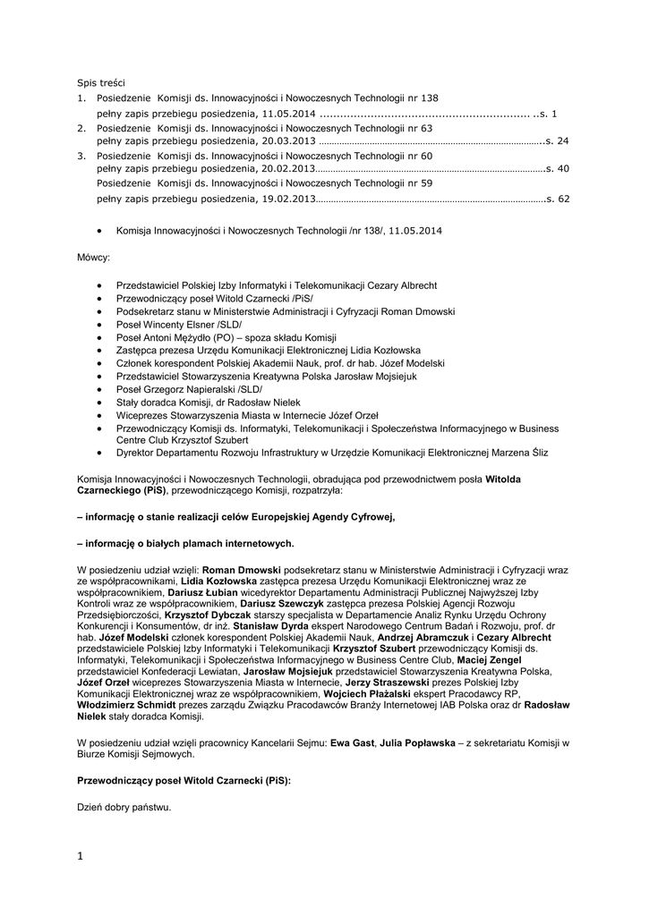 Spis treści 1. Posiedzenie Komisji ds. Innowacyjności i Nowoczesnych Technologii nr 138 pełny zapis przebiegu posiedzenia, 11.05.2014 .............................................................. .. s. 1 2. Posiedzenie Komisji ds. Innowacyjności i Nowoczesnych Technologii nr 63 pełny zapis przebiegu posiedzenia, 20.03.2013 ……………………………………………………………………………..s. 24 3. Posiedzenie Komisji ds. Innowacyjności i Nowoczesnych Technologii nr 60 pełny zapis przebiegu posiedzenia, 20.02.2013……………………………………………………………………………….s. 40 Posiedzenie Komisji ds. Innowacyjności i Nowoczesnych Technologii nr 59 pełny zapis przebiegu posiedzenia, 19.02.2013……………………………………………………………………………….s. 62 Komisja Innowacyjności i Nowoczesnych Technologii /nr 138/, 11.05.2014 Mówcy: Przedstawiciel Polskiej Izby Informatyki i Telekomunikacji Cezary Albrecht Przewodniczący poseł Witold Czarnecki /PiS/ Podsekretarz stanu w Ministerstwie Administracji i Cyfryzacji Roman Dmowski Poseł Wincenty Elsner /SLD/ Poseł Antoni Mężydło (PO) – spoza składu Komisji Zastępca prezesa Urzędu Komunikacji Elektronicznej Lidia Kozłowska Członek korespondent Polskiej Akademii Nauk, prof. dr hab. Józef Modelski Przedstawiciel Stowarzyszenia Kreatywna Polska Jarosław Mojsiejuk Poseł Grzegorz Napieralski /SLD/ Stały doradca Komisji, dr Radosław Nielek Wiceprezes Stowarzyszenia Miasta w Internecie Józef Orzeł Przewodniczący Komisji ds. Informatyki, Telekomunikacji i Społeczeństwa Informacyjnego w Business Centre Club Krzysztof Szubert Dyrektor Departamentu Rozwoju Infrastruktury w Urzędzie Komunikacji Elektronicznej Marzena Śliz Komisja Innowacyjności i Nowoczesnych Technologii, obradująca pod przewodnictwem posła Witolda Czarneckiego (PiS), przewodniczącego Komisji, rozpatrzyła: – informację o stanie realizacji celów Europejskiej Agendy Cyfrowej, – informację o białych plamach internetowych. W posiedzeniu udział wzięli: Roman Dmowski podsekretarz stanu w Ministerstwie Administracji i Cyfryzacji wraz ze współpracownikami, Lidia Kozłowska zastępca prezesa Urzędu Komunikacji Elektronicznej wraz ze współpracownikiem, Dariusz Łubian wicedyrektor Departamentu Administracji Publicznej Najwyższej Izby Kontroli wraz ze współpracownikiem, Dariusz Szewczyk zastępca prezesa Polskiej Agencji Rozwoju Przedsiębiorczości, Krzysztof Dybczak starszy specjalista w Departamencie Analiz Rynku Urzędu Ochrony Konkurencji i Konsumentów, dr inż. Stanisław Dyrda ekspert Narodowego Centrum Badań i Rozwoju, prof. dr hab. Józef Modelski członek korespondent Polskiej Akademii Nauk, Andrzej Abramczuk i Cezary Albrecht przedstawiciele Polskiej Izby Informatyki i Telekomunikacji Krzysztof Szubert przewodniczący Komisji ds. Informatyki, Telekomunikacji i Społeczeństwa Informacyjnego w Business Centre Club, Maciej Zengel przedstawiciel Konfederacji Lewiatan, Jarosław Mojsiejuk przedstawiciel Stowarzyszenia Kreatywna Polska, Józef Orzeł wiceprezes Stowarzyszenia Miasta w Internecie, Jerzy Straszewski prezes Polskiej Izby Komunikacji Elektronicznej wraz ze współpracownikiem, Wojciech Płażalski ekspert Pracodawcy RP, Włodzimierz Schmidt prezes zarządu Związku Pracodawców Branży Internetowej IAB Polska oraz dr Radosław Nielek stały doradca Komisji. W posiedzeniu udział wzięli pracownicy Kancelarii Sejmu: Ewa Gast, Julia Popławska – z sekretariatu Komisji w Biurze Komisji Sejmowych. Przewodniczący poseł Witold Czarnecki (PiS): Dzień dobry państwu. 1 Otwieram 138. posiedzenie Komisji Innowacyjności i Nowoczesnych Technologii. Witam serdecznie państwa posłów i zaproszonych gości. Stwierdzam kworum. Porządek dzisiejszego posiedzenia składa się z dwóch punktów. Punkt pierwszy to rozpatrzenie informacji o stanie realizacji celów Europejskiej Agendy Cyfrowej. Punkt drugi to rozpatrzenie informacji o białych plamach internetowych – referuje prezes Urzędu Komunikacji Elektronicznej. Powyższy porządek członkowie Komisji otrzymali. Czy są uwagi do porządku dziennego posiedzenia? Nie słyszę. Stwierdzam, że Komisja przyjęła porządek dzienny posiedzenia bez zmian. Zanim przystąpimy do realizacji porządku dziennego, proponuję, żeby państwo zreferowali tematy a po ich przedstawieniu rozpoczniemy wspólną dyskusję. Czy jest sprzeciw wobec takiego sposobu procedowania? Nie słyszę. Przystępujemy zatem do realizacji porządku dziennego. Proszę o zabranie głosu przedstawiciela Ministerstwa Administracji i Cyfryzacji, pana podsekretarza stanu Romana Dmowskiego. Proszę uprzejmie. Podsekretarz stanu w Ministerstwie Administracji i Cyfryzacji Roman Dmowski: Dziękuję bardzo, panie przewodniczący. Wysoka Komisjo, szanowni państwo, szczegółowe informacje zostały do państwa przekazane w materiałach przesłanych Komisji. Chcę w kilku miejscach przedstawić pewne uwagi do materiału. W Europejskiej Agendzie Cyfrowej wyznaczono określone cele ilościowe do realizacji na poziomie całej Unii Europejskiej. W założeniu mają one być miernikiem działań, które zostały zaplanowane w ramach tego programu. Zaznaczam, że zostały one wybrane właściwie i odniosły pożądany rezultat. Drugim celem mierników jest mobilizowanie do podejmowania dalszych działań w obszarze cyfryzacji. Trzeba sobie uświadomić, że Europejska Agenda Cyfrowa była przyjmowana dla całej Unii Europejskiej, natomiast państwa Wspólnoty stoją na zróżnicowanym poziomie rozwoju. Tak to jest, że dla części z nich realizacja zadań agendy jest prostsza a dla innych, osiągnięcie zakładanych wskaźników to duże wyzwanie. Jest to wyzwaniem również dla naszego kraju. Jest to spowodowane niskim poziomem bazowym, notowanym w momencie przyjęcia agendy cyfrowej. Jeżeli chodzi o realizację Europejskiej Agendy Cyfrowej na