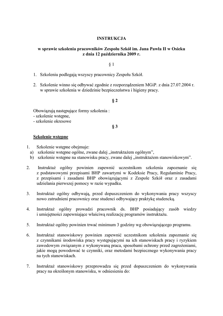 INSTRUKCJA w sprawie szkolenia pracowników Zespołu Szkół im