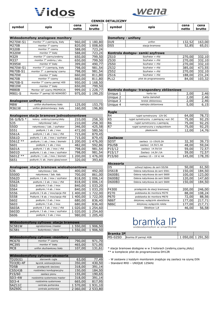 symbol opis cena netto CENNIK DETALICZNY cena symbol brutto Wideodomofony analogowe monitory monitor 7” z pamięcią, biały M270W-S1 monitor 7” czarny M270B monitor 7” czarny M320B monitor 7” biały M320W monitor 7” czarny/srebrny M329 monitor 7” srebrny / alu. M337 monitor 4” biały M395W monitor 7” z pamięcią, biały M670W-S1 monitor 7” z pamięcią/ czarny M670B-S1 monitor 7” biały M670W monitor 7” czarny M670B monitor 7” czarny pamięć 400 M670B-S monitor 7” biały M810W Monitor 10” czarny PROMOCJA M880B Monitor 7” pamięć SD NOWOŚĆ! M901-S 960,00 820,00 588,00 588,00 650,00 650,00 399,00 798,00 798,00 660,00 660,00 950,00 650,00 999,00 975,00 1 180,80 1 008,60 723,24 723,24 799,50 799,50 490,77 981,54 981,54 811,80 811,80 1 168,50 799,50 1 228,77 1 199,25 Analogowe unifony unifon słuchawkowy biały M8W unifon głośnomówiący biały M361W 125,00 160,00 153,75 196,80 Analogowe stacje bramowe jednoabonentowe kolory: srebrny/czarny/złoty S6 G/B/S * 210,00 258,30 natynkowa/ 1ab./ S35 210,00 258,30 natynkowa / 1ab. / szyfrator S50D 346,00 425,58 podtynk / 1 ab. / inox S551 472,00 580,56 podtynk / 1 ab. / inox / rfid S561A 715,00 879,45 podtynk / 1 ab. / inox / szyfrator S561D 715,00 879,45 podtynk / 1 ab. / inox / biometr S561Z ** 1 200,00 1 476,00 podtynk / 1 ab. / inox S601 482,00 592,86 podtynk / 1 ab. / inox / rfid S601A 798,00 981,54 podtynk / 1 ab. / inox / szyfrator S601D 798,00 981,54 podtynk / 1 ab. / inox / biometr S601Z ** 1 200,00 1 476,00 podtynk /1 ab. /nano glass/wewn S651 320,00 393,60 Analogowe stacje bramowe wieloabonentowe natynkowa / 2ab. S36 400,00 natynkowa / 3ab. 6ab. S500D 700,00 podtynk / 2 ab. / inox / szyfrator S562D 818,00 podtynk / 2 ab. / inox / rfid S562A 818,00 podtynk / 3 ab. / inox S563 840,00 podtynk / 4 ab. / inox S564 840,00 podtynk / 6 ab. / inox/opcja rfid S556 1 400,00 Podtynk / 8 ab. / inox/opcja rfid S558 1 400,00 podtynk / 2 ab. / inox S602 680,00 podtynk / 3 ab. / inox S603 680,00 podtynk / 3 ab. / inox / rfid S603A 1 020,00 podtynk / 3 ab. / inox / szyfrator S603D 1 020,00 podtynk / 3 ab. / inox S606 980,00 492,00 861,00 1 006,14 1 006,14 1 033,20 1 033,20 1 722,00 1 722,00 836,40 836,40 1 254,60 1 254,60 1 205,40 Wideodomofony cyfrowe stacje bramowe ogrodzeniowa /master SC581W 1 550,00 budynkowa / slave SC581 1 550,00 1 906,50 1 906,50 opis Domofony - unifony DU9 DS5 unifon stacja bramowa Kontrola dostępu- zamki szyfrowe Szyfrator + rfid ZS10 Szyfrator + rfid ZS30 Szyfrator + rfid ZS50 Szyfrator + rfid ZS32 Szyfrator + rfid ZS52 Szyfrator + rfid ZS16 pilot do programowania PL12 Kontrola dostępu- transpondery zbliżeniowe karta iso Unique 1 karta clamshell Unique 2 brelok zbliżeniowy Unique 3 naklejka zbliżeniowa Unique 4 Rygle R4 R5 R6 R7 rygiel symetryczny 12V DC rygiel symetryczny z pamięcią i wył. DC rygiel symetryczny z pamięcią rygiel symetryczny z wyłącznikiem płaskownik Zasilacze SD5T PSU5B P15/12 P15/17 P15/60 Akcesoria D5 D561B D600B1 D600B2 D600B3 F4300 P270 P670 N86T N86C zasilacz 11-15V/0.2A zasilacz 14.5V/1.4A zasilacz 14.5V/1A Zasilacz 14,5V /1A zasilacz 15 – 19 V/ 4A uchwyt kątowy do serii S5/S6 Osłona natynkowa do serii S561 Osłona natynkowa do serii S600 Osłona natynkowa do serii S600 Osłona natynkowa do serii S600 przełącznik do stacji bramowej podstawka do monitora M270 podstawka do monitora M670 dotykowy wyłącznik oświetlenia dotykowy wyłącznik roleta Obiektyw 1,8 Bramka IP MS-02SD Bramka IP pamięć 4GB Wideodomofony cyfrowe -monitory monitor 7” czarny MC670 monitor 4” biały MC395 unifon słuchawkowy biały MC8 790,00 465,00 107,00 971,70 571,95 131,61 Wideodomofony cyfrowe-akcesoria sterownik rygla TD20(G) łącznik wielowejściowy TD3(B)-4F przełącznik sieciowy TD5B rozdzielacz kondygnacyjny CS5(4)B zasilacz pionu P15/60 rozdzielnia systemowa master SD3-4W rozdzielnia systemowa SD3-4 centrala portierska SAZ11C centrala portierska SAZ60C 63,00 350,00 318,00 150,00 155,00 318,00 665,00 1 570,00 2 060,00 77,49 430,50 391,14 184,50 190,65 391,14 817,95 1 931,10 2 533,80 cena netto cena brutto 132,52 52,85 163,00 65,01 270,00 270,00 270,00 385,00 270,00 188,00 84,00 332,10 332,10 332,10 473,55 332,10 231,24 103,32 2,00 2,00 2,00 5,00 2,46 2,46 2,46 6,15 64,00 75,00 75,00 75,00 12,00 78,72 92,25 92,25 92,25 14,76 32,30 48,00 59,00 59,00 145,00 39,73 59,04 72,57 72,57 178,35 50,00 150,00 100,00 120,00 150,00 61,50 184,50 123,00 147,60 184,50 200,00 88,00 72,00 177,00 177,00 46,00 246,00 108,24 88,56 217,71 217,71 56,58 1 050,00 1 291,50 * stacje bramowe dostępne w w 3 kolorach (srebrny,czarny,złoty) ** w komplecie pilot do programowania DH12R - W zestawie z każdym monitorem znajduje się zasilacz na szynę DIN - Standard RfiD – UNIQUE 125kHz