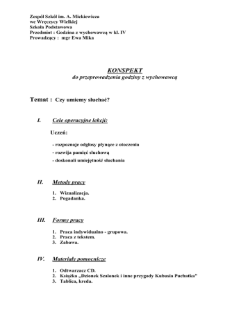 Zespół Szkół im. A. Mickiewicza we Wręczycy Wielkiej Szkoła Podstawowa Przedmiot : Godzina z wychowawcą w kl. IV Prowadzący : mgr Ewa Mika KONSPEKT do przeprowadzenia godziny z wychowawcą Temat : Czy umiemy słuchać? I. Cele operacyjne lekcji: Uczeń: - rozpoznaje odgłosy płynące z otoczenia - rozwija pamięć słuchową - doskonali umiejętność słuchania II. Metody pracy 1. Wizualizacja. 2. Pogadanka. III. Formy pracy 1. Praca indywidualno - grupowa. 2. Praca z tekstem. 3. Zabawa. IV. Materiały pomocnicze 1. Odtwarzacz CD. 2. Książka „Dzionek Szalonek i inne przygody Kubusia Puchatka” 3. Tablica, kreda. V. Przebieg lekcji. 1. Sprawy organizacyjne (5’). a) Sprawdzenie listy obecności. b) Omówienie spraw organizacyjno – wychowawczych. 2. Lekcja właściwa (40’). a) Rundka wstępna – wprowadzeniem do tematu lekcji. Uczniowie, siedząc w kręgu, kolejno odpowiadają na pytanie: Czy wolę słuchać, czy mówić? Jeżeli większość odpowie, że woli mówić to należy zapytać: Czy w takim razie umiecie słuchać? Taki jest dzisiejszy temat lekcji: Czy umiemy słuchać? Jeżeli odpowiedzą, że jednak wolą słuchać to należy zapytać: Czy umiecie dobrze słuchać i prawidłowo przekazywać informacje? Taki jest dzisiejszy temat lekcji: Czy umiemy słuchać? b) Wizualizacja. Uczniowie dalej siedzą w kręgu i słuchają odtwarzanej płyty CD- słuchają odgłosów przyrody. Na prośbę nauczyciela zamykają oczy i uważnie słuchają. Po zakończeniu odtwarzania odpowiadają na pytanie: Jakie odgłosy przyrody usłyszeli w kolejności występowania? Jak czuliście się podczas wizualizacji? c) Zabawa – „Głuchy telefon” Chętny uczeń wymyśla jedno krótkie zdanie, np. „Lubię pierogi z jagodami „ i mówi je na ucho koledze(koleżance) siedzącemu(-ej) obok. Osoba, która odebrała komunikat, przekazuje wiadomość dalej. Dziecko, które jako ostatnie pozna treść informacji, wypowiada ją głośno. Jeśli zdanie zostało zniekształcone, uczniowie ustalają, kto je usłyszał inaczej. d) Praca z tekstem – „Kubuś Puchatek” Cztery osoby wychodzą z Sali. Nauczyciel czyta pozostałym uczniom fragment „Kubusia Puchatka”; słuchający starają się dokładnie zapamiętać fabułę. Zadaniem ochotnika będzie opowiedzenie tekstu koledze, który jako pierwszy wejdzie do Sali. Tenże, wysłuchawszy relacji opowiadającego, przekaże zasłyszaną treść osobie, która wejdzie do Sali jako druga itd., aż ostatnia osoba powtórzy treść opowiadania. Pytania do uczniów: - Do jakich wniosków doszliście, słuchając kolejnych wersji opowiadania? - Co się stało z przekazywaną informacją? Ludzie jako nadawcy komunikatów przetwarzają informację, przekazując zasłyszane wiadomości, często je interpretują po swojemu , coś „od siebie” dodają. 3. Ewaluacja lekcji – Podsumowanie lekcji. Odwołując się do ćwiczeń przeprowadzonych na zajęciach, nauczyciel rozmawia z uczniami o umiejętności słuchania. - Czy wszystkich potraficie słuchać z taką samą uwagą? - Kiedy macie wrażenie, że ktoś Was słucha? - Kiedy słuchanie innych jest interesujące, a kiedy – nużące? Wyciągnięcie wniosków - Przekazywana z ust do ust wiadomość ulega deformacji. - Deformacja ta nie jest spowodowana umyślnym przekręceniem faktów przez wypowiadającego. - Każdy ma inną pamięć, sposób odczuwania i wyobraźnię. - Tak rodzi się plotka. - Nie można zatem powtarzać informacji gdzieś zasłyszanej i przekazanej poprzez kilku informatorów, którzy nie uczestniczyli w wydarzeniu. - Plotką można wyrządzić komuś ogromną krzywdę. Nauczmy się więc słuchać, dobrze słuchać i prawidłowo przekazywać informacje. Przekazywana z ust do ust wiadomość ulega deformacji. Deformacja ta nie jest spowodowana umyślnym przekręceniem faktów przez wypowiadającego. Każdy ma inną pamięć, sposób odczuwania i wyobraźnię. Tak rodzi się plotka. Nie można zatem powtarzać informacji gdzieś zasłyszanej i przekazanej poprzez kilku informatorów, którzy nie uczestniczyli w wydarzeniu. Plotką można wyrządzić komuś ogromną krzywdę. Nauczmy się więc słuchać, dobrze słuchać i prawidłowo przekazywać informacje.