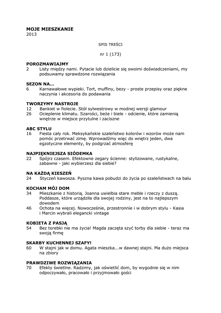 MOJE MIESZKANIE 2013 SPIS TREŚCI nr 1 (173) POROZMAWIAJMY 2 Listy między nami. Pytacie lub dzielicie się swoimi doświadczeniami, my podsuwamy sprawdzone rozwiązania SEZON NA... 6 Karnawałowe wypieki. Tort, muffiny, bezy - proste przepisy oraz piękne naczynia i akcesoria do podawania TWORZYMY NASTROJE 12 Bankiet w fiolecie. Stół sylwestrowy w modnej wersji glamour 26 Ocieplenie klimatu. Szarości, beże i biele - odcienie, które zamienią wnętrze w miejsce przytulne i zaciszne ABC STYLU 16 Fiesta cały rok. Meksykańskie szaleństwo kolorów i wzorów może nam pomóc przetrwać zimę. Wprowadźmy więc do wnętrz jeden, dwa egzotyczne elementy, by podgrzać atmosferę NAJPIĘKNIEJSZA SIÓDEMKA 22 Spójrz czasem. Efektowne zegary ścienne: stylizowane, rustykalne, zabawne - jaki wybierzesz dla siebie? NA KAŻDĄ KIESZEŃ 24 Styczeń kawosza. Pyszna kawa pobudzi do życia po szaleństwach na balu KOCHAM MÓJ DOM 34 Mieszkanie z historią. Joanna uwielbia stare meble i rzeczy z duszą. Poddasze, które urządziła dla swojej rodziny, jest na to najlepszym dowodem 46 Ochota na więcej. Nowocześnie, przestronnie i w dobrym stylu - Kasia i Marcin wybrali elegancki vintage KOBIETA Z PASJĄ 54 Bez torebki nie ma życia! Magda zaczęta szyć torby dla siebie - teraz ma swoją firmę SKARBY KUCHENNEJ SZAFY! 60 W stajni jak w domu. Agata mieszka...w dawnej stajni. Ma dużo miejsca na zbiory PRAWDZIWE ROZWIĄZANIA 70 Efekty świetlne. Radzimy, jak oświetlić dom, by wygodnie się w nim odpoczywało, pracowało i przyjmowało gości KLUB KOBIET Z PASJĄ 75 Blogowisko. Najpiękniejsze błogi wnętrzarskie - poznajcie ich autorki! WYBRALIŚMY DLA WAS 76 15 lamp podłogowych 82 20 konsoli i luster 90 16 płytek łazienkowych 92 4 kabiny prysznicowe DOBRE ZESTAWIENIA 84 Czysta biel. Łazienka zanurzona w bieli - piękna, przytulna, praktyczna PÓŁKA Z NOWOŚCIAMI 94 Ładnie i wygodnie …w domu dzięki przemyślanym zakupom DO ZOBACZENIA ZA MIESIĄC 96 Wyjątkowa noc. Karnawałowe party w domowym zaciszu - nakrycia w kwiaty nr 2 (174) POROZMAWIAJMY 2 Listy między nami. Pytacie lub dzielicie się swoimi doświadczeniami, my podsuwamy sprawdzone rozwiązania SEZON NA... 6 ...zimowe motywy w domu. Tatrzańskie, skandynawskie, szkockie - meble, tkaniny i naczynia, które rozgrzeją nas zimą ABC STYLU 12 Przez mgiełkę. Przydymione błękity, sprane szarości i beże oraz miks mebli stylizowanych i rustykalnych. Zobacz, jak niezwykły efekt dają we wnętrzach NAJPIĘKNIEJSZA TRZYNASTKA 18 Chleb nasz powszedni. Praktyczne i urokliwe pojemniki na pieczywo. Teraz możesz je śmiało trzymać na kuchennym blacie NA KAŻDĄ KIESZEŃ 20 Luty zakochanych. Śniadanie do łóżka? Świetny pomysł nie tylko w walentynki, zwłaszcza jeśli zastawa zachwyca KOCHAM MÓJ DOM 22 Szachownica ciepłych uczuć. Lidia urządziła rodzinny dom w bieli, czerni i szarości, ale przytulnie! Jak udało się jej osiągnąć taki efekt? 36 Z widokiem na morze. Mieszkanie w starej kamienicy w Sopocie zachwyca przestronnością i łącznością z naturą. To zasługa Magdy i jej męża Marcina KOBIETA Z PASJĄ 46 Folk moja miłość. Szmaciane broszki, filcowe torby, oryginalne naszyjniki Maria robiła najpierw z potrzeby serca, teraz stało się to jej sposobem na życie KLUB KOBIET Z PASJĄ 55 Blogowisko. W tym numerze matka i córka - dwie niezwykłe kobiety, które z zacięciem urządzają dom i gotują SKARBY KUCHENNEJ SZAFY 56 W starym, dobrym stylu. Ewa we współczesnym domu stworzyła klimat pełen nostalgii, dzięki wiekowym naczyniom i obrusom PRAWDZIWE ROZWIĄZANIA 68 Podłogi niezwykłe. Cegła, klinkier, cementowe płytki i korek sprawią, że każde wnętrze dizajnersko awansuje 80 Sprawy łóżkowe. Przepiękne sypialnie stworzone do odpoczynku i miłości DOBRE ZESTAWIENIA 72 Smakowite kolory. Kuchnie w barwach owoców - idealne nie tylko na zimę WYBRALIŚMY DLA WAS 78 12 wyjątkowych garnków 90 39 baterii, umywalek i dozowników MÓJ MAGICZNY DOM 84 Kochajmy się! Z racji walentynek zaczynamy od urządzania sypialni zgodnie z zasadami feng shui, by przyciągnąć spokój i miłość. Kolejne odcinki zależą od Was - piszcie do nas! TO JEST POMYSŁ! 86 Miejsce na wszystko. Myślisz, że twoja łazienka jest mała? Mamy na nią sposób - będzie wygodna i śliczna! ABY ŻYŁO SIĘ ŁATWIEJ 92 Ciepło właściwe. Praktyczne (i piękne) sposoby na rozgrzanie się zimą PÓŁKA Z NOWOŚCIAMI 94 Na nowo... zaaranżuj pokój czy łazienkę. Nowinki rynkowe ułatwią ci zadanie DO ZOBACZENIA ZA MIESIĄC 96 Czułe wspomnienia. Zabawa detalem, czyli jak wyczarować klimat retro w domu nr 3 (175) POROZMAWIAJMY 2 Listy między nami. Pytacie lub dzielicie się swoimi doświadczeniami, my podsuwamy sprawdzone rozwiązania SEZON NA... 6 ...błyskawiczną metamorfozę kuchni. Małe AGD oraz naczynia i fartuszki ozdobione energetycznymi barwami i wiosennymi motywami - śliczne! ABC STYLU 12 Indie zmysłowe. Dekoratorka wnętrz MM radzi, jakie elementy stylu indyjskiego można wykorzystać w naszych domach, by zyskały one na urodzie NAJPIĘKNIEJSZA PIĘTNASTKA 18 Cukierniczki pełne kalorii. Zupełnie wyjątkowe - na co dzień i od święta NA KAŻDĄ KIESZEŃ 20 Marcowe zmywanie. Zlew, zmywarka, suszarka, dozownik do płynu, ściereczki - efektownie zestawione KOBIETA Z PASJĄ 22 Mam artystyczną duszę. Olga wychowuje córeczkę, oczekuje przyjścia na świat drugiej i prowadzi dom oraz pisze, maluje, szyje. A wszystko robi na medal! KLUB KOBIET Z PASJĄ 35 Blogowisko. Niezwykłe dziewczyny, które ze swojego wnętrzarskiego hobby uczyniły sposób na życie KOCHAM MÓJ DOM 36 Szanuję przeszłość. Ponad stuletnia wrocławska kamienica i Marcin, który stworzył wysmakowane mieszkanie dla siebie i bliskiej osoby - warto podpatrzeć 48 Udana gra kontrastów. Maria urządziła dom z klasą, łącząc rzeczy nowe z przekazywanymi z pokolenia na pokolenie SKARBY KUCHENNEJ SZAFY 58 Słodko u Beaty. U niej w kuchni 