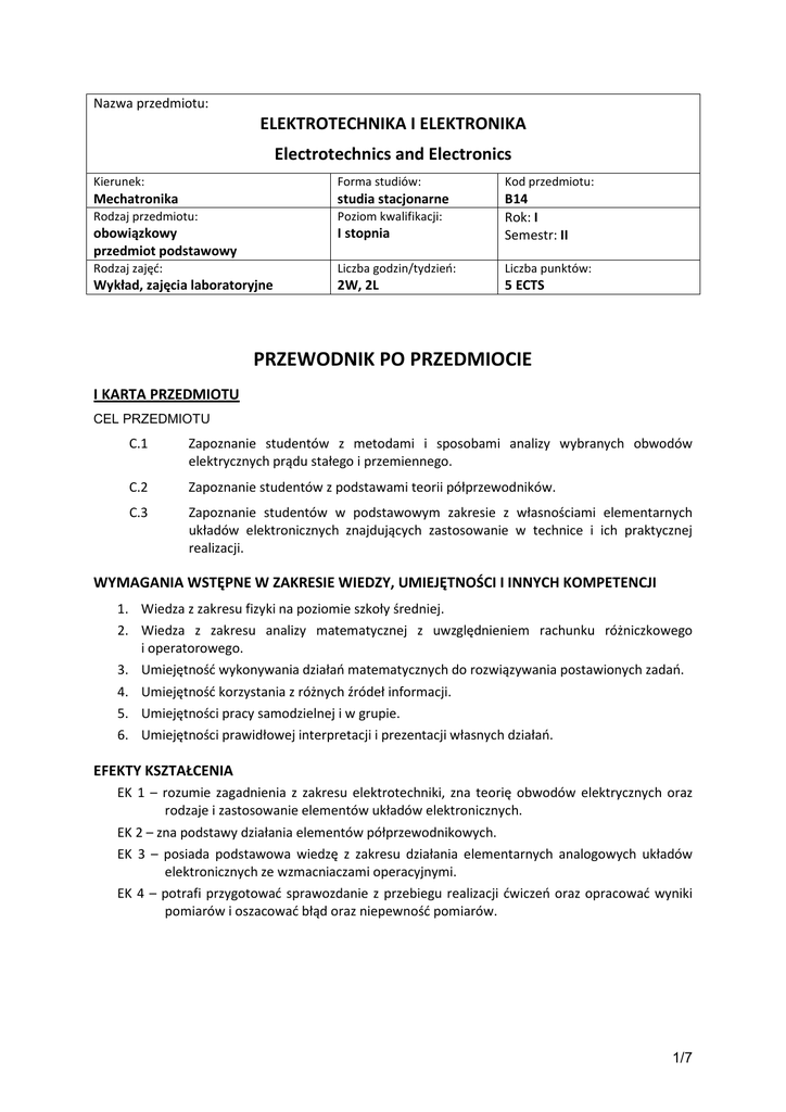 Nazwa przedmiotu: ELEKTROTECHNIKA I ELEKTRONIKA Electrotechnics and Electronics Kierunek: Forma studiów: Kod przedmiotu: Mechatronika studia stacjonarne Rodzaj przedmiotu: Poziom kwalifikacji: obowiązkowy przedmiot podstawowy I stopnia B14 Rok: I Semestr: II Rodzaj zajęć: Liczba godzin/tydzień: Liczba punktów: Wykład, zajęcia laboratoryjne 2W, 2L 5 ECTS PRZEWODNIK PO PRZEDMIOCIE I KARTA PRZEDMIOTU CEL PRZEDMIOTU C.1 Zapoznanie studentów z metodami i sposobami analizy wybranych obwodów elektrycznych prądu stałego i przemiennego. C.2 Zapoznanie studentów z podstawami teorii półprzewodników. C.3 Zapoznanie studentów w podstawowym zakresie z własnościami elementarnych układów elektronicznych znajdujących zastosowanie w technice i ich praktycznej realizacji. WYMAGANIA WSTĘPNE W ZAKRESIE WIEDZY, UMIEJĘTNOŚCI I INNYCH KOMPETENCJI 1. Wiedza z zakresu fizyki na poziomie szkoły średniej. 2. Wiedza z zakresu analizy matematycznej z uwzględnieniem rachunku różniczkowego i operatorowego. 3. Umiejętność wykonywania działań matematycznych do rozwiązywania postawionych zadań. 4. Umiejętność korzystania z różnych źródeł informacji. 5. Umiejętności pracy samodzielnej i w grupie. 6. Umiejętności prawidłowej interpretacji i prezentacji własnych działań. EFEKTY KSZTAŁCENIA EK 1 – rozumie zagadnienia z zakresu elektrotechniki, zna teorię obwodów elektrycznych oraz rodzaje i zastosowanie elementów układów elektronicznych. EK 2 – zna podstawy działania elementów półprzewodnikowych. EK 3 – posiada podstawowa wiedzę z zakresu działania elementarnych analogowych układów elektronicznych ze wzmacniaczami operacyjnymi. EK 4 – potrafi przygotować sprawozdanie z przebiegu realizacji ćwiczeń oraz opracować wyniki pomiarów i oszacować błąd oraz niepewność pomiarów. 1/7 TREŚCI PROGRAMOWE Forma zajęć – WYKŁADY W 1 - Podstawowe prawa obwodów elektrycznych. Podzespoły bierne i ich łączenie. W 2 – Elementy R, L, C. Analiza obwodów w stanie ustalonym przy wymuszeniu skokowym. W 3 – Elementy R, L, C. Analiza obwodów w stanie ustalonym przy wymuszeniu harmonicznym W 4 – Układy prądu przemiennego jedno i trójfazowego. Obwody ze sprzężeniami magnetycznymi. W 5 – Transmitancja operatorowa i charakterystyki częstotliwościowe obwodów elektrycznych. W 6 – Właściwości półprzewodników, złącze p-n, dioda półprzewodnikowa. Stabilizatory napięcia. W 7 – Zasilanie układów elektronicznych. Układy prostownikowe jednofazowe, jedno i dwupołówkowe. W 8 – Wzmacnianie - podstawowe pojęcia. Właściwości statyczne i dynamiczne wzmacniaczy. Sprzężenie zwrotne. W 9 – Tranzystor bipolarny, jako wzmacniacz napięciowy. W 10 – Podstawowe układy pracy wzmacniaczy operacyjnych: odwracający i nieodwracający. W 11 – Podstawowe układy pracy wzmacniaczy operacyjnych: układ różniczkujący i całkujący. W 12 - Układy nieliniowe ze wzmacniaczami operacyjnymi (komparator i ogranicznik napięcia) W 13 - Generatory przebiegów harmonicznych i prostokątnych. W 14 - Układy cyfrowe – liczniki i przerzutniki. W 15 – Przetworniki cyfrowo-analogowe i analogowo-cyfrowe. Forma zajęć – ZAJĘCIA LABORATORYJNE L01- Wprowadzenie do zajęć laboratoryjnych, zasady BHP i zasady zaliczania przedmiotu. Pomiary bezpośrednie podstawowych wielkości elektrycznych. L02- Pomiary indukcyjności metodą pośrednią L03- Wyznaczanie charakterystyki skokowej układów RLC L04- Wyznaczanie charakterystyki częstotliwościowej układów RLC L05- Wyznaczanie przekładni napięciowej i prądowej transformatora jednofazowego L06 - Wzmacniacz operacyjny w podstawowych układach pracy – nieodwracający i odwracający L07 - Badanie układów tranzystorowych - wzmacniacz tranzystorowy. Wyznaczanie charakterystyk statycznych diody półprzewodnikowej. L08 - Wzmacniacz operacyjny w podstawowych układach pracy – nieodwracający i odwracający L09 - Wzmacniacz operacyjny w podstawowych układach pracy – całkujący i różniczkujący L10 - Generatory drgań harmonicznych i prostokątnych ze wzmacniaczami operacyjnymi. L11 - Wzmacniacze operacyjne w układach nieliniowych - komparatory napięcia i ograniczniki napięcia. L12 - Układy logiczne – przerzutniki JK, T i D. Liczniki cyfrowe. L13 - Układy logiczne – przerzutniki JK, T i D. Liczniki cyfrowe. L14 - Przetworniki A/D L15 - Przetworniki D/A Liczba godzin 2 2 2 2 2 2 2 2 2 2 2 2 2 2 2 Liczba godzin 2 2 2 2 2 2 2 2 2 2 2 2 2 2 2 2/7 NARZĘDZIA DYDAKTYCZNE 1. – Wykład z wykorzystaniem prezentacji multimedialnych. 2. – Ćwiczenia laboratoryjne, opracowanie sprawozdań z realizacji przebiegu ćwiczeń. 3. – Instrukcje do wykonania ćwiczeń laboratoryjnych. 4. - Przyrządy pomiarowe. 5. - Stanowiska do ćwiczeń laboratoryjnych. SPOSOBY OCENY ( F – FORMUJĄCA, P – PODSUMOWUJĄCA) F1. – Ocena przygotowania do zajęć laboratoryjnych. F2. – Ocena umiejętności stosowania zdobytej wiedzy podczas wykonywania ćwiczeń. F3. – Ocena sprawozdań z realizacji ćwiczeń objętych programem nauczania. F4. – Ocena aktywności podczas zajęć. P1. – Ocena umiejętności rozwiązywania postawionych problemów oraz sposobu prezentacji uzyskanych wyników zajęć laboratoryjnych – zaliczenie na ocenę1. P2. – Ocena opanowania materiału nauczania będącego przedmiotem wykładu – zaliczenie na ocenę2. OBCIĄŻENIE PRACĄ STUDENTA Forma aktywności Godziny kontaktowe z prowadzącym Średnia liczba godzin na zrealizowanie aktywności 30W 30L → 60 godz. Konsultacje 5 godz. Zapoznanie się ze wskazaną literaturą 15 godz. Przygotowanie do zajęć laboratoryjnych 15 godz. Wykonanie sprawozdań z przeprowadzonych zajęć laboratoryjnych 15 godz. (czas poza zajęciami laboratoryjnymi) Przygotowanie do zaliczenia (kolokwium) 15 godz. Suma 125 godz. LICZBA PUNKTÓW ECTS DLA PRZEDMIOTU Liczba punktów ECTS, którą student uzyskuje na zajęciach wymagających bezpośredn