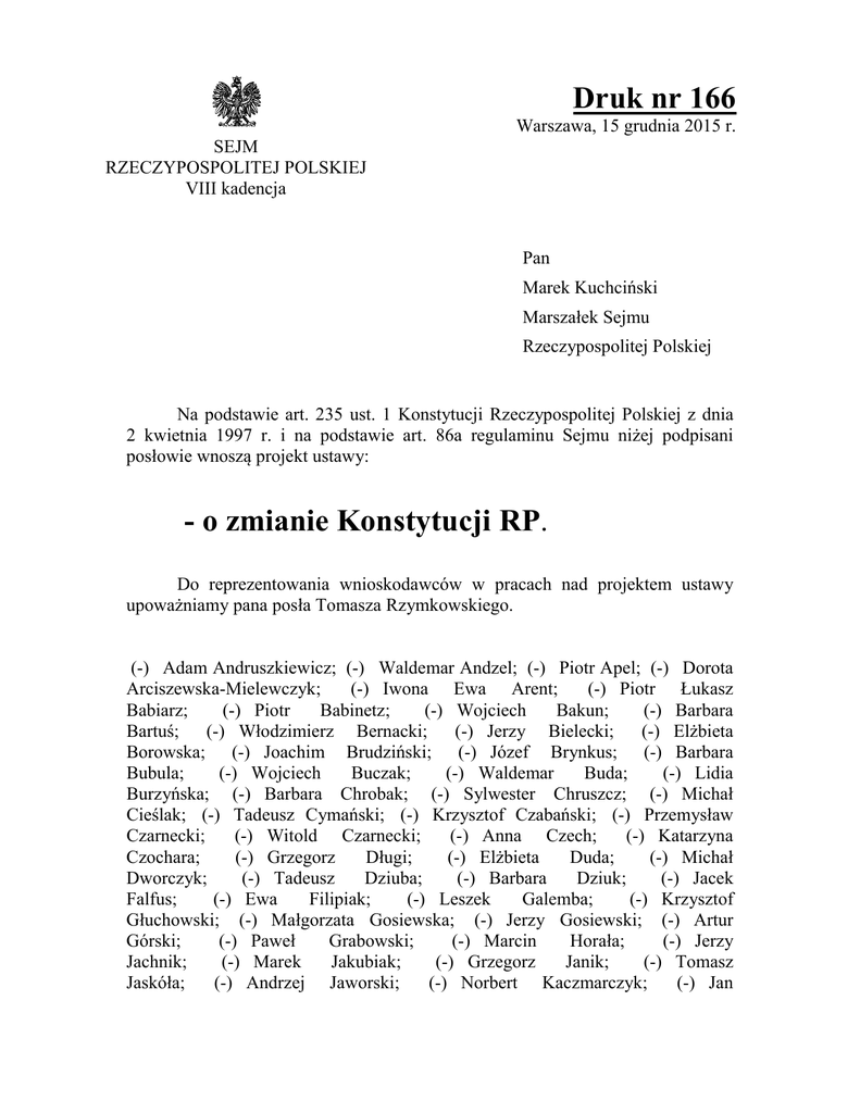 Druk nr 166 Warszawa, 15 grudnia 2015 r. SEJM RZECZYPOSPOLITEJ POLSKIEJ VIII kadencja Pan Marek Kuchciński Marszałek Sejmu Rzeczypospolitej Polskiej Na podstawie art. 235 ust. 1 Konstytucji Rzeczypospolitej Polskiej z dnia 2 kwietnia 1997 r. i na podstawie art. 86a regulaminu Sejmu niżej podpisani posłowie wnoszą projekt ustawy: - o zmianie Konstytucji RP. Do reprezentowania wnioskodawców w pracach nad projektem ustawy upoważniamy pana posła Tomasza Rzymkowskiego. (-) Adam Andruszkiewicz; (-) Waldemar Andzel; (-) Piotr Apel; (-) Dorota Arciszewska-Mielewczyk; (-) Iwona Ewa Arent; (-) Piotr Łukasz Babiarz; (-) Piotr Babinetz; (-) Wojciech Bakun; (-) Barbara Bartuś; (-) Włodzimierz Bernacki; (-) Jerzy Bielecki; (-) Elżbieta Borowska; (-) Joachim Brudziński; (-) Józef Brynkus; (-) Barbara Bubula; (-) Wojciech Buczak; (-) Waldemar Buda; (-) Lidia Burzyńska; (-) Barbara Chrobak; (-) Sylwester Chruszcz; (-) Michał Cieślak; (-) Tadeusz Cymański; (-) Krzysztof Czabański; (-) Przemysław Czarnecki; (-) Witold Czarnecki; (-) Anna Czech; (-) Katarzyna Czochara; (-) Grzegorz Długi; (-) Elżbieta Duda; (-) Michał Dworczyk; (-) Tadeusz Dziuba; (-) Barbara Dziuk; (-) Jacek Falfus; (-) Ewa Filipiak; (-) Leszek Galemba; (-) Krzysztof Głuchowski; (-) Małgorzata Gosiewska; (-) Jerzy Gosiewski; (-) Artur Górski; (-) Paweł Grabowski; (-) Marcin Horała; (-) Jerzy Jachnik; (-) Marek Jakubiak; (-) Grzegorz Janik; (-) Tomasz Jaskóła; (-) Andrzej Jaworski; (-) Norbert Kaczmarczyk; (-) Jan Kilian; (-) Izabela Kloc; (-) Andrzej Kobylarz; (-) Paweł Kobyliński; (-) Lech Kołakowski; (-) Andrzej Kosztowniak; (-) Ewa Kozanecka; (-) Jerzy Kozłowski; (-) Jarosław Krajewski; (-) Wiesław Krajewski; (-) Leonard Krasulski; (-) Piotr Król; (-) Anna Krupka; (-) Krzysztof Kubów; (-) Paweł Kukiz; (-) Jakub Kulesza; (-) Anna Kwiecień; (-) Marek Kwitek; (-) Józef Leśniak; (-) Adam Lipiński; (-) Piotr Liroy-Marzec; (-) Krzysztof Łapiński; (-) Marzena Machałek; (-) Andrzej Maciejewski; (-) Ewa Malik; (-) Gabriela Masłowska; (-) Maciej Masłowski; (-) Jerzy Materna; (-) Marek Matuszewski; (-) Kazimierz Matuszny; (-) Beata Mazurek; (-) Kornel Morawiecki; (-) Robert Mordak; (-) Arkadiusz Mularczyk; (-) Piotr Naimski; (-) Marek Opioła; (-) Krzysztof Ostrowski; (-) Anna Paluch; (-) Błażej Parda; (-) Stanisław Pięta; (-) Dariusz Piontkowski; (-) Stanisław Piotrowicz; (-) Jerzy Polaczek; (-) Jarosław Porwich; (-) Marcin Porzucek; (-) Grzegorz Puda; (-) Stefan Romecki; (-) Łukasz Rzepecki; (-) Tomasz Rzymkowski; (-) Jarosław Sachajko; (-) Grzegorz Schreiber; (-) Łukasz Schreiber; (-) Edward Siarka; (-) Anna Maria Siarkowska; (-) Krzysztof Sitarski; (-) Paweł Skutecki; (-) Andrzej Smirnow; (-) Kazimierz Smoliński; (-) Anna Elżbieta Sobecka; (-) Czesław Sobierajski; (-) Andrzej Sośnierz; (-) Mirosława Stachowiak-Różecka; (-) Jarosław Stawiarski; (-) Marek Suski; (-) Artur Szałabawka; (-) Paweł Szefernaker; (-) Jarosław Szlachetka; (-) Andrzej Szlachta; (-) Paweł Szramka; (-) Stanisław Szwed; (-) Szymon Szynkowski vel Sęk; (-) Agnieszka Ścigaj; (-) Janusz Śniadek; (-) Ryszard Terlecki; (-) Ewa Tomaszewska; (-) Sylwester Tułajew; (-) Piotr Uściński; (-) Małgorzata Wassermann; (-) Jacek Wilk; (-) Jerzy Wilk; (-) Grzegorz Wojciechowski; (-) Michał Wojtkiewicz; (-) Tadeusz Woźniak; (-) Rafał Wójcikowski; (-) Bartłomiej Wróblewski; (-) Anna Zalewska; (-) Krzysztof Zaremba; (-) Wojciech Zubowski; (-) Małgorzata Zwiercan; (-) Ireneusz Zyska. Projekt Ustawa z dnia ……… o zmianie Konstytucji RP Art. 1 W ustawie z dnia 02 kwietnia 1997 r. – Konstytucja RP wprowadza się następujące zmiany: 1) W art. 183 po ust. 1 dodaje się ust. 1a w następującym brzmieniu: „1a. Sąd Najwyższy orzeka o zgodności ustawy, o której mowa w art. 197 Konstytucji, z Konstytucją oraz z ratyfikowanymi umowami międzynarodowymi, których ratyfikacja wymagała uprzedniej zgody wyrażonej w ustawie.” 2) W art. 188 pkt 1) i 2) otrzymują następujące brzmienie: „1) zgodności ustaw i umów międzynarodowych z Konstytucją, z zastrzeżeniem art. 183 ust. 1a Konstytucji, 2) zgodności ustaw z ratyfikowanymi umowami międzynarodowymi, których ratyfikacja wymagała uprzedniej zgody wyrażonej w ustawie, z zastrzeżeniem art. 183 ust. 1a Konstytucji,” 3) W Art. 194 ust. 1 i 2 otrzymują następujące brzmienie: „Art. 194 1. Trybunał Konstytucyjny składa się z 18 sędziów, wybieranych indywidualnie przez Sejm większością co najmniej 2/3 głosów w obecności co najmniej połowy ustawowej liczby posłów, na 9 lat spośród osób wyróżniających się wiedzą prawniczą. Ponowny wybór do składu Trybunału jest niedopuszczalny; 2. Prezesa i Wiceprezesa Trybunału Konstytucyjnego powołuje Prezydent Rzeczypospolitej spośród co najmniej trzech kandydatów przedstawionych przez Zgromadzenie Ogólne Sędziów Trybunału Konstytucyjnego.” Art. 2 Kadencja Sędziów Trybunału Konstytucyjnego, wybranych przed dniem wejścia w życie niniejszej ustawy, wygasa w 60 dniu od dnia jej wejścia w życie. Na ich miejsce zostaną powołani nowi sędziowie, wybrani na zasadach określonych w Konstytucji według jej brzmienia po przyjęciu niniejszej ustawy i w innych właściwych przepisach. Art. 3 Ustawa wchodzi w życie z dniem ogłoszenia. UZASADNIENIE Obecnie toczący się spór o Trybunał Konstytucyjny obnaża wadliwość przepisów dotyczących tej instytucji, a zwłaszcza norm konstytucyjnych. Całkowicie niedopuszczalnym jest, aby w przypadku orzekania o zgodności z Ustawą Zasadniczą ustawy o Trybunale Konstytucyjnym orzekał sam Trybunał. Jest to zaprzeczenie jednej z podstawowych zasad demokratycznego państwa prawa - nemo iudex in causa sua (nikt nie może być sędzią we własnej sprawie). Ponadto obecnie toczący się spór sprawił, iż Trybunał Konstytucyjny stał się narzędziem walki politycznej pomiędzy największymi partiami. Proponowane przez wnioskodawcę
