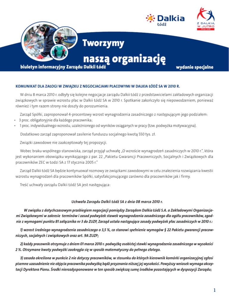 Misja: Łódź Tworzymy naszą organizację biuletyn informacyjny Zarządu Dalkii Łódź wydanie specjalne KOMUNIKAT DLA ZAŁOGI W ZWIĄZKU Z NEGOCJACJAMI PŁACOWYMI W DALKIA ŁÓDŹ SA W 2010 R. W dniu 8 marca 2010 r. odbyły się kolejne negocjacje zarządu Dalkii Łódź z przedstawicielami zakładowych organizacji związkowych w sprawie wzrostu płac w Dalkii Łódź SA w 2010 r. Spotkanie zakończyło się niepowodzeniem, ponieważ również i tym razem strony nie doszły do porozumienia. Zarząd Spółki, zaproponował 4-procentowy wzrost wynagrodzenia zasadniczego z następującym jego podziałem: • 3 proc. obligatoryjnie dla każdego pracownika; • 1 proc. indywidualnego wzrostu, uzależnionego od wyników osiąganych w pracy (tzw. podwyżka motywacyjna). Dodatkowo zarząd zaproponował zasilenie funduszu socjalnego kwotą 550 tys. zł. Związki zawodowe nie zaakceptowały tej propozycji. Wobec braku wspólnego stanowiska, zarząd przyjął uchwałę „O wzroście wynagrodzeń zasadniczych w 2010 r.”, która jest wykonaniem obowiązku wynikającego z par. 22 „Pakietu Gwarancji Pracowniczych, Socjalnych i Związkowych dla pracowników ZEC w Łodzi SA z 17 stycznia 2005 r.” Zarząd Dalkii Łódź SA będzie kontynuował rozmowy ze związkami zawodowymi w celu znalezienia rozwiązania kwestii wzrostu wynagrodzeń dla pracowników Spółki, satysfakcjonującego zarówno dla pracowników jak i firmy. Treść uchwały zarządu Dalkii Łódź SA jest następująca: Uchwała Zarządu Dalkii Łódź SA z dnia 08 marca 2010 r. W związku z dotychczasowym przebiegiem negocjacji pomiędzy Zarządem Dalkia Łódź S.A. a Zakładowymi Organizacjami Związkowymi w zakresie terminów i zasad podwyżek stawek wynagrodzenia zasadniczego dla ogółu pracowników, zgodnie z wymogami punktu B1 załącznika nr 3 do ZUZP, Zarząd ustala następujące zasady podwyżek płac zasadniczych w 2010 r.: 1) wzrost średniego wynagrodzenia zasadniczego o 3,5 %, co stanowi spełnienie wymogów § 22 Pakietu gwarancji pracowniczych, socjalnych i związkowych oraz art. 9A ZUZP; 2) każdy pracownik otrzymuje z dniem 01 marca 2010 r. podwyżkę osobistej stawki wynagrodzenia zasadniczego w wysokości 2 %. Otrzymane kwoty podwyżki zaokrągla się w sposób matematyczny do pełnego złotego. 3) zasada określona w punkcie 2 nie dotyczy pracowników, w stosunku do których kierownik komórki organizacyjnej zgłosi pisemne uzasadnienie nie objęcia pracownika podwyżką bądź przyznania niższej jej wysokości. Powyższy wniosek wymaga akceptacji Dyrektora Pionu. Środki nierozdysponowane w ten sposób zwiększą sumę środków pozostających w dyspozycji Zarządu; 1 Misja: Łódź Tworzymy naszą organizację biuletyn informacyjny Zarządu Dalkii Łódź wydanie specjalne 4) pozostała kwota podwyżek zostanie rozdzielona według zasad przeszeregowania pracowników, wymienionych w punktach B2 do B4 załącznika nr 3 do ZUZP, które brzmią: „2. Zarząd może dokonać przeszeregowania pracownika w przypadkach uzasadnionych względami: 1) organizacyjnymi; 2) koniecznością powierzenia pracownikowi wykonywania czynności bardziej złożonych, w ramach tego samego stanowiska pracy; 3) uzyskania przez pracownika dodatkowych kwalifikacji przydatnych dla przedsiębiorstwa; 4) długoletnim pracownikom – na rok przed zadeklarowanym odejściem na emeryturę lub świadczenie przedemerytalne. 3. Przeszeregowania, o których mowa w pkt. 2, mogę być dokonane w ramach kategorii, do której pracownik jest zaszeregowany. 4. Indywidualne przeszeregowania pracowników powinny mieć charakter motywacyjny.” Uchwała wchodzi w życie z dniem 10 marca 2010 r. z mocą od 1 marca 2010 r. Jacky Lacombe, Prezes Zarządu Dalkii Łódź 2