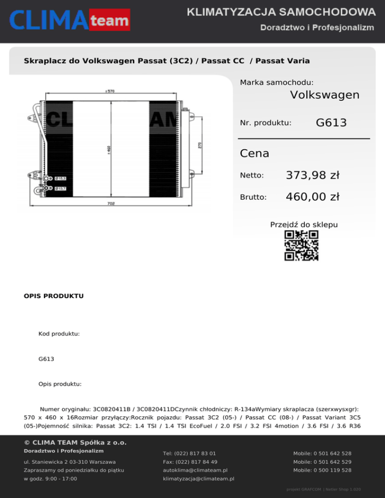 Skraplacz do Volkswagen Passat (3C2) / Passat CC / Passat Varia Marka samochodu: Volkswagen Nr. produktu: G613 Cena Netto: 373,98 zł Brutto: 460,00 zł Przejdź do sklepu OPIS PRODUKTU Kod produktu: G613 Opis produktu: Numer oryginału: 3C0820411B / 3C0820411DCzynnik chłodniczy: R-134aWymiary skraplacza (szerxwysxgr): 570 x 460 x 16Rozmiar przyłączy:Rocznik pojazdu: Passat 3C2 (05-) / Passat CC (08-) / Passat Variant 3C5 (05-)Pojemność silnika: Passat 3C2: 1.4 TSI / 1.4 TSI EcoFuel / 2.0 FSI / 3.2 FSI 4motion / 3.6 FSI / 3.6 R36 © CLIMA TEAM Spółka z o.o. Doradztwo i Profesjonalizm Tel: (022) 817 83 01 Mobile: 0 501 642 528 ul. Staniewicka 2 03-310 Warszawa Fax: (022) 817 84 49 Mobile: 0 501 642 529 Zapraszamy od poniedziałku do piątku [email protected] Mobile: 0 500 119 528 w godz. 9:00 - 17:00 [email protected] projekt GRAFCOM | Netler Shop 1.020 4motionPassat CC: 1.8 TSI / 2.0 TSI / 3.6 4motionPassat Variant 3C5: 1.4 TSI / 1.4 TSI EcoFuel / 2.0 FSI / 3.2 FSI 4motion / 3.6 FSI / 3.6 R36 4motion / 1.6 TDI2.8 V6 / 1.9 TDI Skraplacz zintegrowany z filtrem osuszaczem występuje w dwóch opcjach: z gwarancją 1 rok lub 2 lata. Opcje do wyboru poniżej. © CLIMA TEAM Spółka z o.o. Doradztwo i Profesjonalizm Tel: (022) 817 83 01 Mobile: 0 501 642 528 ul. Staniewicka 2 03-310 Warszawa Fax: (022) 817 84 49 Mobile: 0 501 642 529 Zapraszamy od poniedziałku do piątku [email protected] Mobile: 0 500 119 528 w godz. 9:00 - 17:00 [email protected] projekt GRAFCOM | Netler Shop 1.020