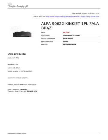 Dane aktualne na dzień: 02-03-2017 22:54 Link do produktu: http://www.twoje-lampy.pl/alfa-90622-kinkiet-1pl-fala-braz-p-16630.html ALFA 90622 KINKIET 1PŁ FALA BRĄZ Opis produktu producent: Alfa wysokość: cm szerokość: 32 cm źródło światła: 1x E27 (max 60W) wykonanie: metal, ceramika Produkt posiada gwarancje producenta. Kolor / materiał: ceramika Trzonek / ilość / moc: E27 (1 szt.) 60W wygenerowano w programie shopGold Powered by TCPDF (www.tcpdf.org) Cena 61,10 zł Dostępność Dostępność 7-14 dni Numer katalogowy ALFA-90622 Kod producenta 90622 Kod EAN 5900458906228