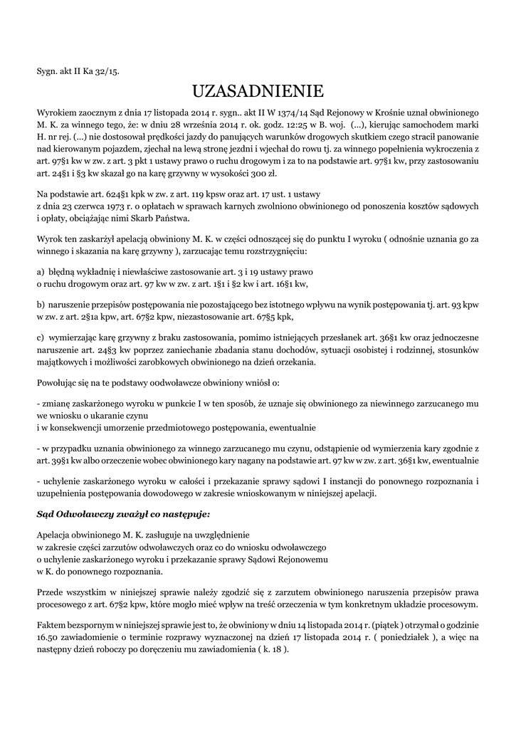 Sygn. akt II Ka 32/15. UZASADNIENIE Wyrokiem zaocznym z dnia 17 listopada 2014 r. sygn.. akt II W 1374/14 Sąd Rejonowy w Krośnie uznał obwinionego M. K. za winnego tego, że: w dniu 28 września 2014 r. ok. godz. 12:25 w B. woj. (...), kierując samochodem marki H. nr rej. (...) nie dostosował prędkości jazdy do panujących warunków drogowych skutkiem czego stracił panowanie nad kierowanym pojazdem, zjechał na lewą stronę jezdni i wjechał do rowu tj. za winnego popełnienia wykroczenia z art. 97§1 kw w zw. z art. 3 pkt 1 ustawy prawo o ruchu drogowym i za to na podstawie art. 97§1 kw, przy zastosowaniu art. 24§1 i §3 kw skazał go na karę grzywny w wysokości 300 zł. Na podstawie art. 624§1 kpk w zw. z art. 119 kpsw oraz art. 17 ust. 1 ustawy z dnia 23 czerwca 1973 r. o opłatach w sprawach karnych zwolniono obwinionego od ponoszenia kosztów sądowych i opłaty, obciążając nimi Skarb Państwa. Wyrok ten zaskarżył apelacją obwiniony M. K. w części odnoszącej się do punktu I wyroku ( odnośnie uznania go za winnego i skazania na karę grzywny ), zarzucając temu rozstrzygnięciu: a) błędną wykładnię i niewłaściwe zastosowanie art. 3 i 19 ustawy prawo o ruchu drogowym oraz art. 97 kw w zw. z art. 1§1 i §2 kw i art. 16§1 kw, b) naruszenie przepisów postępowania nie pozostającego bez istotnego wpływu na wynik postępowania tj. art. 93 kpw w zw. z art. 2§1a kpw, art. 67§2 kpw, niezastosowanie art. 67§5 kpk, c) wymierzając karę grzywny z braku zastosowania, pomimo istniejących przesłanek art. 36§1 kw oraz jednoczesne naruszenie art. 24§3 kw poprzez zaniechanie zbadania stanu dochodów, sytuacji osobistej i rodzinnej, stosunków majątkowych i możliwości zarobkowych obwinionego na dzień orzekania. Powołując się na te podstawy o0dwoławcze obwiniony wniósł o: - zmianę zaskarżonego wyroku w punkcie I w ten sposób, że uznaje się obwinionego za niewinnego zarzucanego mu we wniosku o ukaranie czynu i w konsekwencji umorzenie przedmiotowego postępowania, ewentualnie - w przypadku uznania obwinionego za winnego zarzucanego mu czynu, odstąpienie od wymierzenia kary zgodnie z art. 39§1 kw albo orzeczenie wobec obwinionego kary nagany na podstawie art. 97 kw w zw. z art. 36§1 kw, ewentualnie - uchylenie zaskarżonego wyroku w całości i przekazanie sprawy sądowi I instancji do ponownego rozpoznania i uzupełnienia postępowania dowodowego w zakresie wnioskowanym w niniejszej apelacji. Sąd Odwoławczy zważył co następuje: Apelacja obwinionego M. K. zasługuje na uwzględnienie w zakresie części zarzutów odwoławczych oraz co do wniosku odwoławczego o uchylenie zaskarżonego wyroku i przekazanie sprawy Sądowi Rejonowemu w K. do ponownego rozpoznania. Przede wszystkim w niniejszej sprawie należy zgodzić się z zarzutem obwinionego naruszenia przepisów prawa procesowego z art. 67§2 kpw, które mogło mieć wpływ na treść orzeczenia w tym konkretnym układzie procesowym. Faktem bezspornym w niniejszej sprawie jest to, że obwiniony w dniu 14 listopada 2014 r. (piątek ) otrzymał o godzinie 16.50 zawiadomienie o terminie rozprawy wyznaczonej na dzień 17 listopada 2014 r. ( poniedziałek ), a więc na następny dzień roboczy po doręczeniu mu zawiadomienia ( k. 18 ). Z akt sprawy wynikało także, że obwiniony nie przyznawał się do zarzucanego mu czynu i odmówił składania wyjaśnień, chcąc złożyć wyjaśnienia w sądzie ( k. 13-14 wyjaśnienia obwinionego ). Już te dwie okoliczności zestawione ze sobą powodowały, że decyzja sądu o prowadzeniu rozprawy pod nieobecność obwinionego była zbyt pochopna, skoro przepis art. 67§2 kpw przyznaje obwinionemu zawiadomionemu o terminie rozprawy prawo do sprowadzenia na rozprawę świadków i przedstawienia innych dowodów na swoją obronę lub wskazanie je sądowi w takim czasie, aby mogły być przeprowadzone na rozprawie, nie później jednak niż w terminie 7 dni od daty doręczenia zawiadomienia . Z tego przepisu należy wyciągnąć wniosek, że pomiędzy zawiadomieniem o pierwszej rozprawie, a terminem rozprawy musi minąć termin 7 – dniowy, inaczej obwiniony jest pozbawiony swych praw w procesie. Obwiniony co prawda nie zdążył złożyć wniosku o odroczenie rozprawy, ale nie uczynił tego z przyczyn niezależnych od siebie. Uniemożliwiło mu to doręczenie zawiadomienia o terminie rozprawy po godzinach urzędowania sądu i udział w pracach Obwodowej Komisji Wyborczej nr (...) we W., której był członkiem w związku z wyborami samorządowymi wyznaczonymi na dzień 16 listopada 2014r.( k. 29 ). Zresztą faktem powszechnie znanym są trudności jakie pojawiły się w tych wyborach przy ustalaniu ich wyników oraz duży nakład pracy członków obwodowych komisji wyborczych. W tej sytuacji pełnienie przez obwinionego obowiązków związanych z wyborami samorządowymi nie może negatywnie wpływać na jego prawo do obrony poprzez złożenie wyjaśnień przed sądem orzekającym na rozprawie i składanie wniosków dowodowych, które powołuje w apelacji ( k. 27v ). Naruszenie przez sąd orzekający przepisu art. 67§2 kpw w tych konkretnych okolicznościach sprawy musiało skutkować uchyleniem zaskarżonego wyroku i przekazaniem sprawy do ponownego rozpoznania Sądowi Rejonowemu w Krośnie. Z uzasadnienia zaskarżonego wyroku wynika, że sąd orzekający uznał oznakowanie na miejscu zdarzenia za prawidłowe w oparciu o zeznania jednego świadka – policjanta D. K. ( k. 19v ) i sporządzony przez niego odręcznie szkic miejsca zdarzenia z protokołem oględzin ( k. 2-8 ). Tymczasem okoliczności te nie były tak oczywiste skoro wezwani na miejsce zdarzenia policjanci z Komisariatu Policji w R. nie byli sami w stanie tej kwestii rozstrzygnąć i po to wzywany był patrol z Wydziału Ruchu Drogowego. Obwiniony kwestie te podnosi w apelacji i winny one podlegać gruntownemu wyjaśnieniu jako okoliczność rzutująca na winę i odpowiedzialność obwinione