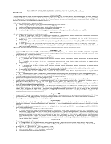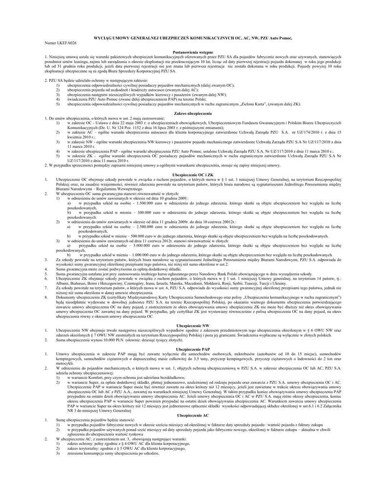 WYCIĄG UMOWY GENERALNEJ UBEZPIECZEŃ KOMUNIKACYJNYCH OC, AC, NW, PZU Auto Pomoc, Numer LKEFA026 Postanowienia wstępne 1. Niniejszą umową ustala się warunki pakietowych ubezpieczeń komunikacyjnych oferowanych przez PZU SA dla pojazdów fabrycznie nowych oraz używanych, stanowiących przedmiot umów leasingu, najmu lub zarządzania o okresie eksploatacji nie przekraczającym 10 lat, licząc od daty pierwszej rejestracji pojazdu dokonanej w roku jego produkcji lub od 31 grudnia roku produkcji, jeżeli data pierwszej rejestracji nie jest znana lub pierwsza rejestracja nie została dokonana w roku produkcji. Pojazdy powyżej 10 roku eksploatacji ubezpieczane są za zgodą Biura Sprzedaży Korporacyjnej PZU SA. 2. PZU SA będzie udzielało ochrony w następującym zakresie: 1) ubezpieczenia odpowiedzialności cywilnej posiadaczy pojazdów mechanicznych (dalej zwanym OC); 2) ubezpieczenia pojazdu od uszkodzeń i kradzieży autocasco (zwanym dalej AC); 3) ubezpieczenia następstw nieszczęśliwych wypadków kierowcy i pasażerów (zwanym dalej NW); 4) świadczenia PZU Auto Pomoc (zwane dalej ubezpieczeniem PAP) na terenie Polski; 5) ubezpieczenia odpowiedzialności cywilnej posiadaczy pojazdów mechanicznych w ruchu zagranicznym „Zielona Karta”, (zwanym dalej ZK). Zakres ubezpieczenia 1. Do umów ubezpieczenia, o których mowa w ust. 2 mają zastosowanie: 1) w zakresie OC - Ustawa z dnia 22 maja 2003 r. o ubezpieczeniach obowiązkowych, Ubezpieczeniowym Funduszu Gwarancyjnym i Polskim Biurze Ubezpieczycieli Komunikacyjnych (Dz. U. Nr 124 Poz. 1152 z dnia 16 lipca 2003 r. z późniejszymi zmianami); 2) w zakresie AC – ogólne warunki ubezpieczenia autocasco dla klienta korporacyjnego zatwierdzone Uchwałą Zarządu PZU S.A. nr UZ/174/2010 r. z dnia 15 kwietnia 2010 r.; 3) w zakresie NW - ogólne warunki ubezpieczenia NW kierowcy i pasażerów pojazdu mechanicznego zatwierdzone Uchwałą Zarządu PZU S.A Nr UZ/117/2010 z dnia 11 marca 2010 r. 4) w zakresie ubezpieczenia PAP - ogólne warunki ubezpieczenia PZU Auto Pomoc, ustalone Uchwałą Zarządu PZU S.A. Nr UZ/117/2010 z dnia 11 marca 2010 r.; 5) w zakresie ZK - ogólne warunki ubezpieczenia OC posiadaczy pojazdów mechanicznych w ruchu zagranicznym zatwierdzone Uchwałą Zarządu PZU S.A Nr UZ/117/2010 z dnia 11 marca 2010 r. 2. W przypadku sprzeczności pomiędzy zapisami niniejszej umowy a ogólnymi warunkami ubezpieczenia, stosuje się zapisy niniejszej umowy. 1. 2. 3. 4. 5. 6. 7. 8. 1. 2. 1. 2. 1. 2. Ubezpieczenie OC i ZK Ubezpieczenie OC obejmuje szkody powstałe w związku z ruchem pojazdów, o których mowa w § 1 ust. 1 niniejszej Umowy Generalnej, na terytorium Rzeczpospolitej Polskiej oraz, na zasadzie wzajemności, również zdarzenia powstałe na terytorium państw, których biura narodowe są sygnatariuszami Jednolitego Porozumienia między Biurami Narodowymi – Regulaminu Wewnętrznego. W ubezpieczeniu OC suma gwarancyjna stanowi równowartość w złotych: 1) w odniesieniu do umów zawieranych w okresie od dnia 10 grudnia 2009.: a) w przypadku szkód na osobie - 1.500.000 euro w odniesieniu do jednego zdarzenia, którego skutki są objęte ubezpieczeniem bez względu na liczbę poszkodowanych, b) w przypadku szkód w mieniu – 300.000 euro w odniesieniu do jednego zdarzenia, którego skutki są objęte ubezpieczeniem bez względu na liczbę poszkodowanych. 2) w odniesieniu do umów zawieranych w okresie od dnia 11 grudnia 2009r. do dnia 10 czerwca 20012r.: a) w przypadku szkód na osobie – 2.500.000 euro w odniesieniu do jednego zdarzenia, którego skutki są objęte ubezpieczeniem bez względu na liczbę poszkodowanych, b) w przypadku szkód w mieniu – 500.000 euro w do jednego zdarzenia, którego skutki są objęte ubezpieczeniem bez względu na liczbę poszkodowanych. 3) w odniesieniu do umów zawieranych od dnia 11 czerwca 2012r. stanowi równowartość w złotych: a) przypadku szkód na osobie – 5.000.000 euro w odniesieniu do jednego zdarzenia, którego skutki są objęte ubezpieczeniem bez względu na liczbę poszkodowanych, b) w przypadku szkód w mieniu – 1.000.000 euro w do jednego zdarzenia, którego skutki są objęte ubezpieczeniem bez względu na liczbę poszkodowanych. Za szkody powstałe na terytorium państw, których biura narodowe są sygnatariuszami Jednolitego Porozumienia między Biurami Narodowymi, PZU S.A. odpowiada do wysokości sumy gwarancyjnej określonej przepisami tego państwa, nie niżej niż suma określona w ust.2. Suma gwarancyjna może zostać podwyższona za opłatą dodatkowej składki. Suma gwarancyjna ustalana jest przy zastosowaniu średniego kursu ogłaszanego przez Narodowy Bank Polski obowiązującego w dniu wyrządzenia szkody. Ubezpieczenie ZK obejmuje szkody powstałe w związku z ruchem pojazdów, o których mowa w § 1 ust. 1 niniejszej Umowy generalnej, na terytorium 14 państw, tj.: Albanii, Białorusi, Bośni i Hercegowiny, Czarnogóry, Iranu, Izraela, Maroka, Macedonii, Mołdawii, Rosji, Serbii, Tunezji, Turcji i Ukrainy. Za szkody powstałe na terytorium państw, o których mowa w ust. 6, PZU S.A. odpowiada do wysokości sumy gwarancyjnej określonej przepisami tego państwa, jednak nie niższej niż suma określona w danej umowie ubezpieczenia. Dokumenty ubezpieczenia ZK (certyfikaty Międzynarodowej Karty Ubezpieczenia Samochodowego oraz polisy „Ubezpieczenia komunikacyjnego w ruchu zagranicznym”) będą nieodpłatnie wydawane w dowolnej jednostce PZU S.A. na terenie Rzeczpospolitej Polskiej, po okazaniu ważnego dokumentu ubezpieczenia potwierdzającego zawarcie umowy ubezpieczenia OC na dany pojazd, z zastrzeżeniem że okres obowiązywania umowy ubezpieczenia ZK nie może być dłuższy niż okres obowiązywania umowy ubezpieczenia OC zawartej na dany pojazd. W przypadku, gdy certyfikat ZK jest wystawiany równocześnie z polisą ubezpieczenia OC na dany pojazd, na okres ubezpieczenia równy z okresem umowy ubezpieczenia OC. Ubezpieczenie NW Ub