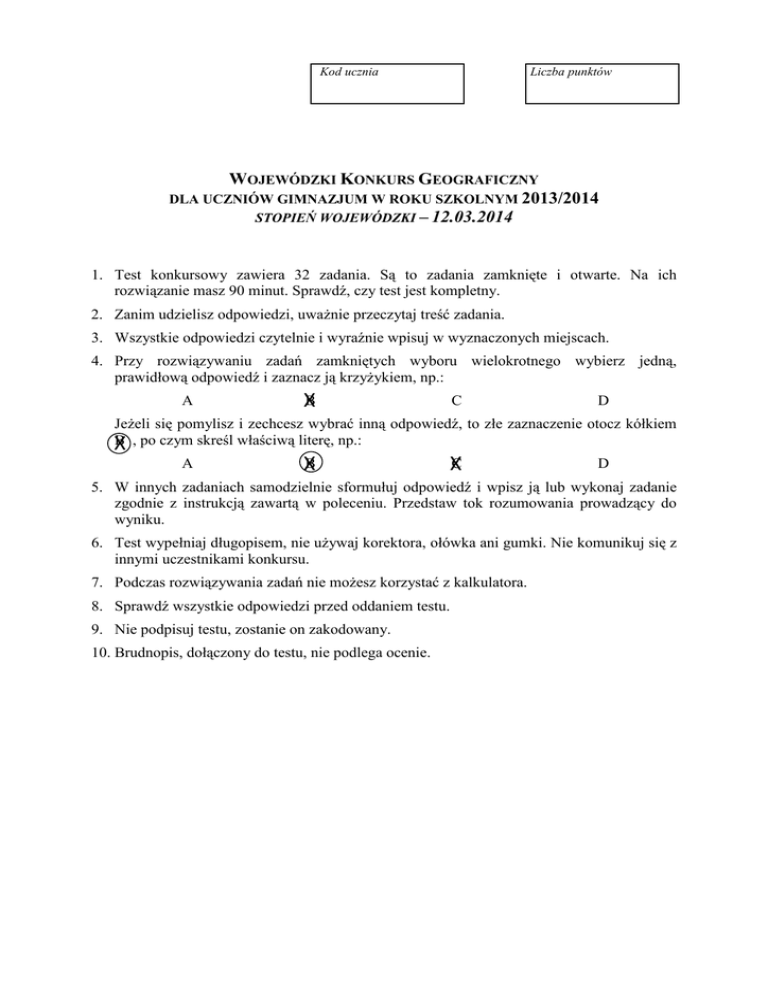 Kod ucznia Liczba punktów WOJEWÓDZKI KONKURS GEOGRAFICZNY DLA UCZNIÓW GIMNAZJUM W ROKU SZKOLNYM 2013/2014 STOPIEŃ WOJEWÓDZKI – 12.03.2014 1. Test konkursowy zawiera 32 zadania. Są to zadania zamknięte i otwarte. Na ich rozwiązanie masz 90 minut. Sprawdź, czy test jest kompletny. 2. Zanim udzielisz odpowiedzi, uważnie przeczytaj treść zadania. 3. Wszystkie odpowiedzi czytelnie i wyraźnie wpisuj w wyznaczonych miejscach. 4. Przy rozwiązywaniu zadań zamkniętych wyboru wielokrotnego wybierz jedną, prawidłową odpowiedź i zaznacz ją krzyżykiem, np.: A XB C D Jeżeli się pomylisz i zechcesz wybrać inną odpowiedź, to złe zaznaczenie otocz kółkiem XB , po czym skreśl właściwą literę, np.: A XB XC D 5. W innych zadaniach samodzielnie sformułuj odpowiedź i wpisz ją lub wykonaj zadanie zgodnie z instrukcją zawartą w poleceniu. Przedstaw tok rozumowania prowadzący do wyniku. 6. Test wypełniaj długopisem, nie używaj korektora, ołówka ani gumki. Nie komunikuj się z innymi uczestnikami konkursu. 7. Podczas rozwiązywania zadań nie możesz korzystać z kalkulatora. 8. Sprawdź wszystkie odpowiedzi przed oddaniem testu. 9. Nie podpisuj testu, zostanie on zakodowany. 10. Brudnopis, dołączony do testu, nie podlega ocenie. WOJEWÓDZKIE KONKURSY PRZEDMIOTOWE 2013/2014 – GIMNAZJUM STOPIEŃ WOJEWÓDZKI Zadanie 1. (2p) Oblicz skalę mapy, na której wyspa o powierzchni rzeczywistej 18 ha zajmuje 2 cm2. Obliczenia: Wynik ………………… Zadanie 2. (2p) Oblicz współrzędne geograficzne miejscowości X położonej na półkuli północnej, w której 23 września górowanie Słońca następuje 8 minut wcześniej niż w Warszawie ( 520N, 210E), a wysokość Słońca w momencie górowania jest o 30 niższa niż w Warszawie. Obliczenia: Wynik ……………….. Zadanie 3. (2p) Uszereguj wydarzenia z historii geologicznej Polski od najstarszego do najmłodszego, wpisując cyfry w tabelę. 1. 2. 3. 4. 5. 6. powstanie pokładów węgla kamiennego na Wyżynie Śląskiej zlodowacenie północnej części Europy, w tym Polski powstanie złóż ropy naftowej na Pomorzu i w Wielkopolsce fałdowanie alpejskie- powstają m.in. Alpy i Karpaty powstanie Morza Bałtyckiego powstanie złóż rud żelaza w okolicach Suwałk Wydarzenie najstarsze Wydarzenie najmłodsze 2 z 18 WOJEWÓDZKIE KONKURSY PRZEDMIOTOWE 2013/2014 – GIMNAZJUM STOPIEŃ WOJEWÓDZKI Zadanie 4. (5p) Uzupełnij tabelę, wybierając właściwe określenia z podanych poniżej UWAGA! Nie wszystkie określenia spośród podanych będą wykorzystane. Proces rzeźbotwórczy Czynnik rzeźbotwórczy Forma rzeźby Pas rzeźby pobrzeże erozja wgłębna lodowiec kontynentalny ostaniec krasowy wody polodowcowe Procesy rzeźbotwórcze: abrazja, akumulacja, erozja, korazja, krasowienie, wietrzenie fizyczne. Czynniki rzeźbotwórcze: wiatr, woda z CO2, rzeka, morze, lodowiec górski. Formy rzeźby: dolina U-kształtna, dolina V-kształtna, klif, morena czołowa, pradolina, grzyb skalny. Pasy rzeźby: góry, kotliny, wyżyny, niziny, pojezierza. Zadanie 5. (2p) Wpisz w odpowiednie miejsce tabeli nazwy miast: Hel, Poznań, Suwałki, Wrocław, Zakopane. Miasto Śr. temp. stycznia (°C) Śr. temp. lipca (°C) Roczne opady (mm) …………………… -5,3 16,6 594 …………………… -1,8 17,7 590 …………………… -4,8 14,2 1122 -2,0 18,0 515 -0,8 16,9 574 …………………… ……….................... Źródło: B. Dobosik., A.Hibszer., J. Soja., Tablice geograficzne, Videograf II, Katowice, 2002 3 z 18 WOJEWÓDZKIE KONKURSY PRZEDMIOTOWE 2013/2014 – GIMNAZJUM STOPIEŃ WOJEWÓDZKI Zadanie 6. (2p) Do jakich państw należą następujące terytoria? A. Sardynia ………………………. B. Grenlandia ………………………. C. Wyspy Kanaryjskie ………………………. D. Okręg Kaliningradzki ………………………. E. Kreta ………………………. F. Korsyka ………………………. Zadanie 7. (2p) Rozpoznaj religie na podstawie opisu. A. W religii tej czci się wiele bóstw, najważniejsze z nich to Brahma, Wisznu i Siwa. Najstarsze i święte księgi to Wedy. Wyznawcy tej religii dzielą się na kilka kast. Najwyższą z nich jest kasta braminów. ......................................................... B. Religia ta powstała na obszarze dzisiejszej Arabii Saudyjskiej. Jej twórcą był Mahomet. Wyznawcy tej religii wierzą w jedynego Boga Allaha. Ich świętą księgą jest Koran. ......................................................... Zadanie 8. (2p) Przyporządkuj krainom geograficznym po 1 spośród podanych czynników wpływających na kształtowanie wielkości opadów. ciepły prąd morski, zimny prąd morski, pasatowa cyrkulacja powietrza, monsunowa cyrkulacja powietrza, duża odległość od oceanu, położenie w cieniu opadowym otaczających wzniesień • Pustynia Atakama .......................................................... • Sahara............................................................................. • Góry Skandynawskie...................................................... • Pogórze Kazachskie........................................................ • Nizina Chińska............................................................... 4 z 18 WOJEWÓDZKIE KONKURSY PRZEDMIOTOWE 2013/2014 – GIMNAZJUM STOPIEŃ WOJEWÓDZKI Zadanie 9. (2p) Uzupełnij tabelę, wybierając określenia spośród podanych. Geneza jeziora: A – pozostałość dawnych mórz, B – powstało na skutek ruchów skorupy ziemskiej, C – zapadlisko powstałe w wyniku rozpuszczania przez wodę podłoża skalnego, D – odcięcie zatoki przez mierzeję, E – obniżenie w rynnie polodowcowej. Przykłady jezior: 1 –Morskie Oko, 2 – Łebsko, 3 – Jeziorak, 4 – Aralskie, 5 – Tanganika. Typ jeziora Przybrzeżne Reliktowe Rynnowe Tektoniczne Geneza jeziora Przykład jeziora Zadanie 10. (2p) Przyporządkuj genetycznym typom gleby najważniejsze obszary jej występowan