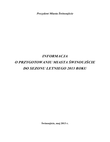 Prezydent Miasta Świnoujście INFORMACJA O PRZYGOTOWANIU MIASTA ŚWINOUJŚCIE DO SEZONU LETNIEGO 2013 ROKU Świnoujście, maj 2013 r. INFORMACJA WYDZIAŁU PROMOCJI, TURYSTYKI, KULTURY I SPORTU Przygotowanie Miasta do sezonu letniego 2013 r. w zakresie: Infrastruktury turystycznej: 1) wykonanie i montaż 18 tablic z planami Miasta wraz ze stelażami; 2) wymiana plansz przy stojakach rowerowych; 3) konserwacja szlaków turystycznych (w tym: naprawa i renowacja elementów małej architektury, uzupełnienie oznakowania); 4) oznakowanie tymczasowego odcinka szlaku rowerowego R10. Funkcjonowania Biura Informacji Turystycznej w sezonie letnim: 1) od 1 czerwca do 30 września br. Biuro Informacji Turystycznej przy Placu Słowiańskim będzie czynne od poniedziałku do piątku w godzinach 9.00 – 17.00 oraz w soboty i niedziele w godzinach 10.00 – 14.00; 2) od 15 czerwca do 15 września br. będzie działał sezonowy punkt informacji turystycznej na Promenadzie; 3) dodatkowo, podczas trwania imprezy Sail Świnoujście, w terminie 15-18 sierpnia, w miejscu imprezy (na Wybrzeżu Władysława IV) będzie uruchomiony punkt informacji. INFORMACJA OŚRODKA SPORTU I REKREACJI „WYSPIARZ” W związku z przygotowaniem obiektów turystycznych do sezonu 2013 r. podjęto następujące działania: Kemping „Relax” ul. Słowackiego 1: Domki kempingowe: - częściowo wymieniono armaturę sanitarną (wymiana kompaktów, baterii ściennych umywalkowych, umywalek itp.); - wymieniono uszkodzone: lustra i półki, mydelniczki, zasłony prysznicowe, węże i dysze w łazienkach; - położono nowe podłogi (panel) w domkach nr 4B-5B; - wymieniono zestawy mebli kuchennych w domkach nr 1F-8F; - wymalowano wewnątrz wszystkie domki kempingowe; - wymalowano zewnątrz domki kempingowe 2, 3, 4-osobowe; - dokonano napraw balustrad, wykonano obróbki blacharskie oraz uzupełniono uszkodzoną terakotę na tarasach domków. Obecnie trwa: - remont łazienek w domkach 6F, 7F, 8F (glazura i terakota); - doposażanie domków kempingowych z aneksem kuchennym w garnki, naczynia, sztućce itp.; - naprawa i częściowa wymiana rynien i rur spustowych; - instalacja sieci Wi-Fi na terenie całego kempingu; - sieciowa instalacja do odbioru telewizji cyfrowej. Sanitariaty: - malowanie drzwi zewnętrznych i wewnętrznych oraz ościeżnic w sanitariatach nr II i III; - malowanie zewnętrzne sanitariatów nr I, II i III; - wymiana armatury sanitarnej w sanitariatach II i III; - wymiana częściowa uszkodzonych luster i mydelniczek, instalacja pojemników na papier Jumbo; 2 - bieżące uzupełnianie i naprawa ubytków terakoty i glazury w sanitariatach nr II i III; - wymiana zniszczonych paneli ściennych w sanitariacie nr III; - instalacja grzejnika zapobiegająca przegrzaniu instalacji solarnej w sanitariacie nr I; przygotowanie dokumentacji projektowej, przetargowej, ogłoszenie przetargu na remont sanitariatu nr I oraz zmiana sposobu użytkowania pomieszczenia gospodarczego na pralnię i suszarnię w sanitariacie nr II. Teren Kempingu: - malowanie wewnętrzne i zewnętrzne kuchni turystycznej; - prace brukarskie przed kawiarnią (wymiana nawierzchni chodnikowej); - naprawa ubytków w drodze wewnętrznej Kempingu (zimny asfalt); - bieżące uzupełnianie ubytków ziemi oraz dosiewki trawy na polu namiotowym i karawaningowym; - malowanie zewnętrzne i wewnętrzne pomieszczeń w budynku administracji, warsztatu i magazynów, pomieszczenia socjalnego dla pracowników obsługi kempingu; - bieżąca estetyzacja terenu – malowanie krawężników, zakup i sadzenie roślin ozdobnych, grabienie liści, koszenie trawy; - w planie naprawa uszkodzonej drogi wewnętrznej przy studzienkach kanalizacyjnych oraz hydrancie; - naprawa i wymiana gniazdek w szafkach elektrycznych na polu namiotowym i karawaningowym; - wymiana szafki elektrycznej, położenie nowych przewodów, likwidacja licznika z domku 3B; - wynajęcie pasa drogowego od UM Świnoujście, stworzenie tam parkingu dozorowanego dla turystów z kempingu i spoza kempingu – ogrodzenie, oświetlenie terenu, zatrudnienie parkingowych. Dom Noclegowy, ul. Matejki 17a: - część noclegowa obiektu została wyłączona z eksploatacji. Na przełomie maja/czerwca br. zostanie wykonany projekt przystosowania obiektu do wymagań zgodnych z obowiązującymi przepisami – klatki schodowej – wyjścia ewakuacyjnego, hydrantów wewnątrz budynku itp. Ilość miejsc noclegowych: Kemping „Relax” dysponuje następującą bazą noclegową: Domki kempingowe z pełnym węzłem sanitarnym: - 10 domków 2-osobowych, - 30 domków 3-osobowych, - 10 domków 4-osobowych, - 1 domek o podwyższonym standardzie. Razem: 154 miejsca noclegowe w domkach kempingowych. Dodatkowo: - pole namiotowe przygotowane do przyjęcia na około 150 namiotów (jednorazowo), - pole karawaningowe przygotowane do przyjęcia na około 150 przyczep lub karawanów (jednorazowo). Razem: 754 miejsc noclegowych w całej bazie. Do dyspozycji turystów: 3 sanitariaty (toalety, umywalki, natryski) z bieżącą gorącą wodą, 2 z nich wyposażone w instalacje solarną wspomagającą ogrzewanie c.w.u., kuchnia turystyczna, plac zabaw dla dzieci, dostęp do internetu bezprzewodowego, recepcja (w sezonie letnim czynna 24h), teren dozorowany (w sezonie letnim chroniony 24h), sklep spożywczy, kawiarnia-bar. Parking dozorowany dla turystów kempingu i spoza kempingu. 3 Kemping Relax udziela noclegów dla turystów indywidualnych, grup zorganizowanych dzieci, młodzieży, emerytów i rencistów, osób niepełnosprawnych, a także dla uczestników oraz obsługi imprez miejskich np.: Karuzeli Cooltury, Famy, Festiwalu Tańca itp. oraz wynajmuje miejsca parkingowe dla turystów odwiedzających miasto Świnoujście przebywających w hotelach, pensjonatach, apartamentach które nie gwarantują parkingów. Basen Północny: 1) wykonano przegląd i uruchomiono zamontowaną na budynku sanitariatów instalację solarową do podgrzewania wody użytkowej