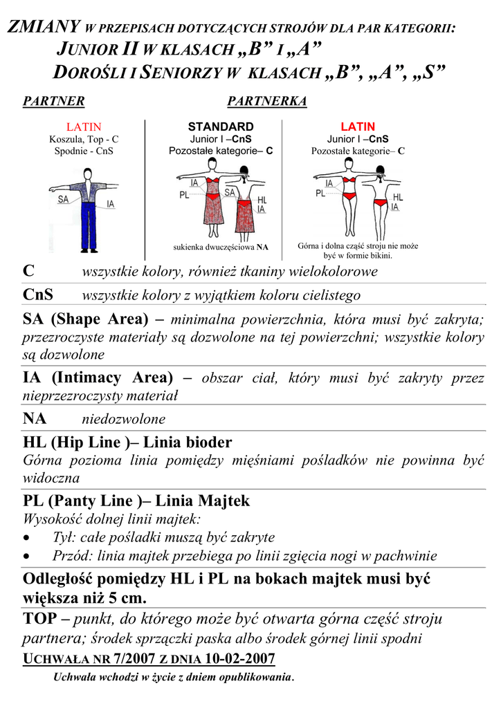 ZMIANY W PRZEPISACH DOTYCZĄCYCH STROJÓW DLA PAR KATEGORII: JUNIOR II W KLASACH „B” I „A” DOROŚLI I SENIORZY W KLASACH „B”, „A”, „S” PARTNER PARTNERKA LATIN STANDARD LATIN Koszula, Top - C Spodnie - CnS Junior I –CnS Pozostałe kategorie– C Junior I –CnS Pozostałe kategorie– C sukienka dwuczęściowa NA Górna i dolna cząść stroju nie może być w formie bikini. C wszystkie kolory, również tkaniny wielokolorowe CnS wszystkie kolory z wyjątkiem koloru cielistego SA (Shape Area) – minimalna powierzchnia, która musi być zakryta; przezroczyste materiały są dozwolone na tej powierzchni; wszystkie kolory są dozwolone IA (Intimacy Area) – obszar ciał, który musi być zakryty przez nieprzezroczysty materiał NA niedozwolone HL (Hip Line )– Linia bioder Górna pozioma linia pomiędzy mięśniami pośladków nie powinna być widoczna PL (Panty Line )– Linia Majtek Wysokość dolnej linii majtek: • Tył: całe pośladki muszą być zakryte • Przód: linia majtek przebiega po linii zgięcia nogi w pachwinie Odległość pomiędzy HL i PL na bokach majtek musi być większa niż 5 cm. TOP – punkt, do którego może być otwarta górna część stroju partnera; środek sprzączki paska albo środek górnej linii spodni UCHWAŁA NR 7/2007 Z DNIA 10-02-2007 Uchwała wchodzi w życie z dniem opublikowania.
