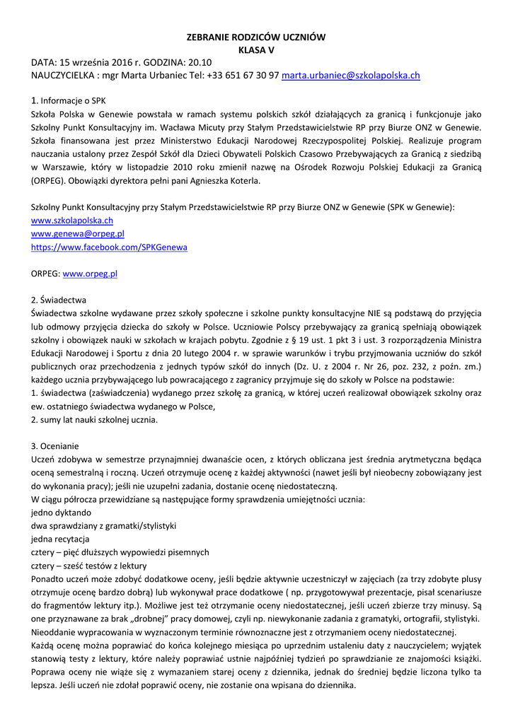 ZEBRANIE RODZICÓW UCZNIÓW KLASA V DATA: 15 września 2016 r. GODZINA: 20.10 NAUCZYCIELKA : mgr Marta Urbaniec Tel: +33 651 67 30 97 [email protected] 1. Informacje o SPK Szkoła Polska w Genewie powstała w ramach systemu polskich szkół działających za granicą i funkcjonuje jako Szkolny Punkt Konsultacyjny im. Wacława Micuty przy Stałym Przedstawicielstwie RP przy Biurze ONZ w Genewie. Szkoła finansowana jest przez Ministerstwo Edukacji Narodowej Rzeczypospolitej Polskiej. Realizuje program nauczania ustalony przez Zespół Szkół dla Dzieci Obywateli Polskich Czasowo Przebywających za Granicą z siedzibą w Warszawie, który w listopadzie 2010 roku zmienił nazwę na Ośrodek Rozwoju Polskiej Edukacji za Granicą (ORPEG). Obowiązki dyrektora pełni pani Agnieszka Koterla. Szkolny Punkt Konsultacyjny przy Stałym Przedstawicielstwie RP przy Biurze ONZ w Genewie (SPK w Genewie): www.szkolapolska.ch [email protected] https://www.facebook.com/SPKGenewa ORPEG: www.orpeg.pl 2. Świadectwa Świadectwa szkolne wydawane przez szkoły społeczne i szkolne punkty konsultacyjne NIE są podstawą do przyjęcia lub odmowy przyjęcia dziecka do szkoły w Polsce. Uczniowie Polscy przebywający za granicą spełniają obowiązek szkolny i obowiązek nauki w szkołach w krajach pobytu. Zgodnie z § 19 ust. 1 pkt 3 i ust. 3 rozporządzenia Ministra Edukacji Narodowej i Sportu z dnia 20 lutego 2004 r. w sprawie warunków i trybu przyjmowania uczniów do szkół publicznych oraz przechodzenia z jednych typów szkół do innych (Dz. U. z 2004 r. Nr 26, poz. 232, z poźn. zm.) każdego ucznia przybywającego lub powracającego z zagranicy przyjmuje się do szkoły w Polsce na podstawie: 1. świadectwa (zaświadczenia) wydanego przez szkołę za granicą, w której uczeń realizował obowiązek szkolny oraz ew. ostatniego świadectwa wydanego w Polsce, 2. sumy lat nauki szkolnej ucznia. 3. Ocenianie Uczeń zdobywa w semestrze przynajmniej dwanaście ocen, z których obliczana jest średnia arytmetyczna będąca oceną semestralną i roczną. Uczeń otrzymuje ocenę z każdej aktywności (nawet jeśli był nieobecny zobowiązany jest do wykonania pracy); jeśli nie uzupełni zadania, dostanie ocenę niedostateczną. W ciągu półrocza przewidziane są następujące formy sprawdzenia umiejętności ucznia: jedno dyktando dwa sprawdziany z gramatki/stylistyki jedna recytacja cztery – pięć dłuższych wypowiedzi pisemnych cztery – sześć testów z lektury Ponadto uczeń może zdobyć dodatkowe oceny, jeśli będzie aktywnie uczestniczył w zajęciach (za trzy zdobyte plusy otrzymuje ocenę bardzo dobrą) lub wykonywał prace dodatkowe ( np. przygotowywał prezentacje, pisał scenariusze do fragmentów lektury itp.). Możliwe jest też otrzymanie oceny niedostatecznej, jeśli uczeń zbierze trzy minusy. Są one przyznawane za brak „drobnej” pracy domowej, czyli np. niewykonanie zadania z gramatyki, ortografii, stylistyki. Nieoddanie wypracowania w wyznaczonym terminie równoznaczne jest z otrzymaniem oceny niedostatecznej. Każdą ocenę można poprawiać do końca kolejnego miesiąca po uprzednim ustaleniu daty z nauczycielem; wyjątek stanowią testy z lektury, które należy poprawiać ustnie najpóźniej tydzień po sprawdzianie ze znajomości książki. Poprawa oceny nie wiąże się z wymazaniem starej oceny z dziennika, jednak do średniej będzie liczona tylko ta lepsza. Jeśli uczeń nie zdołał poprawić oceny, nie zostanie ona wpisana do dziennika. Oceny ucznia można śledzić na bieżąco w prowadzonej przez dziecko tabeli na ostatniej stronie zeszytu. Nauczyciel będzie odnotowywał w zeszycie lub wysyłał bezpośrednio do rodziców informację o zachowaniu uczniów. 4. Strona SPK Na stronach SPK (www.szkolapolska.ch [email protected] ) są systematycznie zamieszczane ogłoszenia oraz informacje dotyczące szkoły. Zapraszamy do zapoznania się ze Statutem SPK, regulaminem BHP i innymi dokumentami. 5. Formularze i ubezpieczenia OC Prosimy o dostarczenie wypełnionych dokumentów: kwestionariusza osobowego (załącznik nr 2 na stronie szkoły w zakładce Formularze), oświadczenia OC (załącznik nr 5 na stronie szkoły w zakładce Formularze) oraz kopii polisy ubezpieczeniowej. W przypadku uczniów nowych w szkole, proszę o wypełnienie wszystkich załączników. 6. Legitymacja szkolna Osoby, które chcą podbić legitymację, proszę o przyniesienie jej najpóźniej do 22 września. Jeśli ktoś chce wyrobić legitymację dla swojego dziecka, proszę o wypełnienie wniosku podając polski adres (dostępny na stronie) i dołączenie podpisanego zdjęcia o wymiarach 30 mm x 42 mm. 7. Terminarz 2016 / 2017 • Jesienne wakacje – od poniedziałku 24 października do piątku 28 października 2016 r. • Święta Bożego Narodzenia – od piątku 19 grudnia 2016 r. do piątku 6 stycznia 2017 r. • Ferie zimowe – od poniedziałku 13 lutego do piątku 17 lutego 2017 r. • Święta Wielkanocne – od poniedziałku 17 kwietnia 2017 r. do piątku 21 kwietnia 2017 r. • Weekend majowy - od poniedziałku 1 maja 2017 do środy 3 maja 2017 r. • Ascension - 25 maja 2017 r. • Piknik na zakończenie roku szkolnego - 5 lub 19 czerwca 2016 r. • Zakończenie Roku – czwartek 22 czerwca 2017 r. 8. Podręczniki i przybory szkolne Uczniowie będą korzystać z następujących darmowych podręczników: „Teraz polski! 5” oraz „My i historia 5”. Książki zostaną uczniom wypożyczone i na koniec roku należy je zwrócić, dlatego nie wolno w nich pisać ani rysować, bardzo proszę o szanowanie podręczników, które mają służyć kolejnym uczniom. Jeżeli podręcznik zostanie zniszczony, rodzice ucznia zostaną obciążeni finansowo. Uczeń powinien do szkoły przynosić ponadto dwa zeszyty: do języka polskiego i do WoP oraz piórnik (długopis, ołówek, temperówka, gumka, nożyczki, klej, kredki). 9. Wykaz lektur 29.09.2016 Lektura I: Henryk Sienkiewicz „W pustyni i w