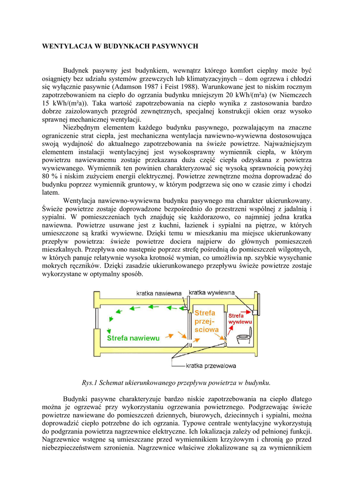 WENTYLACJA W BUDYNKACH PASYWNYCH Budynek pasywny jest budynkiem, wewnątrz którego komfort cieplny może być osiągnięty bez udziału systemów grzewczych lub klimatyzacyjnych – dom ogrzewa i chłodzi się wyłącznie pasywnie (Adamson 1987 i Feist 1988). Warunkowane jest to niskim rocznym zapotrzebowaniem na ciepło do ogrzania budynku mniejszym 20 kWh/(m²a) (w Niemczech 15 kWh/(m²a)). Taka wartość zapotrzebowania na ciepło wynika z zastosowania bardzo dobrze zaizolowanych przegród zewnętrznych, specjalnej konstrukcji okien oraz wysoko sprawnej mechanicznej wentylacji. Niezbędnym elementem każdego budynku pasywnego, pozwalającym na znaczne ograniczenie strat ciepła, jest mechaniczna wentylacja nawiewno-wywiewna dostosowująca swoją wydajność do aktualnego zapotrzebowania na świeże powietrze. Najważniejszym elementem instalacji wentylacyjnej jest wysokosprawny wymiennik ciepła, w którym powietrzu nawiewanemu zostaje przekazana duża część ciepła odzyskana z powietrza wywiewanego. Wymiennik ten powinien charakteryzować się wysoką sprawnością powyżej 80 % i niskim zużyciem energii elektrycznej. Powietrze zewnętrzne można doprowadzać do budynku poprzez wymiennik gruntowy, w którym podgrzewa się ono w czasie zimy i chodzi latem. Wentylacja nawiewno-wywiewna budynku pasywnego ma charakter ukierunkowany. Świeże powietrze zostaje doprowadzone bezpośrednio do przestrzeni wspólnej z jadalnią i sypialni. W pomieszczeniach tych znajduję się każdorazowo, co najmniej jedna kratka nawiewna. Powietrze usuwane jest z kuchni, łazienek i sypialni na piętrze, w których umieszczone są kratki wywiewne. Dzięki temu w mieszkaniu ma miejsce ukierunkowany przepływ powietrza: świeże powietrze dociera najpierw do głównych pomieszczeń mieszkalnych. Przepływa ono następnie poprzez strefę pośrednią do pomieszczeń wilgotnych, w których panuje relatywnie wysoka krotność wymian, co umożliwia np. szybkie wysychanie mokrych ręczników. Dzięki zasadzie ukierunkowanego przepływu świeże powietrze zostaje wykorzystane w optymalny sposób. Rys.1 Schemat ukierunkowanego przepływu powietrza w budynku. Budynki pasywne charakteryzuje bardzo niskie zapotrzebowania na ciepło dlatego można je ogrzewać przy wykorzystaniu ogrzewania powietrznego. Podgrzewając świeże powietrze nawiewane do pomieszczeń dziennych, biurowych, dziecinnych i sypialni, można doprowadzić ciepło potrzebne do ich ogrzania. Typowe centrale wentylacyjne wykorzystują do podgrzania powietrza nagrzewnice elektryczne. Ich lokalizacja zależy od pełnionej funkcji. Nagrzewnice wstępne są umieszczane przed wymiennikiem krzyżowym i chronią go przed niebezpieczeństwem szronienia. Nagrzewnice właściwe zlokalizowane są za wymiennikiem krzyżowym. Zastosowanie nagrzewnicy o mocy 3 – 5 kW może w pełni pokryć zapotrzebowanie budynku pasywnego na ciepło. Często spotykanym rozwiązaniem są również tzw. urządzenia kompaktowe, które pełnią jednocześnie rolę centrali wentylacyjnej, instalacji grzewczej oraz odpowiadają za przygotowanie ciepłej wody użytkowej. Ich konstrukcja jest oparta o pompę ciepła, która wykorzystuje pozostałe w powietrzu wywiewnym z budynku ciepło do ogrzania c.w.u.. Urządzenia kompaktowe mogą korzystać z odnawialnych źródeł energii np. dzięki współpracy z kolektorami słonecznymi. Centrala wentylacyjna z odzyskiem ciepła Głównym elementem instalacji wentylacyjnej budynku pasywnego jest wysokosprawny wymiennik ciepła, zwany też rekuperatorem, w który zachodzi odzyskanie ciepła z usuwanego, zużytego powietrza. Brak odzysku spowodowałby, że strata ciepła na wentylację wyniosłaby od 20 do 30 kWh/(m²a), czyli więcej niż całkowite zapotrzebowanie na ciepło do ogrzewania budynku. Nowoczesne wymienniki pozwalają na odzyskanie od 65 % do 95 % ciepła z usuwanego powietrza. Zapewniają jednocześnie szczelne oddzielenie strumienia powietrza usuwanego od nawiewanego, zużywają niewiele energii elektrycznej i charakteryzują się cichą pracą. Dzięki wysokiej sprawności odzysku ciepła, straty ciepła na wentylację są małe, co jest warunkiem koniecznym dla prawidłowego funkcjonowania budynku pasywnego. Wysoka efektywność wymiennika pozwala równocześnie na ogrzanie powietrza nawiewanego do temperatury zbliżonej do temperatury powietrza wewnętrznego. Dzięki temu nawiewane powietrze nie jest już „zimne“. Daje to możliwość, razem z wysoką izolacyjnością przegród zewnętrznych i okien, zapewnienia użytkownikom budynku wysokiego komfortu cieplnego. Stosowane w budynkach pasywnych wymienniki powinny charakteryzować się sprawnością odzysku ciepła, 80 % i niskim pobórem mocy elektrycznej. Pozostałe parametry techniczne takie jak, wymagany spręż dyspozycyjny oraz wydatek określa się na podstawie punktu pracy instalacji. Oblicza się go przyjmując maksymalną ilość powietrza wentylacyjnego, Vn m3/h oraz obliczoniowe całkowitych straty ciśnienia, pc Pa (całkowita strata ciśnienia dla instalacji nawiewnej powinna być równa stracie instalacji wywiewnej przy uwzglednieniu strat w gruntowym wymienniku ciepła). Ze względu na ewentualne nieszczelności układu oraz niedokładność oszacowania strat ciśnienia, zaleca się podwyższenie obu wielkości przeciętnie o od 5 do 10 %. Uzyskany punkt pracy przenosi się na wykres charkterystyk pracy wyminnika co pozwala na wyznaczenie wymagnej prędkości obrotowej wentylatorów, 1/s i poboru mocy elektrycznej, N kW. Gruntowy wymiennik ciepła Jednym z elementów instalacji wentylacyjnej budynku pasywnego jest gruntowy wymiennik ciepła. Świeże powietrze dopływające do pomieszczeń jest w nim wstępnie podgrzewane w zimie i chłodzone w lecie. Ze względu na akumulację ciepła w otaczającym gruncie, wymiana ciepła w wymienniku gruntowym ma charakter nieustalony. Dodatkowym zadaniem przy obliczaniu wymienników gruntowych jest właściwe ujęcie 