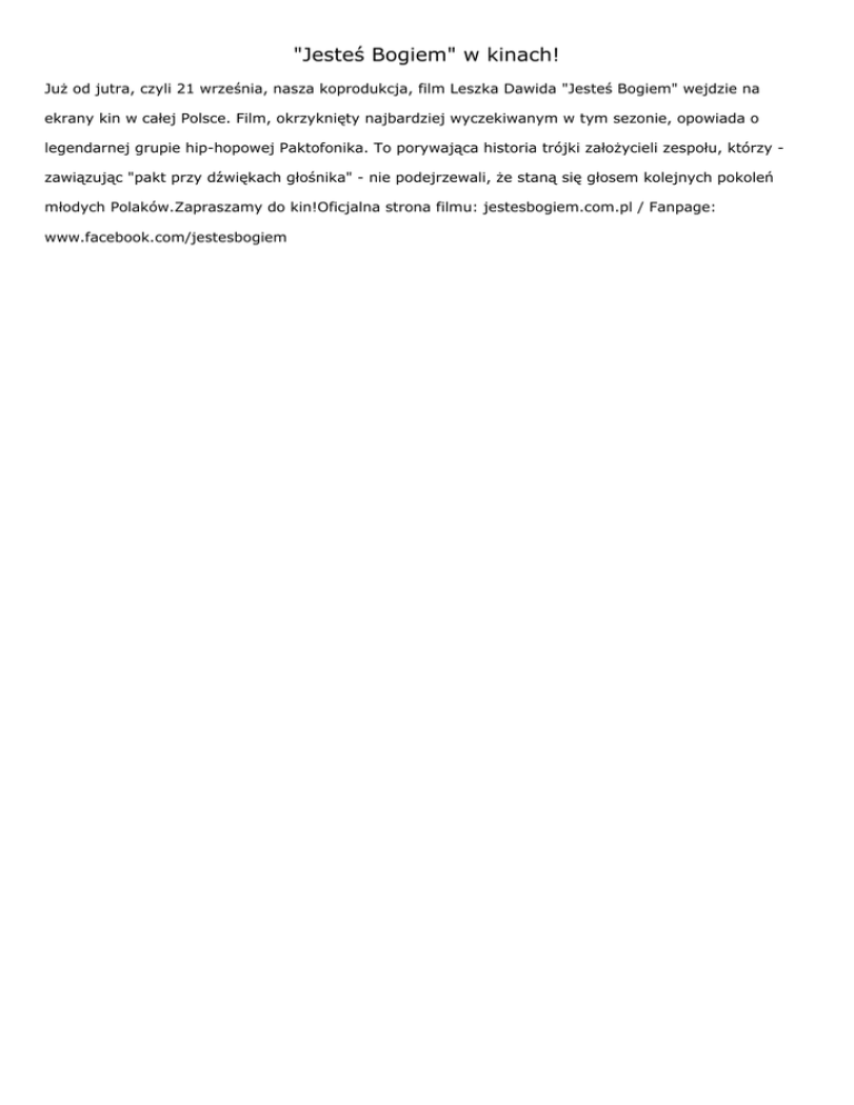 "Jesteś Bogiem" w kinach! Już od jutra, czyli 21 września, nasza koprodukcja, film Leszka Dawida "Jesteś Bogiem" wejdzie na ekrany kin w całej Polsce. Film, okrzyknięty najbardziej wyczekiwanym w tym sezonie, opowiada o legendarnej grupie hip-hopowej Paktofonika. To porywająca historia trójki założycieli zespołu, którzy zawiązując "pakt przy dźwiękach głośnika" - nie podejrzewali, że staną się głosem kolejnych pokoleń młodych Polaków.Zapraszamy do kin!Oficjalna strona filmu: jestesbogiem.com.pl / Fanpage: www.facebook.com/jestesbogiem