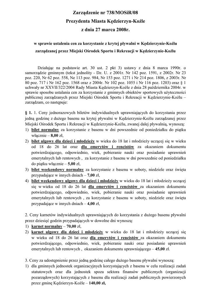 Zarządzenie nr 738/MOSiR/08 Prezydenta Miasta Kędzierzyn-Koźle z dnia 27 marca 2008r. w sprawie ustalenia cen za korzystanie z krytej pływalni w Kędzierzynie-Koźlu zarządzanej przez Miejski Ośrodek Sportu i Rekreacji w Kędzierzynie-Koźlu Działając na podstawie art. 30 ust. 2 pkt 3) ustawy z dnia 8 marca 1990r. o samorządzie gminnym (tekst jednolity - Dz. U. z 2001r. Nr 142 poz. 1591, z 2002r. Nr 23 poz. 220, Nr 62 poz. 558, Ne 113 poz. 984, Nr 153 poz. 1271 i Nr 214 poz. 1806, z 2003r. Nr 80 poz. 717 i Nr 162 poz. 1568 oraz z 2004r. Nr 102 poz. 1055 i Nr 116 poz. 1203) oraz § 1 uchwały nr XXVII/322/2004 Rady Miasta Kędzierzyn-Koźle z dnia 28 października 2004r. w sprawie sposobu ustalania cen za korzystanie z gminnych obiektów sportowych uŜyteczności publicznej zarządzanych przez Miejski Ośrodek Sportu i Rekreacji w Kędzierzynie-Koźlu – zarządzam, co następuje: § 1. 1. Ceny jednorazowych biletów indywidualnych uprawniających do korzystania przez jedną godzinę z duŜego basenu na krytej pływalni w Kędzierzynie-Koźlu zarządzanej przez Miejski Ośrodek Sportu i Rekreacji w Kędzierzynie-Koźlu, zwanej dalej pływalnią, wynoszą: 1) bilet normalny za korzystanie z basenu w dni powszednie od poniedziałku do piątku włącznie – 8,00 zł, 2) bilet ulgowy dla dzieci i młodzieŜy w wieku do 18 lat i młodzieŜy uczącej się w wieku od 18 do 26 lat oraz dla emerytów i rencistów za okazaniem dokumentu potwierdzającego, odpowiednio, wiek, pobieranie nauki oraz posiadanie uprawnień emerytalnych lub rentowych , za korzystanie z basenu w dni powszednie od poniedziałku do piątku włącznie – 5,00 zł, 3) bilet weekendowy normalny za korzystanie z basenu w soboty, niedziele oraz święta przypadające w innych dniach – 7,00 zł, 4) bilet weekendowy ulgowy dla dzieci i młodzieŜy w wieku do 18 lat i młodzieŜy uczącej się w wieku od 18 do 26 lat dla emerytów i rencistów za okazaniem dokumentu potwierdzającego, odpowiednio, wiek, pobieranie nauki oraz posiadanie uprawnień emerytalnych lub rentowych , za korzystanie z basenu w soboty, niedziele oraz święta przypadające w innych dniach – 4,00 zł, 2. Ceny karnetów indywidualnych uprawniających do korzystania z duŜego basenu pływalni przez dziesięć godzin przypadających w dowolne dni wynoszą: 1) karnet normalny – 70,00 zł, 2) karnet ulgowy dla dzieci i młodzieŜy w wieku do 18 lat i młodzieŜy uczącej się w wieku od 18 do 26 lat oraz dla emerytów i rencistów za okazaniem dokumentu potwierdzającego, odpowiednio, wiek, pobieranie nauki oraz posiadanie uprawnień emerytalnych lub rentowych , okazaniem dokumentu uprawniającego – 45,00 zł. 3. Ceny za udostępnienie przez jedną godzinę całego duŜego basenu pływalni wynoszą: 1) dla gminnych jednostek organizacyjnych korzystających z basenu w celu realizacji zadań statutowych oraz dla jednostek spoza sektora finansów publicznych (organizacji pozarządowych) korzystających z basenu dla realizacji zadań publicznych powierzonych przez gminę Kędzierzyn-Koźle – 140,00 zł, 2) dla szkół i innych placówek oświatowych, dla których organem prowadzącym jest Powiat Kędzierzyńsko-Kozielski – 185,00 zł, 3) dla osób fizycznych oraz osób prawnych i jednostek organizacyjnych nieposiadających osobowości prawnej innych niŜ wymienione w pkt. 1) i 2) – 230,00 zł. 4. Ceny za udostępnienie przez jedną godzinę jednego toru duŜego basenu pływalni wynoszą: 1) dla gminnych jednostek organizacyjnych korzystających z basenu w celu realizacji zadań statutowych oraz dla jednostek spoza sektora finansów publicznych (organizacji pozarządowych) korzystających z basenu dla realizacji zadań publicznych powierzonych przez gminę Kędzierzyn-Koźle – 32,00 zł, 2) dla szkół i innych placówek oświatowych, dla których organem prowadzącym jest jest Powiat Kędzierzyńsko-Kozielski – 38,50 zł, 3) dla osób fizycznych oraz osób prawnych i jednostek organizacyjnych nieposiadających osobowości prawnej innych niŜ wymienione w pkt. 1) i 2) – 45,00 zł. § 2. 1. Ceny jednorazowych biletów indywidualnych uprawniających do korzystania przez jedną godzinę z małego basenu pływalni wynoszą: 1) bilet za korzystanie z basenu w dni powszednie od poniedziałku do piątku włącznie – 4,50 zł, 2) bilet weekendowy za korzystanie z basenu w soboty, niedziele oraz święta przypadające w innych dniach – 3,50 zł. 2. Cena karnetu indywidualnego uprawniającego do korzystania z małego basenu pływalni przez dziesięć godzin przypadających w dowolne dni wynosi 36,00 zł. 3. Ceny za udostępnienie przez jedną godzinę całego małego basenu pływalni wynoszą: 1) dla gminnych jednostek organizacyjnych korzystających z basenu w celu realizacji zadań statutowych oraz dla jednostek spoza sektora finansów publicznych (organizacji pozarządowych) korzystających z basenu dla realizacji zadań publicznych powierzonych przez gminę Kędzierzyn-Koźle – 60,00 zł, 2) dla szkół i innych placówek oświatowych, dla których organem prowadzącym jest jest Powiat Kędzierzyńsko-Kozielski – 80,00 zł, 3) dla osób fizycznych oraz osób prawnych i jednostek organizacyjnych nieposiadających osobowości prawnej innych niŜ wymienione w pkt. 1 i 2)) – 100,00 zł. § 3. 1. Cena biletu indywidualnego za korzystanie z sauny na pływalni przez 1,5 h wynosi 15 zł. 2. Cena karnetu indywidualnego uprawniającego do korzystania z sauny przez 15 godzin przypadających w dowolne dni wynosi 125,00 zł. 3. Cena za udostępnienie całej sauny na pływalni na 1,5 h wynosi 125 zł. § 4. 1. Cena za wypoŜyczenie czepka na pływalni wynosi 1,00 zł. 2. Cena za skorzystanie z szatni ogólnej na pływalni wynosi 0,50 zł. 3. Cena za skorzystanie z sanitariatów na pływalni wynosi 1.00 zł. § 5. Ceny podane w § 1 ust. 3 i 4 oraz w § 2 ust. 3 i 4 mają charakter cen netto i podlegają zwiększeniu o naleŜny podatek od towarów i 