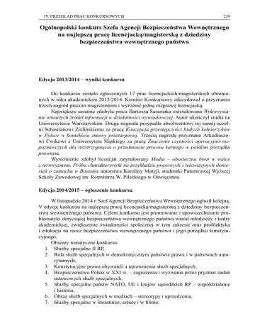 IV. PRZEGLĄD PRAC KONKURSOWYCH 259 Ogólnopolski konkurs Szefa Agencji Bezpieczeństwa Wewnętrznego na najlepszą pracę licencjacką/magisterską z dziedziny bezpieczeństwa wewnętrznego państwa Edycja 2013/2014 – wyniki konkursu Do konkursu zostało zgłoszonych 17 prac licencjackich/magisterskich obronionych w roku akademickim 2013/2014. Komitet Konkursowy zdecydował o przyznaniu trzech nagród pracom magisterskim i wyróżnić jedną rozprawę licencjacką. Największe uznanie zdobyła praca Bartosza Saramaka zatytułowana Wykorzystanie otwartych źródeł informacji w działalności wywiadowczej. Autor ukończył studia na Uniwersytecie Warszawskim. Druga nagroda przypadła absolwentowi tej samej uczelni Sebastianowi Zielińskiemu za pracę Koncepcja przestępczości białych kołnierzyków w Polsce w kontekście zmowy przetargowej. Trzecią nagrodę przyznano Arkadiuszowi Ćwikowi z Uniwersytetu Śląskiego za pracę Znaczenie czynności operacyjno-rozpoznawczych dla rozstrzygnięcia o przedmiocie procesu karnego w polskim porządku prawnym. Wyróżnienie zdobył licencjat zatytułowany Media – obosieczna broń w walce z terroryzmem. Próba charakterystyki na przykładzie prasowych i telewizyjnych doniesień o zamachu w Bostonie autorstwa Karoliny Matyji, studentki Państwowej Wyższej Szkoły Zawodowej im. Rotmistrza W. Pileckiego w Oświęcimiu. Edycja 2014/2015 – ogłoszenie konkursu W listopadzie 2014 r. Szef Agencji Bezpieczeństwa Wewnętrznego ogłosił kolejną, V edycję konkursu na najlepszą pracę licencjacką/magisterską z dziedziny bezpieczeństwa wewnętrznego państwa. Celem konkursu jest promowanie i upowszechnianie problematyki dotyczącej bezpieczeństwa wewnętrznego państwa wśród młodzieży i kadry akademickiej, zwiększenie świadomości społecznej w tym zakresie oraz profilaktyka i edukacja na rzecz bezpieczeństwa wewnętrznego państwa i jego porządku konstytucyjnego. Obszary tematyczne konkursu: 1. Służby specjalne II RP, 2. Rola służb specjalnych w demokratycznym państwie prawa i w państwach autorytarnych, 3. Konstytucyjne prawa obywateli a uprawnienia służb specjalnych, 4. Bezpieczeństwo Polski w XXI w. – zagrożenia i wyzwania przez pryzmat zadań ustawowych służb specjalnych, 5. Służby specjalne państw NATO, UE i krajów sąsiedzkich RP – współdziałanie i historia, 6. Obraz służb specjalnych w mediach – stereotypy i uprzedzenia, 7. Służby specjalne w literaturze, sztuce i w filmie. 260 PRZEGLĄD BEZPIECZEŃSTWA WEWNĘTRZNEGO 12/15 Uczestnicy mogą zgłosić do konkursu własną pracę licencjacką lub magisterską napisaną w języku polskim i obronioną na oceną bardzo dobrą w roku akademickim 2014/2015. Prace powinny być przesyłane w wersji papierowej i elektronicznej (mailowej) wraz z wypełnionym formularzem zgłoszenia (plik do pobrania). Do pracy powinny być dołączone opinie promotora lub recenzentów i ich pisemna zgoda na wykorzystanie opinii lub recenzji dla celów konkursu. Prace powinny być przesyłane pod adres: Gabinet Szefa ABW 00-993 Warszawa ul. Rakowiecka 2a z dopiskiem „KONKURS” e-mail: [email protected] Prace należy przesyłać do 30 września 2015 r. (decyduje data stempla pocztowego). Prace będzie oceniać Komitet Konkursowy wyłoniony przez Szefa ABW. Komitet wyłoni laureatów konkursu: I, II i III miejsce oraz wyróżnienia, w terminie do 30 listopada 2015 r. Wyniki konkursu zostaną opublikowane na stronie internetowej www.abw.gov.pl, w ciągu 14 dni od momentu wyłonienia laureatów przez Komitet Konkursowy. Laureaci i ich macierzyste uczelnie otrzymają również pisemne powiadomienia. Nagrody: I nagroda – 3000 zł i opublikowanie fragmentów pracy w „Przeglądzie Bezpieczeństwa Wewnętrznego”, II nagroda – 2500 zł i opublikowanie fragmentów pracy w „Przeglądzie Bezpieczeństwa Wewnętrznego”, III nagroda – 2000 zł i opublikowanie fragmentów pracy w „Przeglądzie Bezpieczeństwa Wewnętrznego”. Wyróżnienia: nagroda rzeczowa i opublikowanie fragmentów pracy w „Przeglądzie Bezpieczeństwa Wewnętrznego”. Osoby biorące udział w konkursie Szefa ABW muszą oświadczyć, że wyrażają zgodę na upowszechnienie treści zawartych w ich pracach dla celów promocji tematyki bezpieczeństwa państwa oraz dla celów służbowych ABW. Wyrażają również zgodę na gromadzenie i przetwarzanie podanych przez nich danych osobowych i mają prawo dostępu do treści swoich danych i ich poprawiania zgodnie z przepisami Ustawy z dnia 29 sierpnia 1997 r.o ochronie danych osobowych (Dz.U. z 2002 r. Nr 101, poz. 926 z późn. zm.).