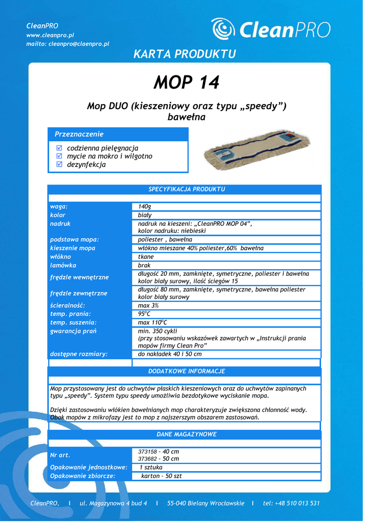 CleanPRO www.cleanpro.pl mailto: [email protected] KARTA PRODUKTU MOP 14 Mop DUO (kieszeniowy oraz typu „speedy”) bawełna Przeznaczenie codzienna pielęgnacja mycie na mokro i wilgotno dezynfekcja SPECYFIKACJA PRODUKTU waga: kolor nadruk podstawa mopa: kieszenie mopa włókno lamówka frędzle wewnętrzne frędzle zewnętrzne ścieralność: temp. prania: temp. suszenia: gwarancja prań dostępne rozmiary: 140g biały nadruk na kieszeni: „CleanPRO MOP 04”, kolor nadruku: niebieski poliester , bawełna włókno mieszane 40% poliester,60% bawełna tkane brak długość 20 mm, zamknięte, symetryczne, poliester i bawełna kolor biały surowy, ilość ściegów 15 długość 80 mm, zamknięte, symetryczne, bawełna poliester kolor biały surowy max 3% 95oC max 110oC min. 350 cykli (przy stosowaniu wskazówek zawartych w „Instrukcji prania mopów firmy Clean Pro” do nakładek 40 i 50 cm DODATKOWE INFORMACJE Mop przystosowany jest do uchwytów płaskich kieszeniowych oraz do uchwytów zapinanych typu „speedy”. System typu speedy umożliwia bezdotykowe wyciskanie mopa. Dzięki zastosowaniu włókien bawełnianych mop charakteryzuje zwiększona chłonność wody. Obok mopów z mikrofazy jest to mop z najszerszym obszarem zastosowań. DANE MAGAZYNOWE Nr art. 373158 – 40 cm 373682 – 50 cm Opakowanie jednostkowe: Opakowanie zbiorcze: 1 sztuka karton – 50 szt CleanPRO, I mail: [email protected] www.cleanpro.pl ul. Magazynowa 4 bud 4 I 55-040 Bielany Wrocławskie I tel: +48 510 013 531