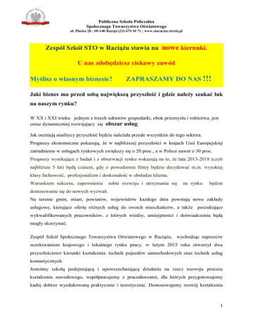 Publiczna Szkoła Policealna Społecznego Towarzystwa Oświatowego ul. Płocka 28 ; 09-140 Raciąż;(23) 679 10 71 ; www.storaciaz.strefa.pl Zespół Szkół STO w Raciążu stawia na nowe kierunki. U nas zdobędziesz ciekawy zawód Myślisz o własnym biznesie? ZAPRASZAMY DO NAS !!! Jaki biznes ma przed sobą największą przyszłość i gdzie należy szukać luk na naszym rynku? W XX i XXI wieku jednym z trzech sektorów gospodarki, obok przemysłu i rolnictwa, jest coraz dynamiczniej rozwijający się obszar usług. Jak oceniają analitycy przyszłość będzie należała przede wszystkim do tego sektora. Prognozy ekonomiczne pokazują, że w najbliższej przyszłości w krajach Unii Europejskiej zatrudnienie w usługach rynkowych zwiększy się o 20 proc., a w Polsce nawet o 30 proc. Prognozy wynikające z badań i z obserwacji rynku wskazują na to, że lata 2013-2018 (czyli najbliższe 5 lat) będą czasem, gdy o powodzeniu firmy będzie decydować m.in. wysokiej klasy fachowość, profesjonalizm i doskonałość w obsłudze klienta. Warunkiem sukcesu, zapewnienia sobie rozwoju i utrzymania się na rynku będzie dostosowanie się do nowych wyzwań. Na terenie gmin, miast, powiatów, województw każdego dnia powstają nowe zakłady usługowe, kierujące ofertę różnych usług do swoich mieszkańców, a także poszukujące wykwalifikowanych pracowników, z których wiedzy, umiejętności i doświadczenia będą mogły skorzystać. Zespół Szkół Społecznego Towarzystwa Oświatowego w Raciążu, wychodząc naprzeciw oczekiwaniom krajowego i lokalnego rynku pracy, w lutym 2015 roku otworzył dwa przyszłościowe kierunki kształcenia: technik pojazdów samochodowych oraz technik usług kosmetycznych. Jesteśmy szkołą podejmującą i upowszechniającą działania na rzecz rozwoju procesu kształcenia zawodowego, współpracujemy z pracodawcami, dla których przygotowujemy kadrę dobrze wyedukowaną praktycznie i teoretycznie. Dostosowujemy rozwój kształcenia 1 Publiczna Szkoła Policealna Społecznego Towarzystwa Oświatowego ul. Płocka 28 ; 09-140 Raciąż;(23) 679 10 71 ; www.storaciaz.strefa.pl zawodowego do potrzeb pracodawców, lokalnych rynków pracy oraz nowoczesnej i innowacyjnej gospodarki. Naszym priorytetem jest nakierowanie oferty edukacyjnej szkół zawodowych na lokalny rynek pracy. Jedną z perspektyw rozwoju szkoły jest otwarcie jej na środowisko zewnętrzne, uwolnienie zasobów wiedzy dla każdego w dowolnym miejscu i czasie. Taka wizja nowoczesnej szkoły jest możliwa dzięki udostępnianiu słuchaczom nowoczesnych form kształcenia w formie m.in. platformy e-lerningowej, możliwości korzystania z tablic interaktywnych, pracowni multimedialnej i komputerowej oraz nowoczesnych metod nauki języków obcych. Celem Zespołu Szkół Społecznego Towarzystwa Oświatowego w Raciążu jest przygotowanie uczących się do życia w warunkach współczesnego świata, wykonywania pracy zawodowej i aktywnego funkcjonowania na zmieniającym się rynku pracy. Technik Usług Kosmetycznych Rynek kosmetyczny jest w obecnych czasach jednym z najbardziej dynamicznych rynków w Polsce i na świecie. Ciągle wzrasta liczba gabinetów kosmetycznych, salonów odnowy biologicznej czy fitness klubów. Ich pojawianie się jest odpowiedzią na zwiększające się zainteresowanie tego typu usługami. Zapotrzebowanie na specjalistów z zakresu kosmetyki oraz pielęgnacji zdrowia i urody jest w Polsce coraz większe. Od 1990 roku rynek kosmetyczny jest jednym z najbardziej dynamicznie rozwijających się w Polsce i na świecie. Według prognoz ekspertów z Instytutu Badań Rynku, Konsumpcji i Koniunktur w 2020 r. np. w Warszawie największy popyt będzie na pracowników w usługach osobistych (m.in. kosmetycznych). W najbliższych latach należy oczekiwać kontynuacji aktualnego trendu wzrostowego na rynku usług kosmetycznych w Polsce. Zarówno wzrost wynagrodzeń i poziomu życia, jak i zmiany stylu życia, nawyków higienicznych, pielęgnacji, świadomości potrzeb konsumentów dają pozytywne perspektywy. Jak wskazują wyniki analiz w Polsce w okresie ostatnich dwóch lat nastąpił dynamiczny wzrost wszystkich analizowanych elementów rynku usług kosmetycznych. Sytuacja ta przypuszczalnie jest wynikiem światowych makro-trendów, wzrostu dochodów ludności, zmian stylu życia i wartości, działań marketingowych oraz preferencji konsumentów. 2 Publiczna Szkoła Policealna Społecznego Towarzystwa Oświatowego ul. Płocka 28 ; 09-140 Raciąż;(23) 679 10 71 ; www.storaciaz.strefa.pl Wzrasta zapotrzebowanie na usługi związane z urodą, dobrą inwestycją w przyszłość są więc salony piękności. W cenie są ci, którzy potrafią wykreować mniej lub bardziej wyrafinowane usługi typu "beauty". Innowacyjne pomysły będą nagradzane za pierwszeństwo. Szkoła o kierunku technik usług kosmetycznych wychodzi naprzeciw potrzebom rynku pracy jak i samych uczniów, którzy chcą się rozwijać w tym kierunku. W dzisiejszych czasach coraz większą wagę przykładamy do wyglądu, staje się on znakiem określającym nasze miejsce w społeczeństwie, jest zewnętrznym obrazem osobowości, gestów estetycznych, świadomości kulturowej oraz gwarantem zawodowego sukcesu. Obecne czasy wymuszają na nas coraz większą dbałość o wizerunek zewnętrzny, z tego powodu rośnie zapotrzebowanie na specjalistów w tej dziedzinie. Zachętą do kształcenia się w tym przyszłościowym zawodzie jest możliwość uruchomienia własnej działalności gospodarczej oraz możliwość skorzystania z dotacji unijnych. Zawód kosmetyczki daje szansę współpracy z wieloma nowoczesnymi firmami kosmetycznymi, stwarzając szerokie możliwości pracy w gabinetach kosmetycznych, gabinetach odnowy biologicznej, gabinetach medycyny estetycznej, salonach urody, SPA, w działach kosmetycznych w centrach handlowych, jako przedstawiciel handlowy firmy kosmetycznej zarówno z rynku detalicznego jak i profes