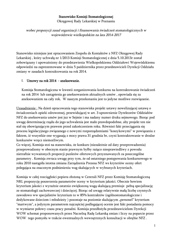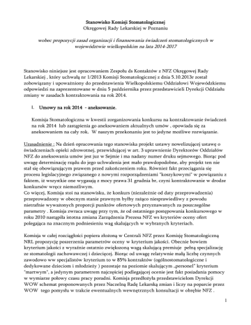 Stanowisko Komisji Stomatologicznej Okręgowej Rady Lekarskiej w Poznaniu wobec propozycji zasad organizacji i finansowania świadczeń stomatologicznych w województwie wielkopolskim na lata 2014-2017 Stanowisko niniejsze jest opracowaniem Zespołu ds Kontaktów z NFZ Okręgowej Rady Lekarskiej , który uchwałą nr 1/2013 Komisji Stomatologicznej z dnia 5.10.2013r został zobowiązany i upoważniony do przedstawienia Wielkopolskiemu Oddziałowi Wojewódzkiemu odpowiedzi na zaprezentowane w dniu 5 października przez przedstawicieli Dyrekcji Oddziału zmiany w zasadach kontraktowania na rok 2014. I. Umowy na rok 2014 - aneksowanie. Komisja Stomatologiczna w kwestii zorganizowania konkursu na kontraktowanie świadczeń na rok 2014 lub zastąpienia go aneksowaniem aktualnych umów , opowiada się za aneksowaniem na cały rok. W naszym przekonaniu jest to jedyne możliwe rozwiązanie. Uzasadnienie : Na dzień opracowania tego stanowiska projekt ustawy nowelizującej ustawę o świadczeniach opieki zdrowotnej, przewidującej w art. 3 uprawnienie Dyrektorów Oddziałów NFZ do aneksowania umów jest juz w Sejmie i ma nadany numer druku sejmowego. Biorąc pod uwagę determinację rządu do jego uchwalenia jest mało prawdopodobne, aby projekt ten nie stał się obowiązującym prawem przed zakończeniem roku. Również fakt przeciągania się procesu legislacyjnego związanego z nowymi rozporządzeniami "koszykowymi" w powiązaniu z faktem, iż wszystkie one wygasają z mocy prawa 31 grudnia br, czyni kontraktowanie w drodze konkursów wręcz niemożliwym. Co więcej, Komisja stoi na stanowisku, że konkurs (niezależnie od daty przeprowadzenia) przeprowadzony w obecnym stanie prawnym byłby rażąco niesprawiedliwy z powodu nietrafnie wyważonych proporcji punktów ofertowych przyznawanych za poszczególne parametry . Komisja zwraca uwagę przy tym, że od ostatniego postępowania konkursowego w roku 2010 nastąpiła istotna zmiana Zarządzenia Prezesa NFZ ws kryteriów oceny ofert polegająca na znacznym podniesieniu wag skalujących w wybranych kryteriach. Komisja w całej rozciągłości popiera złożoną w Centrali NFZ przez Komisję Stomatologiczną NRL propozycję poszerzenia parametrów oceny w kryterium jakości. Obecnie bowiem kryterium jakości z wyraźnie ostatnio zwiększoną wagą skalującą premiuje pełną specjalizację ze stomatologii zachowawczej i dziecięcej. Biorąc od uwagę relatywnie małą liczbę czynnych zawodowo ww specjalistów kryterium to w 85% kontraktów (ogólnostomatologiczne i dedykowane dzieciom i młodzieży ) pozostaje na poziomie skalującym „personel” kryterium "martwym", a jedynym parametrem najczęściej podlegającej ocenie jest fakt posiadania pomocy w wymiarze połowy czasu pracy poradni. Komisja przedłożyła przedstawicielom Dyrekcji WOW schemat proponowanych przez Naczelną Radę Lekarską zmian i liczy na poparcie przez WOW tego pomysłu w trakcie ewentualnych wewnętrznych konsultacji w obrębie NFZ . 1 II. Budżet na Stomatologię w Wielkopolsce - brak akceptacji. Stomatologia w obrębie budżetu WOW od lat wykazuje znaczące niedofinansowanie. Co ważne- występowało ono również w latach uważanych za bezpieczne z punktu widzenia bilansowania przychodów z wydatkami(lata 2006-2008) . Pod względem udziału stomatologii w planie finansowym oddziałów Wielkopolska od lat plasowała się na 13 lub 14 miejscu. Kluczowym zestawieniem odzwierciedlającym niedofinansowanie stomatologii w Wielkopolsce jest zaprezentowane ostatnio w Sejmie w związku z raportem NIK dotyczącym leczenia stomatologicznego opracowanie Centrali NFZ "Leczenie stomatologiczne w 2013r" . Na stronie 5 znajduje się tam tabela z wyliczeniem kwot rocznych nakładów przypadających na 1 ubezpieczonego. Wielkopolska z kwotą 44 zł znajduje się w tym zestawieniu na trzecim miejscu od końca. Z materiałów otrzymanych od WOW oraz z relacji złożonej na posiedzeniu KS WIL przez Zastępcę Dyrektora WOW wynika, że powodem ruchów finansowych jest niski współczynnik zakupu świadczeń stomatologicznych. Komisja upatruje przyczyn tego stanu rzeczy właśnie w chronicznym niedofinansowaniu tego rodzaju świadczeń. Zaproponowane zmniejszenie planu zakupów świadczeń stomatologicznych na 2014 rok o 6 mln zł zepchnie zapewne Wielkopolskę w tym zestawieniu na ostatnie miejsce. 2 Postulat : skoro tyle uwagi poświęca się "uśrednianiu" wskaźników , zasadne byłoby takie określenie wielkości zakupów świadczeń stomatologicznych przez WOW , aby Wielkopolska mogła znaleźć się w środku zestawienia , jakie sporządzone zostało w omawianym opracowaniu Centrali NFZ - w zestawieniu nakładów na stomatologię per capita. Zdziwienie budzić musi ponadto nierównomierność redukcji planu zakupów w poszczególnych rodzajach. Przeprowadzone na podstawie kolejnych sprawozdań finansowych NFZ wyliczenia dowodzą, że zarówno w skali kraju jak i w Wielkopolsce pozostałe rodzaje świadczeń ambulatoryjnych jak POZ i AOS mają bardziej "stabilne" niż stomatologia finansowanie. Również w przypadku planowanych obecnie redukcji stomatologia obok rehabilitacji ma największą zaplanowaną redukcję. III. Wartość punktu rozliczeniowego-- zaniżenia nieuzasadnione. Propozycja obniżki wartości punktów rozliczeniowych w poszczególnych zakresach nie może rzecz jasna liczyć na pełne zrozumienie Komisji. Naszym zdaniem jest to wynik uwarunkowań opisanych w pkt. II . Przyjęcie i realizacja zgłoszonego w pkt. II postulatu określenia wielkości zakupów umiejscawiających Wielkopolskę w środku stawki nakładów per capita pozwoliłoby zdaniem Komisji utrzymać obecne wartości punktów rozliczeniowych bez konieczności redukcji ilości zaplanowanych do zakupu świadczeń . Argument ten znajduje potwierdzenie również w wyliczeniach kosztów udzielania świadczeń . Komisja Stomatologiczna NRL dysponuje wyliczeniami kosztów poszczególnych świadczeń stomato