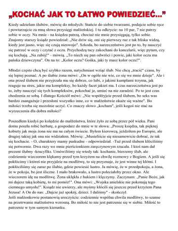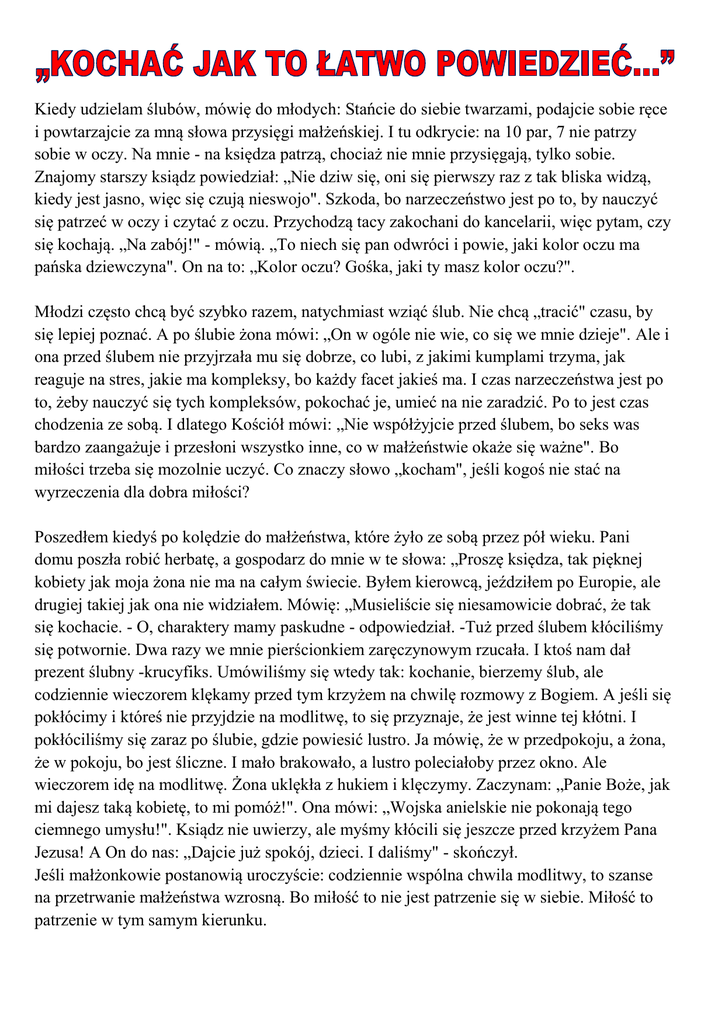Kiedy udzielam ślubów, mówię do młodych: Stańcie do siebie twarzami, podajcie sobie ręce i powtarzajcie za mną słowa przysięgi małżeńskiej. I tu odkrycie: na 10 par, 7 nie patrzy sobie w oczy. Na mnie - na księdza patrzą, chociaż nie mnie przysięgają, tylko sobie. Znajomy starszy ksiądz powiedział: „Nie dziw się, oni się pierwszy raz z tak bliska widzą, kiedy jest jasno, więc się czują nieswojo". Szkoda, bo narzeczeństwo jest po to, by nauczyć się patrzeć w oczy i czytać z oczu. Przychodzą tacy zakochani do kancelarii, więc pytam, czy się kochają. „Na zabój!" - mówią. „To niech się pan odwróci i powie, jaki kolor oczu ma pańska dziewczyna". On na to: „Kolor oczu? Gośka, jaki ty masz kolor oczu?". Młodzi często chcą być szybko razem, natychmiast wziąć ślub. Nie chcą „tracić" czasu, by się lepiej poznać. A po ślubie żona mówi: „On w ogóle nie wie, co się we mnie dzieje". Ale i ona przed ślubem nie przyjrzała mu się dobrze, co lubi, z jakimi kumplami trzyma, jak reaguje na stres, jakie ma kompleksy, bo każdy facet jakieś ma. I czas narzeczeństwa jest po to, żeby nauczyć się tych kompleksów, pokochać je, umieć na nie zaradzić. Po to jest czas chodzenia ze sobą. I dlatego Kościół mówi: „Nie współżyjcie przed ślubem, bo seks was bardzo zaangażuje i przesłoni wszystko inne, co w małżeństwie okaże się ważne". Bo miłości trzeba się mozolnie uczyć. Co znaczy słowo „kocham", jeśli kogoś nie stać na wyrzeczenia dla dobra miłości? Poszedłem kiedyś po kolędzie do małżeństwa, które żyło ze sobą przez pół wieku. Pani domu poszła robić herbatę, a gospodarz do mnie w te słowa: „Proszę księdza, tak pięknej kobiety jak moja żona nie ma na całym świecie. Byłem kierowcą, jeździłem po Europie, ale drugiej takiej jak ona nie widziałem. Mówię: „Musieliście się niesamowicie dobrać, że tak się kochacie. - O, charaktery mamy paskudne - odpowiedział. -Tuż przed ślubem kłóciliśmy się potwornie. Dwa razy we mnie pierścionkiem zaręczynowym rzucała. I ktoś nam dał prezent ślubny -krucyfiks. Umówiliśmy się wtedy tak: kochanie, bierzemy ślub, ale codziennie wieczorem klękamy przed tym krzyżem na chwilę rozmowy z Bogiem. A jeśli się pokłócimy i któreś nie przyjdzie na modlitwę, to się przyznaje, że jest winne tej kłótni. I pokłóciliśmy się zaraz po ślubie, gdzie powiesić lustro. Ja mówię, że w przedpokoju, a żona, że w pokoju, bo jest śliczne. I mało brakowało, a lustro poleciałoby przez okno. Ale wieczorem idę na modlitwę. Żona uklękła z hukiem i klęczymy. Zaczynam: „Panie Boże, jak mi dajesz taką kobietę, to mi pomóż!". Ona mówi: „Wojska anielskie nie pokonają tego ciemnego umysłu!". Ksiądz nie uwierzy, ale myśmy kłócili się jeszcze przed krzyżem Pana Jezusa! A On do nas: „Dajcie już spokój, dzieci. I daliśmy" - skończył. Jeśli małżonkowie postanowią uroczyście: codziennie wspólna chwila modlitwy, to szanse na przetrwanie małżeństwa wzrosną. Bo miłość to nie jest patrzenie się w siebie. Miłość to patrzenie w tym samym kierunku.