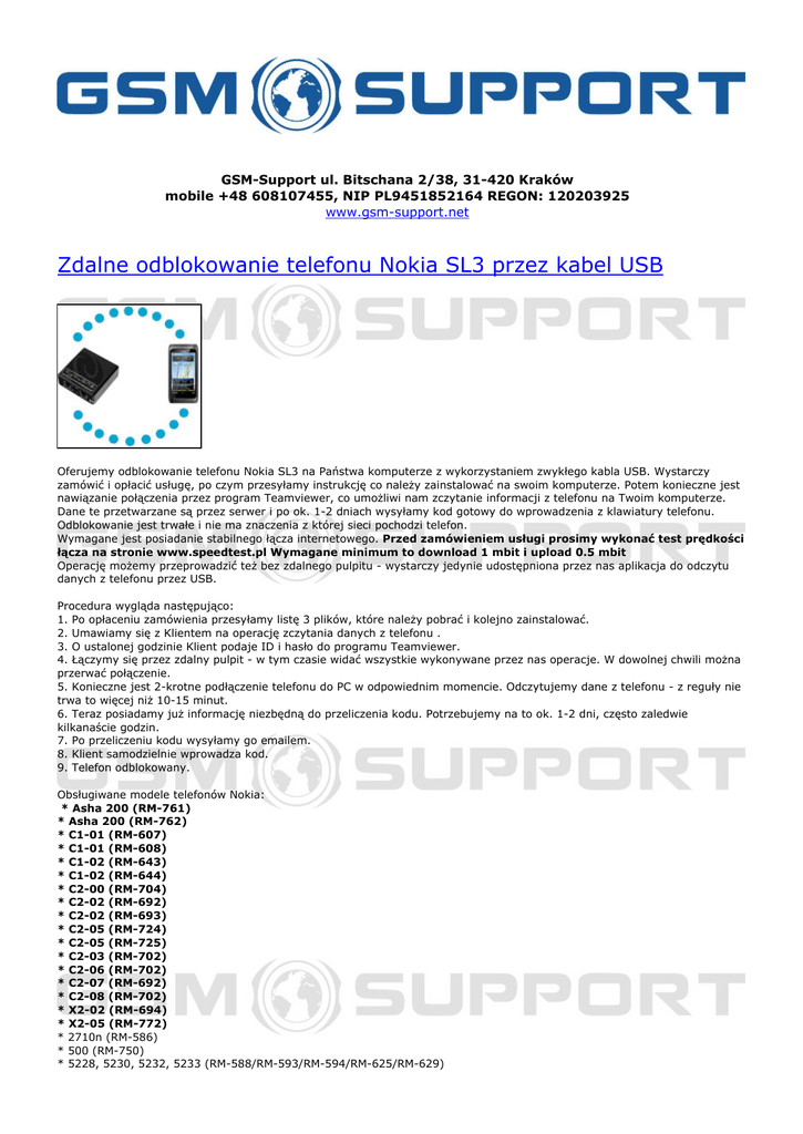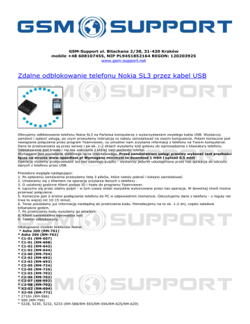 GSM-Support ul. Bitschana 2/38, 31-420 Kraków mobile +48 608107455, NIP PL9451852164 REGON: 120203925 www.gsm-support.net Zdalne odblokowanie telefonu Nokia SL3 przez kabel USB Oferujemy odblokowanie telefonu Nokia SL3 na Państwa komputerze z wykorzystaniem zwykłego kabla USB. Wystarczy zamówić i opłacić usługę, po czym przesyłamy instrukcję co należy zainstalować na swoim komputerze. Potem konieczne jest nawiązanie połączenia przez program Teamviewer, co umożliwi nam zczytanie informacji z telefonu na Twoim komputerze. Dane te przetwarzane są przez serwer i po ok. 1-2 dniach wysyłamy kod gotowy do wprowadzenia z klawiatury telefonu. Odblokowanie jest trwałe i nie ma znaczenia z której sieci pochodzi telefon. Wymagane jest posiadanie stabilnego łącza internetowego. Przed zamówieniem usługi prosimy wykonać test prędkości łącza na stronie www.speedtest.pl Wymagane minimum to download 1 mbit i upload 0.5 mbit Operację możemy przeprowadzić też bez zdalnego pulpitu - wystarczy jedynie udostępniona przez nas aplikacja do odczytu danych z telefonu przez USB. Procedura wygląda następująco: 1. Po opłaceniu zamówienia przesyłamy listę 3 plików, które należy pobrać i kolejno zainstalować. 2. Umawiamy się z Klientem na operację zczytania danych z telefonu . 3. O ustalonej godzinie Klient podaje ID i hasło do programu Teamviewer. 4. Łączymy się przez zdalny pulpit - w tym czasie widać wszystkie wykonywane przez nas operacje. W dowolnej chwili można przerwać połączenie. 5. Konieczne jest 2-krotne podłączenie telefonu do PC w odpowiednim momencie. Odczytujemy dane z telefonu - z reguły nie trwa to więcej niż 10-15 minut. 6. Teraz posiadamy już informację niezbędną do przeliczenia kodu. Potrzebujemy na to ok. 1-2 dni, często zaledwie kilkanaście godzin. 7. Po przeliczeniu kodu wysyłamy go emailem. 8. Klient samodzielnie wprowadza kod. 9. Telefon odblokowany. Obsługiwane modele telefonów Nokia: * Asha 200 (RM-761) * Asha 200 (RM-762) * C1-01 (RM-607) * C1-01 (RM-608) * C1-02 (RM-643) * C1-02 (RM-644) * C2-00 (RM-704) * C2-02 (RM-692) * C2-02 (RM-693) * C2-05 (RM-724) * C2-05 (RM-725) * C2-03 (RM-702) * C2-06 (RM-702) * C2-07 (RM-692) * C2-08 (RM-702) * X2-02 (RM-694) * X2-05 (RM-772) * 2710n (RM-586) * 500 (RM-750) * 5228, 5230, 5232, 5233 (RM-588/RM-593/RM-594/RM-625/RM-629) * * * * * * * * * * * * * * * * * * * * * * * * * * * * * * * * * * * * * * * * * * * * * * * * * 5530 (RM-504) 5630 (RM-431) 5730 Xpress Music (RM-465) 5800d (RM-356/RM-428) 600 (RM-701) 6120c (RM-243) 6350 (RM-455) 6700 Classic (RM-470) 6700s Slide (RM-576) 6710s Navigator (RM-491) 6720c (RM-424/RM-566) 6730c-1 (RM-547) 6750 Mural (RM-381) 6760s (RM-573) 6790s (RM-492/RM-599) 700 (RM-670) 701 (RM-774) 7020a (RM-497) 702T (RM-730) 7210c, 7212c (RM-436) C3-00 (RM-614) C3-01 (RM-640) C5-00 (RM-645/RM-688) C5-03 (RM-697) C6-00 (RM-612/RM-624) C6-01 (RM-601) C7-00 (RM-675) E5-00 (RM-632) E52 (RM-469) E55 (RM-482) E6-00 (RM-609) E63 (RM-437/RM-450) E66 (RM-343/RM-345/RM-420/RM-494) E7-00 (RM-626) E71 (RM-346/RM-347/RM-357/RM-407/RM-493) E72 (RM-529/RM-530) E73 (RM-658) N8 (RM-596) N86 (RM-484/RM-485/RM-486) N97 (RM-505/RM-506/RM-507) N97-4 mini (RM-555) N97-5 (RM-553) X2-00 (RM-618) X2-01 (RM-709) X2-01.1 (RM-717) X2-03 (RM-709) X3-02 (RM-639) X5-01 (RM-627) X6-00 (RM-551/RM-559) ©2012 www.gsm-support.net Opis ten nie stanowi oferty w rozumieniu Kodeksu Cywilnego. GSM-Support zastrzega sobie prawo do możliwych błędów w opisie produktu. Prosimy o weryfikację z Państwa strony, a w razie wątpliwości o kontakt. GSM-Support ul. Bitschana 2/38 31-420 Kraków POLSKA tel. 608107455 e-mail: [email protected] Powered by TCPDF (www.tcpdf.org)