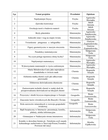 Lp. Temat projektu Przedmiot 1 Najsłynniejsi fizycy Fizyka 2 Zjawisko konwencji Fizyka 3 Ewolucja teorii o budowie materii Fizyka 4 Bryły platońskie Matematyka 5 Jednostki miar i wag na mapie świata Matematyka 6 Twierdzenie pitagorasa a infografika Matematyka 7 Figury geometryczne w naszym otoczeniu Matematyka 8 Paradoksy matematyczne Matematyka 9 Na czym polega tajemnica złotej liczby? Matematyka 10 Najsłynniejsi matematycy Matematyka 11 Wykorzystanie matematyki w życiu codziennym Matematyka 12 Maria Skłodowska-Curie jako największa skandalistka w świecie nauk 13 14 Alchemia matką chemii czyli jak odkrywano pierwiastki Efektowne doświadczenia chemiczne Chemia Opiekun Agnieszka Skorupka Jakub Jarzyna Jakub Jarzyna Agnieszka Smętkowska Agnieszka Smętkowska Grażyna Zygmuntowska Grażyna Zygmuntowska Małgorzata Trela Małgorzata Trela Agnieszka Skorupka Agnieszka Skorupka Bogumiła Smejda Chemia Bogumiła Smejda Chemia Bogumiła Smejda Bogumiła Smejda 15 Zastosowanie techniki chemii w małej skali do przeprowadzania doświadczeń na lekcjach chemii Chemia 16 Przyczyny i skutki kryzysu migracyjnego w Europie Geografia 17 Znaczenie lasów równikowych dla Brazylii i Świata Geografia 18 Rola surowców mineralnych w rozwoju gospodarki światowej 19 Bądź bezpieczny w Internecie- prezentacja, komiks, plakaty, ulotka informacyjna Informatyka 20 Gimnazjum w Nadarzynie-strona internetowa Informatyka 21 Komiks w dowolnej formie pt.: Netykieta czyli zasady kulturalnego zachowania w Sieci.(np:Pixton,Toondoo, Powtoon lub inny) Informatyka Geografia Beata Łaszczewska Beata Łaszczewska Beata Łaszczewska Małgorzata Trela Małgorzata Trela Monika Fijałkowska 22 Prezentacja (Prezi, PowerPoint, Joomag, Movie Maker lub Sway): Historia komputera i Internetu Informatyka 23 Infografika: Bezpieczny Internet Informatyka 24 Wycieczka po Nadarzynie i okolicach – strona internetowa Informatyka 25 Tak kreują nas media WOS 26 Czy autorytety są potrzebne w życiu? WOS 27 Jak mądrze odczytywać reklamę? WOS 28 W jaki sposób gimnazjalista może okazywać patriotyzm? WOS 29 Literacki szlak rowerowy w okolicach Nadarzyna J. polski 30 Życie i twórczość Jarosława Iwaszkiewicza J. polski 31 Literatura i rower J. polski 32 Paweł Hulka – Laskowski, pisarz, tłumacz i publicysta J. polski 33 Autorzy naszych lektur J. polski 34 Dalekie i bliskie podróże bohaterów literackich J. polski 35 Jak Biblia i Mitologia inspirowała i inspiruje artystów ? J. polski 36 Tworzenie parodii lub trawestacji fragmentów utworów literackich J. polski Małgorzata Rec 37 Scenariusz nie lada wyzwanie. Tworzenie autorskich scenariuszy J. polski Małgorzata Rec 38 Literatura jako odbicie przeżyć młodych Polaków podczas II wojny światowej J. polski Beata Syrek 39 Co czyta młodzież? J. polski 40 Ciekawe zakątki w mojej miejscowości J. polski 41 Różne rodzaje miłości w znanych dziełach literatury, malarstwa , rzeźby J. polski 42 Polskie oręże w wojnach XVII wieku Historia 43 44 Nakazane piosenki. Ocalić od zapomnienia Utracone zabytki Warszawy (straty kulturalne i materialne miasta Warszawy z okresu II wojny światowej) Historia Historia Monika Fijałkowska Monika Fijałkowska Monika Fijałkowska Magdalena Drzewucka Magdalena Drzewucka Magdalena Drzewucka Magdalena Drzewucka Grzegorz Sadowski Grzegorz Sadowski Grzegorz Sadowski Grzegorz Sadowski Katarzyna Onyszk Katarzyna Onyszk Katarzyna Onyszk Beata Syrek Beata Syrek Beata Syrek Małgorzata Rec Małgorzata Rec Karolina Podleśna 45 Historyczne wycieczki po Polsce (mapa, przewodnik, gawęda historyczna) Historia Karolina Podleśna 46 Genealogia w praktyce, czyli jak opisać dzieje własnej rodziny Historia Karolina Podleśna 47 Życie kobiet w PRL-u -problemy dnia codziennego Historia 48 Kawaleria polska przed wybuchem II Wojny Światowe Historia 49 Napoleon , a sprawa Polski niepodległej Historia 50 Kodeks Hammurabiego- czy w XXI wieku miałby zastosowanie? Historia 51 Rzym - wczoraj i dziś Historia 52 14 NISAN-dzień, w którym zmarł Chrystus Religia 53 Mojżesz i plagi egipskie- skutki plag dla imperium faraona Religia 54 Boże Narodzenie- realia narodzin Mesjasza Religia 55 Temat zostanie podany w późniejszym terminie J. angielski 56 Kraje anglojęzyczne J. angielski 57 Święta w krajach anglojęzycznych J. angielski 58 Spacer po Londynie- cel: zapoznanie uczniów z kulturą W. Brytanii J. angielski 59 Henryk VIII jako przedstawiciel dynastii Tudorów- cel: przybliżenie historii w. Brytanii J. angielski 60 61 62 63 64 65 66 MIASTO MARZEŃ - die Stadt meiner Traeume projekt nie tylko dla przyszłych planistów i architektów NIEBO W GĘBIE - Suesse Gaumenfreude -mein Kochbuch moja ZE książka kucharska -ŻYCIA czyli jak przyrządzić coś SZKOLNEGO WZIĘTE" pysznego - aus dem Schulleben gegriffen relacje film PRZEWODNIK PO...... - die Euehrung durch.... "ZOOM "- wydanie specjalne - "ZOOM" - die Sonderausgabe unserer Zeitung Zapraszamy do stworzenia galerii ciekawostek: "CZY WIESZ,ŻE..." Galerie der Kuriositaeten: "wusstest du, dass..." "ŚCIĄGA "- czyli słownik dla sportowców - das Wortetbuch fur Sportler J.niemiecki Marek Żwirski Marek Żwirski Marek Żwirski Marek Żwirski Marek Żwirski Marek Żwirski Marek Żwirski Marek Żwirski Ewa Żurek Paula Sarniak Paula Sarniak Ewa Lasota Ewa Lasota Katarzyna Strzelecka J.niemiecki Katarzyna Strzelecka J.niemiecki Katarzyna Strzelecka J.niemiecki J.niemiecki Katarzyna Strzelecka Katarzyna Strzelecka J.niemiecki Katarzyna Strzelecka J.niemiecki Katarzyna Strzelecka 67 68 69 70 71 Zestaw ćwiczeń z języka niemieckiego dla początkujących i średniozaawansowanych (np. na platformie Learning Apps.org) Zestaw pomocy naukowych do nauki słownictwa na poziomie A1 i A2 za pomocą www.goconqr.com.( lub inny) Multimedialna wycieczka po najpiękniejszych miejscach Austrii.( Prezentacja w programie np.: PowToon(www.powtoon.com)) Szkoła i systemy edukacyjne w krajach wybranego obszaru językow