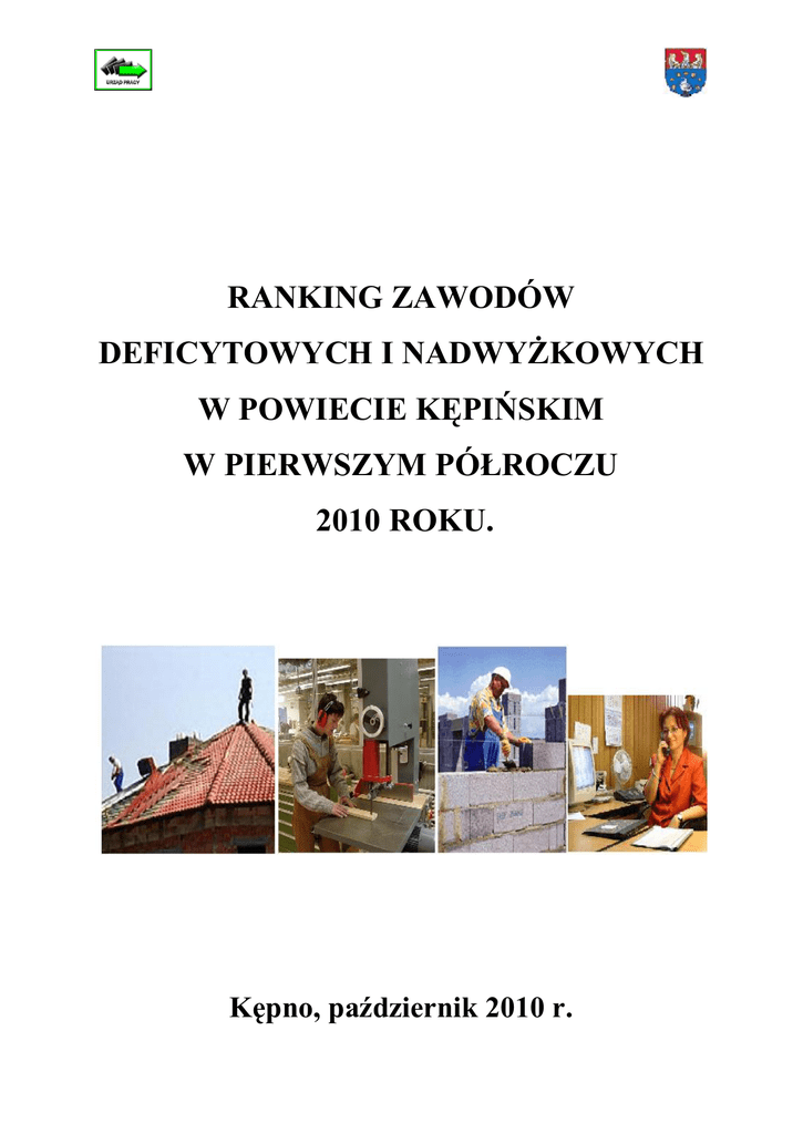 RANKING ZAWODÓW DEFICYTOWYCH I NADWYŻKOWYCH W POWIECIE KĘPIŃSKIM W PIERWSZYM PÓŁROCZU 2010 ROKU. Kępno, październik 2010 r. Spis treści: 1. Wstęp 3 2. Analiza bezrobocia według zawodów (grup zawodów) 5 3. Analiza ofert pracy według zawodów (grup zawodów) 11 4. Analiza zawodów deficytowych i nadwyżkowych 14 5. Wnioski 16 2 1. Wstęp Celem niniejszego opracowania jest analiza danych dotyczących zawodów nadwyżkowych oraz deficytowych w powiecie kępińskim. Wyniki opracowania pomogą zharmonizować kierunki kształcenia z potrzebami rynku pracy oraz pozytywnie wpłynąć na młodzież, która podejmuje swoje pierwsze decyzje dotyczące drogi zawodowej. Wyobrażenia ludzi młodych na temat zawodu, jaki chcą wykonywać w przyszłości są często mgliste, a problemy ze znalezieniem odpowiedniego zatrudnienia są dla nich wręcz abstrakcją. Wiedza dotycząca zawodów deficytowych oraz nadwyżkowych na rynku pracy, na którym się znajdą po uzyskaniu wykształcenia, może wpłynąć na podjęcie przez nich właściwego wyboru drogi zawodowej. Po uzyskaniu odpowiedniego zasobu informacji, m.in. dzięki tej analizie młodzi ludzie wybierając swój przyszły zawód nie będą już tak bezradni w momencie pojawienia się na rynku pracy. Uświadomienie młodzieży jak ważna jest decyzja związana z wyborem zawodu jest niewątpliwie jednym ze sposobów zapobiegania wzrostowi bezrobocia. Wszakże to młodzi ludzie do 25–tego roku życia stanowią najliczniejszą grupę osób pozostających bez pracy w Polsce, jak również grupę najbardziej zagrożoną bezrobociem. Niniejsze opracowanie ma ponadto na celu ułatwienie władzom samorządowym pozyskiwanie inwestorów, poprzez ukazanie ilu potencjalnych pracowników znajduje się na danym obszarze. Dzięki monitoringowi zawodów będzie można w lepszy sposób skoordynować szkolenia osób bezrobotnych z potrzebami pracodawców, co niewątpliwie wpłynie na zwiększenie efektywności szkoleń. Monitorowanie zawodów deficytowych i nadwyżkowych jest procesem systematycznego obserwowania zjawisk zachodzących na rynku pracy dotyczących kształtowania się popytu na pracę i podaży zasobów pracy w przekroju terytorialno – zawodowym oraz formułowania na tej podstawie ocen, wniosków i krótkotrwałych prognoz niezbędnych dla prawidłowego funkcjonowania systemów: szkolenia bezrobotnych oraz kształcenia zawodowego. Monitoring wpłynie również na doskonalenie jakości usług rynku pracy zarówno w zakresie pośrednictwa jak i doradztwa zawodowego, poprzez dostarczanie jak najbardziej szczegółowych danych dotyczących zapotrzebowania na rynku pracy. Zgodnie z zapisami Ustawy z dnia 20 kwietnia 2004 r. o promocji zatrudnienia i instytucjach rynku pracy (art. 8 ust. 1. pkt 3 i art. 9 ust. 1 pkt 9) opracowywanie analiz rynku pracy, w tym prowadzenie monitoringu zawodów deficytowych i nadwyżkowych jest jednym z zadań samorządu województwa oraz samorządu powiatu w zakresie polityki rynku pracy. 3 Monitoring obejmuje 10 wielkich grup zawodów (kod 1-cyfrowy) 30 średnich grup zawodowych (2-cyfrowy kod), 392 grupy elementarne (4-cyfrowy kod) i 1707 zawodów oraz specjalności (6-cyfrowy kod), czyli „Klasyfikacją zawodów i specjalności”, która została wprowadzona rozporządzeniem Ministra Gospodarki i Pracy z dnia 8 grudnia 2004 r.(Dz. U. 2004 Nr 265, poz. 2644), wraz z późniejszymi zmianami wprowadzonymi Rozporządzeniem Ministra Pracy i Polityki Społecznej z dnia 1 czerwca 2007 roku (Dz. U. nr 106, poz. 728). W wyniku wprowadzenia powyższych zmian, zwiększyła się liczba zawodów i specjalności oznaczonych kodem 6-cyfrowym z 1707 do 1770. Na niezmienionym poziomie pozostała natomiast liczba dużych, średnich i elementarnych grup zawodów. Monitoring zawodów deficytowych i nadwyżkowych jest prowadzony w oparciu o ujednolicone dla całego kraju zalecenia metodyczne opracowane przez Departament Rynku Pracy Ministerstwa Gospodarki i Pracy. Zgodnie z zaleceniami metodycznymi raporty z monitoringu zawodów deficytowych i nadwyżkowych opracowywane są co pół roku na poziomie powiatu, województwa i kraju przez publiczne służby zatrudnienia. Podstawę opracowania analizy stanowią raporty utworzone centralnie przy użyciu specjalnie przygotowanej aplikacji na podstawie danych do „sprawozdania o rynku pracy” MGiP - 01 z załącznika nr 2 („Bezrobotni według rodzaju działalności ostatniego miejsca pracy i ofert pracy”) oraz załącznika nr 3 („Bezrobotni oraz oferty pracy według zawodów i specjalności) wg stanu na koniec pierwszego półrocza 2010 roku: a) T-I/P-1. Bezrobotni wg zawodów w powiecie kępińskim, b) T-I/P-1a. Struktura bezrobotnych wg grup zawodowych w powiecie kępińskim, c) T-I/P-2. Napływ bezrobotnych wg zawodów w powiecie kępińskim, d) T-I/P-2a. Struktura napływ bezrobotnych wg grup zawodowych w powiecie kępińskim, e) T-I/P-3. Oferty pracy wg zawodów w powiecie kępińskim, f) T-I/P-3a. Struktura ofert pracy wg grup zawodowych w powiecie kępińskim, g) T-I/P-4. Zawody deficytowe i nadwyżkowe w powiecie kępińskim, h) T-I/P-5. Ranking zawodów (grup zawodów wg kodu dwucyfrowego) deficytowych i nadwyżkowych w powiecie kępińskim, i) T-I/P-6. Ranking zawodów (grup zawodów wg kodu czterocyfrowego) deficytowych i nadwyżkowych w powiecie kępińskim, j) T-I/P-7. Ranking zawodów (grup zawodów wg kodu dwucyfrowego) generujących długotrwałe bezrobocie w powiecie kępińskim, 4 k) T-I/P-8. Ranking zawodów (grup zawodów wg kodu czterocyfrowego) generujących długotrwałe bezrobocie w powiecie kępińskim, l) T-I/P-9. Bezrobotni wg rodzaju działalności ostatniego miejsca pracy oraz oferty pracy w powiecie kępińskim, m) T-I/P-9a. Struktura bezrobotnych i ofert pracy według PKD w powiecie kępińskim, n) T-I/P-10. Ranking zawodów (grup zawodów wg kodu dwucyfrowego) zgłoszonych w ofertach pracy w powiecie kępińskim, o) T-I/P-11. Ranking zawodów (gru