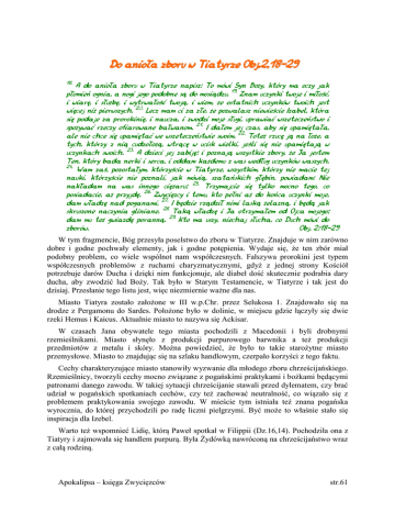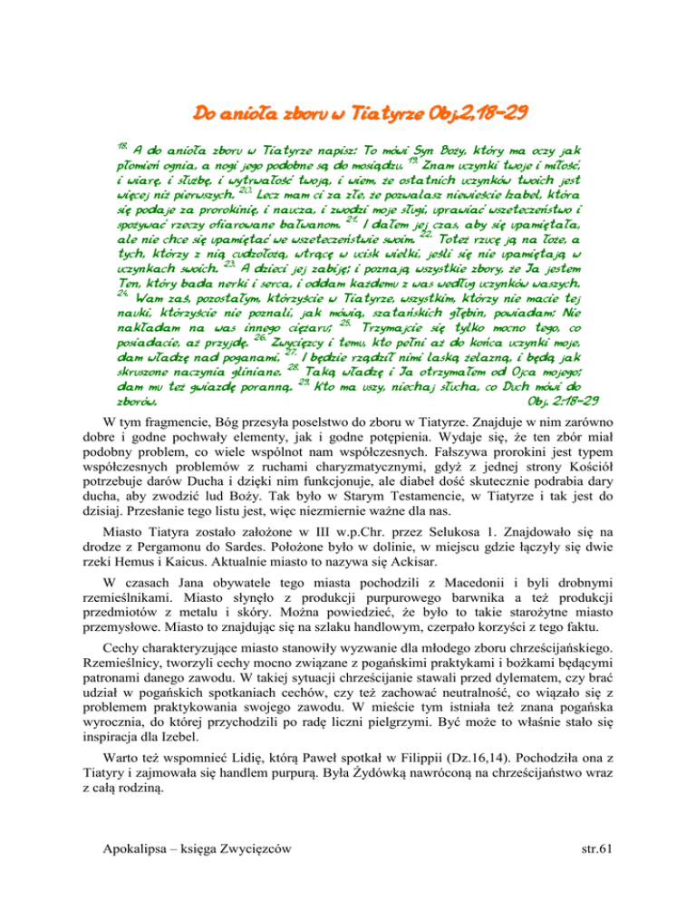 Do anioła zboru w Tiatyrze Obj.2,18-29 18. A do anioła zboru w Tiatyrze napisz: To mówi Syn BoŜy, który ma oczy jak płomień ognia, a nogi jego podobne są do mosiądzu. 19. Znam uczynki twoje i miłość, i wiarę, i słuŜbę, i wytrwałość twoją, i wiem, Ŝe ostatnich uczynków twoich jest więcej niŜ pierwszych. 20. Lecz mam ci za złe, Ŝe pozwalasz niewieście Izabel, która się podaje za prorokinię, i naucza, i zwodzi moje sługi, uprawiać wszeteczeństwo i spoŜywać rzeczy ofiarowane bałwanom. 21. I dałem jej czas, aby się upamiętała, ale nie chce się upamiętać we wszeteczeństwie swoim. 22. ToteŜ rzucę ją na łoŜe, a tych, którzy z nią cudzołoŜą, wtrącę w ucisk wielki, jeśli się nie upamiętają w uczynkach swoich. 23. A dzieci jej zabiję; i poznają wszystkie zbory, Ŝe Ja jestem Ten, który bada nerki i serca, i oddam kaŜdemu z was według uczynków waszych. 24. Wam zaś, pozostałym, którzyście w Tiatyrze, wszystkim, którzy nie macie tej nauki, którzyście nie poznali, jak mówią, szatańskich głębin, powiadam: Nie nakładam na was innego cięŜaru; 25. Trzymajcie się tylko mocno tego, co posiadacie, aŜ przyjdę. 26. Zwycięzcy i temu, kto pełni aŜ do końca uczynki moje, dam władzę nad poganami, 27. I będzie rządził nimi laską Ŝelazną, i będą jak skruszone naczynia gliniane. 28. Taką władzę i Ja otrzymałem od Ojca mojego; dam mu teŜ gwiazdę poranną. 29. Kto ma uszy, niechaj słucha, co Duch mówi do zborów. Obj. 2:18-29 W tym fragmencie, Bóg przesyła poselstwo do zboru w Tiatyrze. Znajduje w nim zarówno dobre i godne pochwały elementy, jak i godne potępienia. Wydaje się, że ten zbór miał podobny problem, co wiele wspólnot nam współczesnych. Fałszywa prorokini jest typem współczesnych problemów z ruchami charyzmatycznymi, gdyż z jednej strony Kościół potrzebuje darów Ducha i dzięki nim funkcjonuje, ale diabeł dość skutecznie podrabia dary ducha, aby zwodzić lud Boży. Tak było w Starym Testamencie, w Tiatyrze i tak jest do dzisiaj. Przesłanie tego listu jest, więc niezmiernie ważne dla nas. Miasto Tiatyra zostało założone w III w.p.Chr. przez Selukosa 1. Znajdowało się na drodze z Pergamonu do Sardes. Położone było w dolinie, w miejscu gdzie łączyły się dwie rzeki Hemus i Kaicus. Aktualnie miasto to nazywa się Ackisar. W czasach Jana obywatele tego miasta pochodzili z Macedonii i byli drobnymi rzemieślnikami. Miasto słynęło z produkcji purpurowego barwnika a też produkcji przedmiotów z metalu i skóry. Można powiedzieć, że było to takie starożytne miasto przemysłowe. Miasto to znajdując się na szlaku handlowym, czerpało korzyści z tego faktu. Cechy charakteryzujące miasto stanowiły wyzwanie dla młodego zboru chrześcijańskiego. Rzemieślnicy, tworzyli cechy mocno związane z pogańskimi praktykami i bożkami będącymi patronami danego zawodu. W takiej sytuacji chrześcijanie stawali przed dylematem, czy brać udział w pogańskich spotkaniach cechów, czy też zachować neutralność, co wiązało się z problemem praktykowania swojego zawodu. W mieście tym istniała też znana pogańska wyrocznia, do której przychodzili po radę liczni pielgrzymi. Być może to właśnie stało się inspiracja dla Izebel. Warto też wspomnieć Lidię, którą Paweł spotkał w Filippii (Dz.16,14). Pochodziła ona z Tiatyry i zajmowała się handlem purpurą. Była Żydówką nawróconą na chrześcijaństwo wraz z całą rodziną. Apokalipsa – księga Zwycięzców str.61 Wstęp do listu Jak w każdym z 7 listów, Jezus na wstępie przedstawia się zborownikom określeniem zaczerpniętym z rozdziału pierwszego. Tutaj używa swojego oficjalnego tytuł Syn Boży, aby podkreślić swój prestiż, autorytet a też ukazać prawdziwe źródło inspiracji dla wierzących, płynące nie z fałszywych proroctw i niepewnego źródła, ale od samego Boga, Stwórcy Wszechrzeczy. Stwierdzenie to mówi Syn BoŜy brzmi oficjalnie i dostojnie. Termin ten jest prorockim tytułem Jezusa, określa jego misję, rolę i zadania, jakie miał do wypełnienia. Tytuł ten dotyczył Mesjasza i pojawił się w księdze Daniela wskazując na Jezusa. Chrystus chce powiedzieć zborownikom w Tiatyrze, że go słucha i wiernie wykonuje jego Słowo. W kontekście zaś problemów z Izebel wcale to nie jest takie oczywiste. W obliczu różnorodnych fałszywych teorii i teologii warto od czasu do czasu przypomnieć, kto w chrześcijaństwie jest ważny i kto tworzy podstawy wiary. Zborownicy w tym zborze mieli problem z uznaniem autorytetu i ulegali różnorodnym nowinkom, jakie się pojawiały. Dlatego Jezus tak radykalnie i tak mocno rozpoczyna swoje przesłanie do tego zboru. W dwóch kolejnych określeniach dotyczących Jezusa pojawiają się kolejne dwie groźnie brzmiące cechy Chrystusowe. W zwrocie, „który ma oczy jak płomień ognia” Jezus nawiązuje do swojej mocy, aktywności i prawa sądzenia i oceniania. Wzrok Jezusa przenika do głębi ludzkiej duszy, nie można przed nim ukryć prawdy, nawet gdy głosi się wzniosłe hasła dobrze zakamuflowane gładką mową. Jezus dostrzeże najmniejszy fałsz, najmniejszą rysę, którą należy naprawić i poprawić. Te przenikliwe oczy są też zwiastunem sądu i to sądu obiektywnego i sprawiedliwego. Ma to pozytywny jak i negatywny aspekt. Pozytywny, to fakt, że każdy nasz czyn i opinia będą osądzone zgodnie z prawdą a negatywny, gdy chcielibyśmy, co nieco ukryć przed tym Jezusowym wzrokiem - to się nie uda. Boże zasady i w związku z tym sądy Boże są sprawiedliwe i obiektywne. Możemy tworzyć przeróżne teorie omijające Boże standardy, ale i tak nam to nie pomoże, gdyż Bóg osądzi nas na podstawie swoich standardów a nie naszych teorii. Nogi podobne do mosiądzu to kolejne groźnie brzmiące określenie. W tłumaczeniu dosłownym interlinii napisane jest „podobne spiżowemu kadzidłu”, co jeszcze groźniej brz
