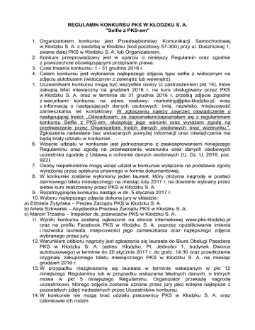 REGULAMIN KONKURSU PKS W KŁODZKU S. A. "Selfie z PKS-em" 1. Organizatorem konkursu jest Przedsiębiorstwo Komunikacji Samochodowej w Kłodzku S. A. z siedzibą w Kłodzku (kod pocztowy 57-300) przy ul. Dusznickiej 1, zwane dalej PKS w Kłodzku S. A. lub Organizatorem. 2. Konkurs przeprowadzany jest w oparciu o niniejszy Regulamin oraz zgodnie z powszechnie obowiązującymi przepisami prawa. 3. Czas trwania konkursu: 1 - 31 grudnia 2016 r. 4. Celem konkursu jest wyłonienie najlepszego zdjęcia typu selfie z widocznym na zdjęciu autobusem (widocznym z zewnątrz lub wewnątrz). 5. Uczestnikami konkursu mogą być wszystkie osoby (z zastrzeżeniem pkt 14), które zakupią bilet miesięczny na grudzień 2016 r. na kurs obsługiwany przez PKS w Kłodzku S. A. oraz w terminie do 31 grudnia 2016 r. prześlą zdjęcie zgodne z warunkami konkursu na adres mailowy: [email protected] wraz z informacją o następujących danych osobowych: imię, nazwisko, miejscowość zamieszkania, tel. kontaktowy. W zgłoszeniu należy zawrzeć oświadczenie o następującej treści: „Oświadczam, że zapoznałem/zapoznałam się z regulaminem konkursu Selfie z PKS-em, akceptuję jego warunki oraz wyrażam zgodę na przetwarzanie przez Organizatora moich danych osobowych oraz wizerunku.”. Zgłoszenia nadesłane bez wskazanych powyżej informacji oraz oświadczenia nie będą brały udziału w konkursie. 6. Wzięcie udziału w konkursie jest jednoznaczne z zaakceptowaniem niniejszego Regulaminu oraz zgodą na przetwarzanie wizerunku oraz danych osobowych uczestnika zgodnie z Ustawą o ochronie danych osobowych (t.j. Dz. U. 2016, poz. 922). 7. Osoby niepełnoletnie mogą wziąć udział w konkursie wyłącznie na podstawie zgody wyrażonej przez opiekuna prawnego w formie dokumentowej. 8. W konkursie zostanie wyłoniony jeden laureat, który otrzyma nagrodę w postaci darmowego biletu miesięcznego na miesiąc luty 2017 r. na dowolnie wybrany przez siebie kurs realizowany przez PKS w Kłodzku S. A. 9. Rozstrzygnięcie konkursu nastąpi w dn. 5 stycznia 2017 r. 10. Wyboru najlepszego zdjęcia dokona jury w składzie: a) Elżbieta Żytyńska – Prezes Zarządu PKS w Kłodzku S. A. b) Arleta Szkwarek – Asystentka Prezesa Zarządu PKS w Kłodzku S. A. c) Marcin Trzaska – Inspektor ds. przewozów PKS w Kłodzku S. A. 11. Wyniki konkursu zostaną ogłoszone na stronie internetowej www.pks-klodzko.pl oraz na profilu Facebook PKS w Kłodzku S. A. poprzez opublikowanie imienia i nazwiska laureata, miejscowości jego zamieszkania oraz najlepszego zdjęcia wybranego przez jury. 12. Warunkiem odbioru nagrody jest zgłoszenie się laureata do Biura Obsługi Pasażera PKS w Kłodzku S. A. (adres: Kłodzko, Pl. Jedności 1, budynek Dworca autobusowego) w terminie do 20 stycznia 2017 r. do godz. 14:30 oraz przedłożenie oryginału zakupionego biletu miesięcznego PKS w Kłodzku S. A. na miesiąc grudzień 2016 r. 13. W przypadku niezgłoszenia się laureata w terminie wskazanym w pkt 12 niniejszego Regulaminu lub w przypadku wskazania błędnych danych, o których mowa w pkt 5 niniejszego Regulaminu, Organizator przekażę nagrodę uczestnikowi, którego zdjęcie zostanie uznane przez jury jako kolejne najlepsze z pozostałych zdjęć nadesłanych przez Uczestników konkursu. 14. W konkursie nie mogą brać udziału pracownicy PKS w Kłodzku S. A. oraz członkowie ich rodzin. 15. Nagroda nie podlega wymianie na nagrodę gotówkową lub inne usługi świadczone przez PKS w Kłodzku S. A. 16. Po rozstrzygnięciu konkursu Organizator usunie nadesłane zgłoszenia. 17. Regulamin konkursu jest dostępny w siedzibie PKS w Kłodzku S. A. oraz na stronie internetowej www.pks-klodzko.pl 18. Szczegółowe informacje dotyczące konkursu udzielane są pod numerem telefonu 661 955 777.