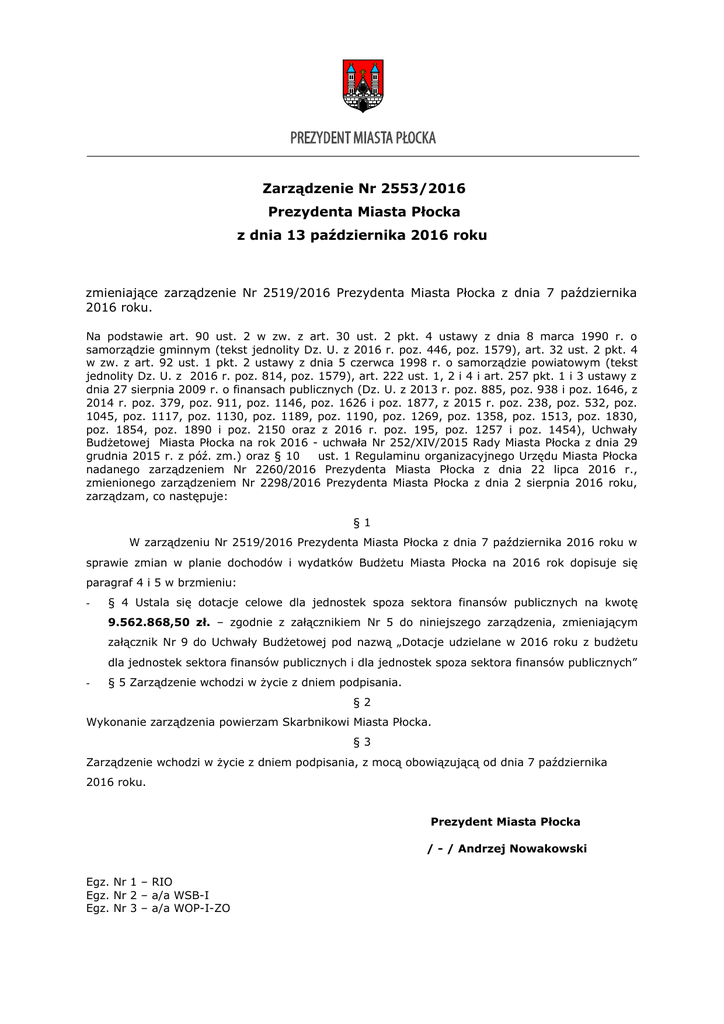 Zarządzenie Nr 2553/2016 Prezydenta Miasta Płocka z dnia 13 października 2016 roku zmieniające zarządzenie Nr 2519/2016 Prezydenta Miasta Płocka z dnia 7 października 2016 roku. Na podstawie art. 90 ust. 2 w zw. z art. 30 ust. 2 pkt. 4 ustawy z dnia 8 marca 1990 r. o samorządzie gminnym (tekst jednolity Dz. U. z 2016 r. poz. 446, poz. 1579), art. 32 ust. 2 pkt. 4 w zw. z art. 92 ust. 1 pkt. 2 ustawy z dnia 5 czerwca 1998 r. o samorządzie powiatowym (tekst jednolity Dz. U. z 2016 r. poz. 814, poz. 1579), art. 222 ust. 1, 2 i 4 i art. 257 pkt. 1 i 3 ustawy z dnia 27 sierpnia 2009 r. o finansach publicznych (Dz. U. z 2013 r. poz. 885, poz. 938 i poz. 1646, z 2014 r. poz. 379, poz. 911, poz. 1146, poz. 1626 i poz. 1877, z 2015 r. poz. 238, poz. 532, poz. 1045, poz. 1117, poz. 1130, poz. 1189, poz. 1190, poz. 1269, poz. 1358, poz. 1513, poz. 1830, poz. 1854, poz. 1890 i poz. 2150 oraz z 2016 r. poz. 195, poz. 1257 i poz. 1454), Uchwały Budżetowej Miasta Płocka na rok 2016 - uchwała Nr 252/XIV/2015 Rady Miasta Płocka z dnia 29 grudnia 2015 r. z póź. zm.) oraz § 10 ust. 1 Regulaminu organizacyjnego Urzędu Miasta Płocka nadanego zarządzeniem Nr 2260/2016 Prezydenta Miasta Płocka z dnia 22 lipca 2016 r., zmienionego zarządzeniem Nr 2298/2016 Prezydenta Miasta Płocka z dnia 2 sierpnia 2016 roku, zarządzam, co następuje: §1 W zarządzeniu Nr 2519/2016 Prezydenta Miasta Płocka z dnia 7 października 2016 roku w sprawie zmian w planie dochodów i wydatków Budżetu Miasta Płocka na 2016 rok dopisuje się paragraf 4 i 5 w brzmieniu: - § 4 Ustala się dotacje celowe dla jednostek spoza sektora finansów publicznych na kwotę 9.562.868,50 zł. – zgodnie z załącznikiem Nr 5 do niniejszego zarządzenia, zmieniającym załącznik Nr 9 do Uchwały Budżetowej pod nazwą „Dotacje udzielane w 2016 roku z budżetu dla jednostek sektora finansów publicznych i dla jednostek spoza sektora finansów publicznych” - § 5 Zarządzenie wchodzi w życie z dniem podpisania. §2 Wykonanie zarządzenia powierzam Skarbnikowi Miasta Płocka. §3 Zarządzenie wchodzi w życie z dniem podpisania, z mocą obowiązującą od dnia 7 października 2016 roku. Prezydent Miasta Płocka / - / Andrzej Nowakowski Egz. Nr 1 – RIO Egz. Nr 2 – a/a WSB-I Egz. Nr 3 – a/a WOP-I-ZO UZASADNIENIE W związku ze zmianami w planie wydatków dokonanymi w zarządzeniu Nr 2519/2016 Prezydenta Miasta Płocka z dnia 7 października 2016 roku konieczne jest zaktualizowanie załącznika pn. „Dotacje udzielane w 2016 roku z budżetu dla jednostek sektora finansów publicznych i dla jednostek spoza sektora finansów publicznych”. Załącznik Nr 5 do Zarządzenia Nr 2553/2016 Prezydenta Miasta Płocka z dnia 13 października 2016 roku DOTACJE UDZIELANE W 2016 ROKU Z BUDŻETU DLA JEDNOSTEK SEKTORA FINANSÓW PUBLICZNYCH I DLA JEDNOSTEK SPOZA SEKTORA FINANSÓW PUBLICZNYCH w złotych Lp. Dział Rozdział Nazwa jednostki / zadania 1 2 3 4 A. Jednostki sektora finansów publicznych Kwota dotacji podmiotowej celowej pozostałe dotacje 5 6 7 24 047 588,73 1 428 719,00 22 571 667,19 1 010 01030 Wpłata na rzecz Mazowieckiej Izby Rolniczej 2 600 60015 Rozliczanie projektu współfinansowanego z funduszu europejskiego - "Budowa i przebudowa infrastruktury drogowej w ciągu dróg wojewódzkich nr 559 i 562 w Płocku wraz z niezbędną infrastrukturą" 3 700 70005 Wpłata do Związku Gmin Regionu Płockiego na koszty zwiazane z monitorowaniem efektu ekologicznego termomodernizacji budynku Miejskiego Osrodka Pomocy Społecznej i Szkoły Podstawowej Nr 23 15 000,00 4 754 75404 Dofinansowanie działalności, w tym w szczególności rekompensata za czas służby przekraczający normę - Fundusz Wsparcia Policji 402 750,00 5 754 75404 Zakup dwóch psów służbowych dla Komendy Miejskiej Policji w Płocku - Fundusz Wsparcia Policji 6 754 75404 Zakup samochodów dla Komendy Miejskiej Policji - Fundusz Wsparcia Policji 7 754 75410 Likwidacja zagrożeń ekologicznych - Fundusz Wsparcia Państwowej Straży Pożarnej 8 754 75410 Budowa Jednostki Ratowniczo - Gaśniczej Nr 2 Państwowej Straży Pożarnej w Płocku przy ul. Popłacińskiej 8 Fundusz Wsparcia Państwowej Straży Pożarnej 900 000,00 9 754 75410 Zakup samochodu ratowniczo-gaśniczego dla Komendy Miejskiej Państwowej Straży Pożarnej w Płocku - Fundusz Wsparcia Państwowej Straży Pożarnej 300 000,00 7 125,00 0,00 10 000,00 100 000,00 37 800,00 Kwota dotacji Lp. Dział Rozdział Nazwa jednostki / zadania 1 2 3 4 10 754 75410 Zakup działka wodnopianowanego oraz wykrywaczy wielogazowych do wykrywania skażeń chemicznych dla Komendy Miejskiej Państwowej Straży Pożarnej w Płocku - Fundusz Wsparcia Państwowej Straży Pożarnej 11 758 75831 Wpłaty jednostek samorządu terytorialnego do budżetu państwa - gmina 14 005 404,00 12 758 75832 Wpłaty jednostek samorządu terytorialnego do budżetu państwa - powiat 6 363 834,00 13 801 80146 Dokształcanie i doskonalenie zawodowe nauczycieli 14 801 80195 Nauka zawodu dla uczniów szkół ponadgimnazjalnych klas wielozawodowych 15 803 80306 Wspieranie płockich szkół wyższych w zakresie rozwoju i modernizacji bazy naukowo - dydaktycznej 16 852 85201 Pokrywanie kosztów utrzymania dzieci z Płocka w placówkach opiekuńczo – wychowawczych na terenie innych powiatów po zmianie 17 852 85204 Pokrywanie kosztów utrzymania dzieci z Płocka w rodzinach zastępczych na terenie innych powiatów po zmianie 18 852 85204 Zwrot dotacji pobranych nienależnie lub w nadmiernej wysokości 1 554,19 19 852 85211 Zwrot dotacji pobranych nienależnie lub w nadmiernej wysokości po zmianie 5 000,00 19 852 85212 Zwrot dotacji pobranych nienależnie lub w nadmiernej wysokości 220 000,00 20 852 85213 Zwrot dotacji pobranych nienależnie lub w nadmiernej wysokości 5 000,00 21 852 85214 Zwrot dotacji pobranych nienależnie lub w nadmiernej wysokości 3 000,00 podmiotowej 5 celowej 6 pozostałe dotacje 7 62 200,00 218 000,00 1 700,00 269 0
