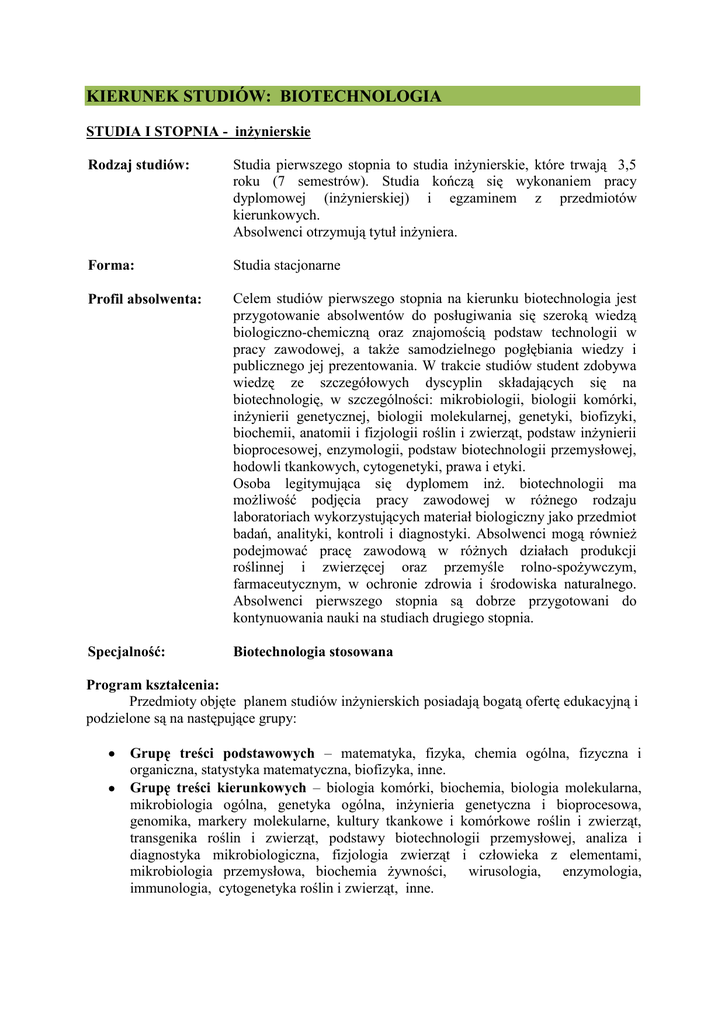 KIERUNEK STUDIÓW: BIOTECHNOLOGIA STUDIA I STOPNIA - inżynierskie Rodzaj studiów: Studia pierwszego stopnia to studia inżynierskie, które trwają 3,5 roku (7 semestrów). Studia kończą się wykonaniem pracy dyplomowej (inżynierskiej) i egzaminem z przedmiotów kierunkowych. Absolwenci otrzymują tytuł inżyniera. Forma: Studia stacjonarne Profil absolwenta: Celem studiów pierwszego stopnia na kierunku biotechnologia jest przygotowanie absolwentów do posługiwania się szeroką wiedzą biologiczno-chemiczną oraz znajomością podstaw technologii w pracy zawodowej, a także samodzielnego pogłębiania wiedzy i publicznego jej prezentowania. W trakcie studiów student zdobywa wiedzę ze szczegółowych dyscyplin składających się na biotechnologię, w szczególności: mikrobiologii, biologii komórki, inżynierii genetycznej, biologii molekularnej, genetyki, biofizyki, biochemii, anatomii i fizjologii roślin i zwierząt, podstaw inżynierii bioprocesowej, enzymologii, podstaw biotechnologii przemysłowej, hodowli tkankowych, cytogenetyki, prawa i etyki. Osoba legitymująca się dyplomem inż. biotechnologii ma możliwość podjęcia pracy zawodowej w różnego rodzaju laboratoriach wykorzystujących materiał biologiczny jako przedmiot badań, analityki, kontroli i diagnostyki. Absolwenci mogą również podejmować pracę zawodową w różnych działach produkcji roślinnej i zwierzęcej oraz przemyśle rolno-spożywczym, farmaceutycznym, w ochronie zdrowia i środowiska naturalnego. Absolwenci pierwszego stopnia są dobrze przygotowani do kontynuowania nauki na studiach drugiego stopnia. Specjalność: Biotechnologia stosowana Program kształcenia: Przedmioty objęte planem studiów inżynierskich posiadają bogatą ofertę edukacyjną i podzielone są na następujące grupy: Grupę treści podstawowych – matematyka, fizyka, chemia ogólna, fizyczna i organiczna, statystyka matematyczna, biofizyka, inne. Grupę treści kierunkowych – biologia komórki, biochemia, biologia molekularna, mikrobiologia ogólna, genetyka ogólna, inżynieria genetyczna i bioprocesowa, genomika, markery molekularne, kultury tkankowe i komórkowe roślin i zwierząt, transgenika roślin i zwierząt, podstawy biotechnologii przemysłowej, analiza i diagnostyka mikrobiologiczna, fizjologia zwierząt i człowieka z elementami, mikrobiologia przemysłowa, biochemia żywności, wirusologia, enzymologia, immunologia, cytogenetyka roślin i zwierząt, inne. Przedmioty wymagane - język obcy, podstawy prawa, podstawy bezpieczeństwa pracy i ergonomii, technologia informacyjna, grafika inżynierska, ochrona własności intelektualnej, inne. Przedmioty do wyboru – ochrona środowiska, analiza instrumentalna, kultury roślinne i zwierzęce in vitro, genetyka populacji, genetyka drobnoustrojów, bioróżnorodność i ochrona zasobów genowych roślin i zwierząt, analiza produktów spożywczych, ocena jakości żywności, biotechnologia w medycynie, inne. Biotechnologia to nie tylko wykłady, ale przede wszystkim ćwiczenia, na których studenci mają możliwość praktycznego opanowania wiedzy i zapoznania się z najnowszą aparaturą i sprzętem laboratoryjnym. Studenci samodzielnie wykonują m.in.: izolację i amplifikację DNA, oczyszczanie i elektroforezę białek, transformację bakterii i roślin, analizy mikrobiologiczne. Uczestniczą również w eksperymentach i badaniach naukowych prowadzonych w katedrach i zakładach Uniwersytetu Rolniczego. Dużym atutem zajęć dla studentów Biotechnologii są profesjonalnie wyposażone laboratoria oraz nowoczesna aparatura badawcza. Mogą również korzystać z dwóch pracowni komputerowych z dostępem do internetu oraz z elektronicznych baz danych w Bibliotece Głównej. W czasie studiów studenci odbywają 4 tygodniową praktykę zawodową w różnych firmach o profilu biotechnologicznym, gdzie mają możliwość zapoznać się z praktycznym wykorzystaniem wiedzy. Istnieje również możliwość wyjazdu na studia w ramach wymiany studentów (ERASMUS) na inne uczelnie krajowe i zagraniczne. Studenci mogą studiować jeden lub dwa semestry w renomowanych uczelniach w Austrii, Norwegii, Belgii, Danii, Hiszpanii oraz Francji. W celu poszerzenia swoich zainteresowań, studenci mogą działać w Kole Naukowym Biotechnologów „Helisa”, w ramach którego istnieją sekcje tematyczne m.in.: genetyki molekularnej, biochemii, mikrobiologii, kultur in vitro, technologii fermentacji, biotechnologii medycznej. Członkowie Koła biorą również udział w obozach naukowych dofinansowywanych z funduszy uczelnianych. Oprócz tego studenci w ramach działalności Koła przedstawiają swoje osiągnięcia naukowe na Sesjach Kół Naukowych i konferencjach. Ponadto przygotowują seminaria, zwiedzają placówki naukowe, firmy biotechnologiczne oraz laboratoria. Najaktywniejsi studenci otrzymują nagrody rzeczowe i pieniężne.