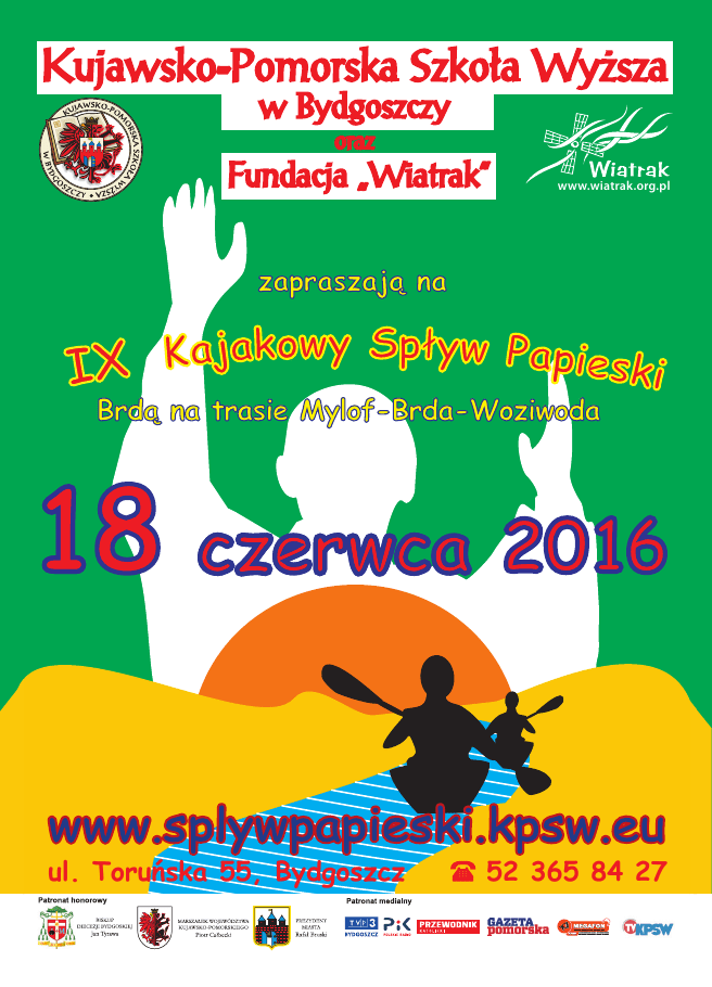 www.wiatrak.org.pl Brdą na trasie Mylof-Brda-Woziwoda ul. Toruńska 55, Bydgoszcz 52 365 84 27 Cena uczestnictwa w spływie: 155 zł od osoby Zgłoszenia przyjmujemy do 31 maja (lub do wyczerpania miejsc) drogą mailową pod adresem [email protected] Więcej informacji: tel. 52 365 84 27 lub 510 993 084 Kajakowy Spływ Papieski to cykliczna inicjatywa upamiętniająca pobyt Karola Wojtyły na kujawsko-pomorskich szlakach wodnych oraz Jego zamiłowanie do rzeki Brdy. Dla miłośników spędzania wolnego czasu na wodzie to niezwykle trafny wybór. Spływ Papieski to wyjątkowa okazja do obcowania z pięknem i bogactwem przyrody a także wzmocnienia swoich sił fizycznych oraz duchowych. Łączy w sobie aktywną rekreację a także daje możliwość kontemplacji uroków natury. Uczestnicy Spływów Papieskich każdorazowo biorą udział we Mszy Świętej odprawianej nad brzegiem rzeki, po czym wzmacniają się wspaniałym jadłem oraz delektują nadzwyczajną atmosferą. Szlaki wodne naszego regionu zachwycają widokami, dlatego też corocznie przybywa wielu nowych uczestników w różnym wieku i z wielu zakątków nie tylko naszego regionu, ale także kraju. Serdecznie zapraszamy mieszkańców Kujaw i Pomorza, społeczność akademicką naszego regionu oraz wszystkich pasjonatów turystyki kajakowej, ponieważ każdy Kajakowy Spływ Papieski to rodzinna atmosfera i niezapomniane spotkanie w duchu krzewienia nauczania Papieża Polaka. Organizatorem Kajakowego Spływu Papieskiego jest Kujawsko-Pomorska Szkoła Wyższa w Bydgoszczy, która od powstania w 2000 roku zyskała opinię rzetelnej, solidnej, dynamicznie rozwijającej się i jednej z największych w regionie uczelni niepublicznych. Misję Uczelni wyrażają słowa “Sapientiae Servientes” (w służbie mądrości). Nasza Uczelnia to miejsce gdzie „człowiek jest przede wszystkim istotą, która szuka prawdy, usiłuje nią żyć i pogłębiać ją w dialogu, który obejmuje dawne i przyszłe pokolenia” (Centessimus Annus, 49). Od 2015 roku współorganizatorem Spływu Papieskiego została Fundacja Wiatrak - jedna z najprężniej rozwijających się organizacji pozarządowych w województwie. Misją „Wiatraka” jest wspieranie osoby ludzkiej na wszystkich etapach i stanach jej życia, aby z pomocą św. Jana Pawła II i bł. Matki Teresy z Kalkuty, osiągnęła pełnię szczęścia w odkrywaniu godności oraz dojrzałym i odpowiedzialnym darze dla drugiego człowieka.