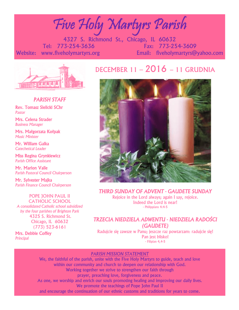 Five Holy Martyrs Parish 4327 S. Richmond St., Chicago, IL 60632 Tel: 773-254-3636 Fax: 773-254-3609 Website: www.fiveholymartyrs.org Email: [email protected] DECEMBER 11 – 2016 – 11 GRUDNIA PARISH STAFF Rev. Tomasz Sielicki SChr Pastor Mrs. Celena Strader Business Manager Mrs. Małgorzata Kołpak Music Minister Mr. William Galka Catechetical Leader Miss Regina Grynkiewicz Parish Office Assistant Mr. Marion Valle Parish Pastoral Council Chairperson Mr. Sylvester Majka Parish Finance Council Chairperson POPE JOHN PAUL II CATHOLIC SCHOOL A consolidated Catholic school subsidized by the four parishes of Brighton Park 4325 S. Richmond St. Chicago, IL 60632 (773) 523-6161 Mrs. Debbie Coffey Principal THIRD SUNDAY OF ADVENT - GAUDETE SUNDAY Rejoice in the Lord always; again I say, rejoice. Indeed the Lord is near! - Philippians 4:4-5 TRZECIA NIEDZIELA ADWENTU - NIEDZIELA RADOŚCI (GAUDETE) Radujcie się zawsze w Panu; jeszcze raz powtarzam: radujcie się! Pan jest blisko! - Filipian 4,4-5 PARISH MISSION STATEMENT We, the faithful of the parish, unite with the Five Holy Martyrs to guide, teach and love within our community and church to deepen our relationship with God. Working together we strive to strengthen our faith through prayer, preaching love, forgiveness and peace. As one, we worship and enrich our souls promoting healing and improving our daily lives. We promote the teachings of Pope John Paul II and encourage the continuation of our ethnic customs and traditions for years to come. Five Holy Martyrs Parish Page 2 December 11, 2016 Mass Intention and Devotion Schedule 3RD SUNDAY OF ADVENT 3. NIEDZIELA ADWENTU Vigil - Saturday - December 10, 2016 4:00 pm-EN † Henry Kaczmarczyk (req. by wife) Sunday - December 11, 2016 7:30 am-PL † Tomasz Tokarz 9:00 am-EN - For the living & deceased members of the F.H.M. Holy Name of Jesus Society - Health & God’s blessings upon Debbie Waitekus (req. by B. Waisnis) - For parishioners & benefactors † Thomas Czerniak † Harry Gronek (20th anniv.) † Maria Wal † Frank Dziedziak (anniv.) † Irene Rybak (req. by F. Banik) † Rudolph Schurko † Loretta Gomolka (req. by family) †† Deceased members of the Fillinsky & Mirecki families (req. by R. & C. Maszka) 10:30 am - Godzinki 11:00 am-PL - Podziękowanie Panu Bogu za otrzymane łaski z prośbą o dalsze błogosławieństwo i zdrowie dla Zofii Bystrek - O zdrowie i błogosławieństwo Boże w dniu urodzin dla Bolesława Starona i całej rodziny † Ks. Paweł Marszałek † Bogdan Felczak † Helena Bajek † Grzegorz Nietupski †† Gustawa i Eugeniusz Kłos †† Józefa i Tadeusz Wilk (zam. córka z rodziną) †† Irena i Jan Skupień (zam. rodzina) †† Stanisława i Józef Mazur, i syn Jan Monday - December 12 - poniedziałek Our Lady of Guadalupe Najświetszej Maryi Panny z Guadalupe 6:30 pm-PL/EN † Maria Furge Tuesday - December 13 - wtorek St. Lucy - św. Łucji 8:00 am-EN †† Stephen & Estelle Osowiec 8:30 am - Adoration of the Blessed Sacrament Adoracja Najświętszego Sakramentu 5:00 - 5:45 pm - Confessions / Spowiedź św. 6:00 pm - Nabożeństwo - Bł. Najśw. Sakramentem Wednesday - December 14 - środa St. John of the Cross - św. Jana od Krzyża 6:30 pm-PL †† Za wszystkich zmarłych z rodziny Niemiec Thursday - December 15 - czwartek 8:00 am-EN †† Maria & Jan Bartoszek Friday - December 16 - piątek 6:30 pm-PL †† Za wszystkich zmarłych z rodziny Eckhart 7:00 - 8:00 pm - Confessions / Spowiedź św. Saturday - December 17 - sobota 8:00 am-EN † Frank Wiercioch 3:00 - 3:45 pm - Confessions / Spowiedź św. 4TH SUNDAY OF ADVENT 4. NIEDZIELA ADWENTU Vigil - Saturday - December 17, 2016 4:00 pm-EN † Edmund Brasky Sunday - December 18, 2016 7:30 am-PL † Edward Zych 9:00 am-EN † Vivian Eckhart † Leonard Zanck, Sr. (birthday remembrance) † Jim Bowles † Rudolph Schurko 10:30 am - Godzinki 11:00 am-PL - Za członków z Towarzystwa Obywateli Starszych im. Ojca Świętego Jana Pawła II, którzy zmarli w grudniu - O zdrowie i błogosławieństwo Boże dla całej rodziny Augustyna i Ireny Habina - Podziękowanie Panu Bogu za otrzymane łaski z prośbą o dalsze błogosławieństwo i zdrowie dla Zofii Bystrek - O zdrowie i błogosławieństwo Boże dla Anieli † Roman Babul (4. roczn. śm.) † Barbara Jachym † Janina Szczypta † James Calvetti † Stanisław Czerniak † Grzegorz Nietupski †† Józefa i Tadeusz Wilk (zam. córka z rodziną) †† Irena i Jan Skupień (zam. rodzina) †† Jan i Janina Jurewicz †† Marek i Krzysztof Jurewicz †† Andrzej i Jan Trojanek †† Aniela i Roman Trojanek Liturgical Ministry Saturday, December 17, 2016 4:00 pm L&C: W. Galka & E. Galka EMHE: J. Ciesla & D. Cronin Sunday, December 18, 2016 9:00 am L&C: J. Koziel & R. Maciuszek EMHE: J. Valle & M. Valle L&C stands for Lector & Commentator EMHE stands for Extraordinary Minister of the Holy Eucharist December 11, 2016 Parafia Pięciu Braci Męczenników PIERWSZE CZYTANIE (Iz 35,1-6a.10) Page 3 DRUGIE CZYTANIE Sam Bóg przyjdzie, aby nas zbawić (Jk 5,7-10) Przyjście Pana jest już bliskie Czytanie z Księgi proroka Izajasza. Czytanie z Listu świętego Jakuba Apostoła Niech się rozweseli pustynia i spieczona ziemia, niech się raduje step i niech rozkwitnie! Niech wyda kwiaty jak lilie polne, niech się rozraduje także skacząc i wykrzykując z uciechy. Chwałą Libanu ją obdarzono, ozdobą Karmelu i Saronu. Oni zobaczą chwałę Pana, wspaniałość naszego Boga. Pokrzepcie ręce osłabłe, wzmocnijcie kolana omdlałe! Powiedzcie małodusznym: «Odwagi! Nie bójcie się! Oto wasz Bóg, oto pomsta; przychodzi Boża odpłata; On sam przychodzi, aby was zbawić». Wtedy przejrzą oczy niewidomych i uszy głuchych się otworzą. Wtedy chromy wyskoczy jak jeleń i język niemych wesoło krzyknie. I odkupieni przez Pana powrócą. Przybędą na Syjon z radosnym śpiewem, ze szczęściem wiecznym na twarzach. Osiągną radość i szczęście, ustą