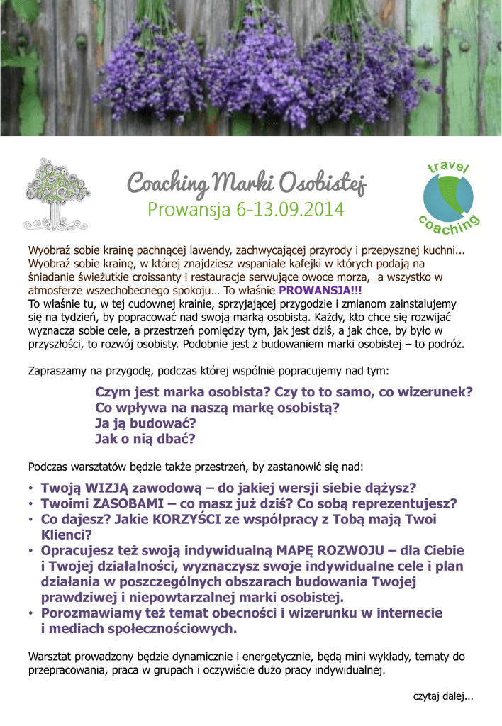 Coaching Marki Osobistej Wyobraź sobie krainę pachnącej lawendy, zachwycającej przyrody i przepysznej kuchni... Wyobraź sobie krainę, w której znajdziesz wspaniałe kafejki w których podają na śniadanie świeżutkie croissanty i restauracje serwujące owoce morza, a wszystko w atmosferze wszechobecnego spokoju… To właśnie PROWANSJA!!! To właśnie tu, w tej cudownej krainie, sprzyjającej przygodzie i zmianom zainstalujemy się na tydzień, by popracować nad swoją marką osobistą. Każdy, kto chce się rozwijać wyznacza sobie cele, a przestrzeń pomiędzy tym, jak jest dziś, a jak chce, by było w przyszłości, to rozwój osobisty. Podobnie jest z budowaniem marki osobistej – to podróż. Zapraszamy na przygodę, podczas której wspólnie popracujemy nad tym: Czym jest marka osobista? Czy to to samo, co wizerunek? Co wpływa na naszą markę osobistą? Ja ją budować? Jak o nią dbać? Podczas warsztatów będzie także przestrzeń, by zastanowić się nad: • Twoją WIZJĄ zawodową – do jakiej wersji siebie dążysz? • Twoimi ZASOBAMI – co masz już dziś? Co sobą reprezentujesz? • Co dajesz? Jakie KORZYŚCI ze współpracy z Tobą mają Twoi Klienci? • Opracujesz też swoją indywidualną MAPĘ ROZWOJU – dla Ciebie i Twojej działalności, wyznaczysz swoje indywidualne cele i plan działania w poszczególnych obszarach budowania Twojej prawdziwej i niepowtarzalnej marki osobistej. • Porozmawiamy też temat obecności i wizerunku w internecie i mediach społecznościowych. Warsztat prowadzony będzie dynamicznie i energetycznie, będą mini wykłady, tematy do przepracowania, praca w grupach i oczywiście dużo pracy indywidualnej. czytaj dalej... Każdego dnia zaczniemy od francuskiego śniadania na tarasie domu, w którym będziemy mieszkać, po czym również na świeżym powietrzu popracujemy nad tematyką warsztatów. Po obiedzie będziemy odkrywać uroki prowansalskich miasteczek, kosztować przepyszną, bogatą w smaki kuchnię południa Francji, zachwycać się, odpoczywać. Późnym popołudniem będzie możliwość skorzystania z indywidualnych sesji coachingowych. Wieczorami będziemy uczyć się gotować i smakować tak, jak to robią Francuzi. Dla kogo jest ta przygoda? • Dla każdego, kto chce pracować nad swoją marką osobistą, ponieważ jest niepowtarzalną osobowością i chce ją pokazać. • Dla każdego, kto kocha podróże i jest otwarty na zmianę. Usługa turystyczna: przelot, zakwaterowanie, śniadania i kolacje, wynajęcie samochodu Usługa szkoleniowa Twoja łączna inwestycja grupa 5-6 osób 2290 zł 2500 zł brutto 4790 zł grupa 7-8 osób 1900 zł 1915 zł brutto 3815 zł grupa 9-10 osób 1740 zł 1490 zł brutto 3230 zł grupa 10-11 osób 1640 zł 1210 zł brutto 2890 zł Cena zależy od wielkości grupy Uwaga: ceny skalkulowane według ceny biletu lotniczego Ryanair Warszawa – Marsylia 687 zł (z 15 kg bagażem) na dzień 27.03.2014. Cena może ulec zmianie w przypadku podwyżki ceny biletu. Czekamy właśnie na Ciebie! Zadzwoń i zapytaj nas o szczegóły: 601 284 670 Gabriela Borowczyk Beata Marciniak Trener biznesu, coach i konsultant marketingowy. Specjalista od brandingu. Konsultant marketingowy z zakresu budowania marki i strategii małych i średnich firm. Specjalizuje się w Coachingu Marki Osobistej; pomaga trenerom, coachom i freelancerom budować ich autentyczną markę osobistą opartą na wartościach i silnych stronach. Wcześniej przez wiele lat dyrektor marketingu w międzynarodowych korporacjach. Ukończyła filologię germańską na Uniwersytecie Szczecińskim oraz marketing w Wyższej Szkoły Zarządzania i Marketingu w Warszawie, absolwentka Szkoły Trenerów Biznesu Akademii SET (obecnie wykładowca tamże) i Szkoły Coachów Biznesu. Rysownik i poetka. Baba z pasją. Trener rozwoju osobistego, dyplomowany coach, travel coach, filolog. Autorka artykułów o tematyce coachingowej. Realizuje projekty coachingowe, prowadzi treningi z zakresu motywacji, komunikacji, zarządzania stresem i konfliktami, kreatywności, coachingu i mentoringu, rozwoju osobistego oraz skutecznych strategii nauczania i uczenia się. W wolnych chwilach czyta, maluje obrazy, organizuje wieczorki kulinarne. Inspirują ją podróże. Stworzyła projekt Travel coaching, w którym zachęca ludzi do rozwoju osobistego poprzez podróżowanie. Kocha Francję, a szczególnie Prowansję, kulturą śródziemnomorską.
