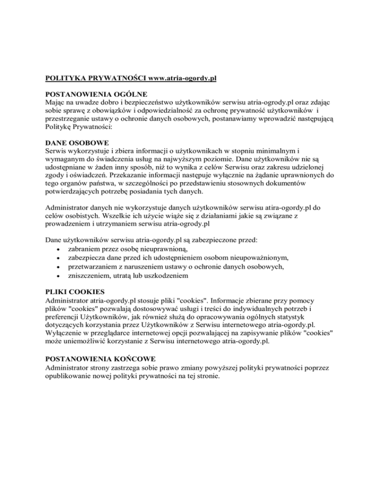 POLITYKA PRYWATNOŚCI www.atria-ogordy.pl POSTANOWIENIA OGÓLNE Mając na uwadze dobro i bezpieczeństwo użytkowników serwisu atria-ogrody.pl oraz zdając sobie sprawę z obowiązków i odpowiedzialność za ochronę prywatność użytkowników i przestrzeganie ustawy o ochronie danych osobowych, postanawiamy wprowadzić następującą Politykę Prywatności: DANE OSOBOWE Serwis wykorzystuje i zbiera informacji o użytkownikach w stopniu minimalnym i wymaganym do świadczenia usług na najwyższym poziomie. Dane użytkowników nie są udostępniane w żaden inny sposób, niż to wynika z celów Serwisu oraz zakresu udzielonej zgody i oświadczeń. Przekazanie informacji następuje wyłącznie na żądanie uprawnionych do tego organów państwa, w szczególności po przedstawieniu stosownych dokumentów potwierdzających potrzebę posiadania tych danych. Administrator danych nie wykorzystuje danych użytkowników serwisu atira-ogordy.pl do celów osobistych. Wszelkie ich użycie wiąże się z działaniami jakie są związane z prowadzeniem i utrzymaniem serwisu atria-ogrody.pl Dane użytkowników serwisu atria-ogordy.pl są zabezpieczone przed: zabraniem przez osobę nieuprawnioną, zabezpiecza dane przed ich udostępnieniem osobom nieupoważnionym, przetwarzaniem z naruszeniem ustawy o ochronie danych osobowych, zniszczeniem, utratą lub uszkodzeniem PLIKI COOKIES Administrator atria-ogordy.pl stosuje pliki "cookies". Informacje zbierane przy pomocy plików "cookies" pozwalają dostosowywać usługi i treści do indywidualnych potrzeb i preferencji Użytkowników, jak również służą do opracowywania ogólnych statystyk dotyczących korzystania przez Użytkowników z Serwisu internetowego atria-ogordy.pl. Wyłączenie w przeglądarce internetowej opcji pozwalającej na zapisywanie plików "cookies" może uniemożliwić korzystanie z Serwisu internetowego atria-ogordy.pl. POSTANOWIENIA KOŃCOWE Administrator strony zastrzega sobie prawo zmiany powyższej polityki prywatności poprzez opublikowanie nowej polityki prywatności na tej stronie.