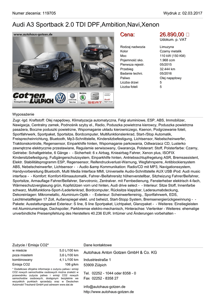 Numer zlecenia: 119705 Wydruk z: 02.03.2017 Audi A3 Sportback 2.0 TDI DPF,Ambition,Navi,Xenon Cena: 26.890,00 Rodzaj nadwozia Kolor Moc Pojemność sko. Pierwsza rejestr. Przebieg Badanie techni. Paliwo Liczba drzwi Liczba foteli Limuzyna Czarny metalik 110 kW (150 KM) 1.968 ccm 05/2015 32.444 km 05/2016 Olej napędowy 5 5 Udokum. p. VAT Wyposażenie Zugr.-lgd. Kraftstoff: Olej napędowy, Klimatyzacja automatyczna, Felgi aluminiowe, ESP, ABS, Immobilizer, Nawigacja, Centralny zamek, Podnośnik szyby el., Radio, Poduszka powietrzna kierowcy, Poduszka powietrzna pasażera, Boczne poduszki powietrzne, Wspomaganie układu kierowniczego, Ksenon, Podgrzewanie foteli, Sportfahrwerk, Sportpaket, Sportsitze, Bordcomputer, Multifunktionslenkrad, Start-/Stop Automatik, Freisprecheinrichtung, Bluetooth, Mp3-Schnittstelle, Kindersitzbefestigung, Lichtsensor, Nebelscheinwerfer, Traktionskontrolle, Regensensor, Einparkhilfe hinten, Wspomaganie parkowania, Odtwarzacz CD, Lusterko zewnętrzne elektrycznie przestawiane, Regularnie serwisowany, Gwarancja, Polsterart: Stoff, Polsterfarbe: Czarny, Getriebe: Schaltgetriebe, 6 Gänge - - Sicherheit: 6 x Airbag, Knieairbag Fahrer, Xenon plus, ISOFIX Kindersitzbefestigung, Fußgängerschutzsystem, Einparkhilfe hinten, Antriebsschlupfregelung ASR, Bremsassistent, Elektr. Stabilitätsprogramm ESP, Regensensor, Reifendruckverlust-Warnung, Wegfahrsperre, Antiblockiersystem ABS, Nebelscheinwerfer, Lichtsensor - - Audio & Kommunikation: Radio/CD mit MP3, Navigationssystem, Handyvorbereitung Bluetooth, Multi Media Interface MMI, Universelle Audio-Schnittstelle AUX USB iPod: Audi music interface - - Komfort: Komfort-Klimaautomatik, Fahrer-/Beifahrersitz höhenverstellbar, Sitzheizung Fahrer/Beifahrer, Sportsitze, Armauflage Fahrer/Beifahrer, Servotronic, Zentralver. mit Fernbedienung, Fensterheber elektrisch 4-fach, Wärmeschutzverglasung grün, Kopfstützen vorn und hinten, Audi drive select - - Interieur: Sitze Stoff, Innenfarbe schwarz, Multifunktions-Sport-/Lederlenkrad, Bordcomputer, Rücksitze klappbar, Laderaumabdeckung, Dekoreinlagen: Mikrometallic, Aluminium-Optik - - Exterieur: Scheinwerferreinig., Sportfahrwerk, EDS, Leichtmetallfelgen 17 Zoll, Außenspiegel elekt. und beheizt, Start-Stopp System, Bremsenergierückgewinnung - Pakete: Ausstattungspaket Exterieur: S line, S line Sportpaket, Lichtpaket, Glanzpaket - - Weiteres: Einstiegleisten mit Aluminiumeinlage, Dachspoiler, Parkbremse elektro-mechanisch, Hinterachse: Vierlenker - Weiteres: ehemalige unverbindliche Preisempfehlung des Herstellers 40.236 EUR. Irrtümer und Änderungen vorbehalten - Zużycie / Emisja CO2* w mieście poza miastem kombinowany Emisja CO2 Dane kontaktowe 5,0 L/100 km 3,6 L/100 km 4,1 L/100 km 106 g/km * Dodatkowe oficjalne informacje o zużyciu paliwa i emisji CO2 nowych samochodów osobowych można znaleźć w przewodniku zużycia paliwa i emisji CO2 nowych samochodów osobowych, dostępnym bezpłatnie we wszystkich punktach sprzedaży oraz w Deutschen Automobil Treuhand GmbH pod adresem www.dat.de Autohaus Anton Gotzen GmbH & Co. KG Industriestraße 1 53909 Zülpich Tel. 02252 - 1044 oder 8358 - 0 Fax 02252 - 8358 27 [email protected] http://www.autohaus-gotzen.de Numer zlecenia: 119705 Audi A3 Sportback 2.0 TDI DPF,Ambition,Navi,Xenon Wydruk z: 02.03.2017 Numer zlecenia: 119705 Audi A3 Sportback 2.0 TDI DPF,Ambition,Navi,Xenon Wydruk z: 02.03.2017