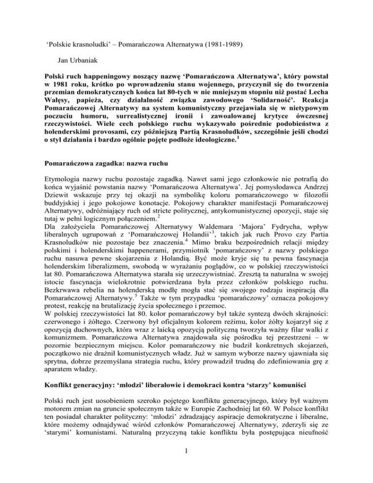 ‘Polskie krasnoludki’ – Pomarańczowa Alternatywa (1981-1989) Jan Urbaniak Polski ruch happeningowy noszący nazwę ‘Pomarańczowa Alternatywa’, który powstał w 1981 roku, krótko po wprowadzeniu stanu wojennego, przyczynił się do tworzenia przemian demokratycznych końca lat 80-tych w nie mniejszym stopniu niż postać Lecha Wałęsy, papieża, czy działalność związku zawodowego ‘Solidarność’. Reakcja Pomarańczowej Alternatywy na system komunistyczny przejawiała się w nietypowym poczuciu humoru, surrealistycznej ironii i zawoalowanej krytyce ówczesnej rzeczywistości. Wiele cech polskiego ruchu wykazywało pośrednie podobieństwa z holenderskimi provosami, czy późniejszą Partią Krasnoludków, szczególnie jeśli chodzi o styl działania i bardzo ogólnie pojęte podłoże ideologiczne. 1 Pomarańczowa zagadka: nazwa ruchu Etymologia nazwy ruchu pozostaje zagadką. Nawet sami jego członkowie nie potrafią do końca wyjaśnić powstania nazwy ‘Pomarańczowa Alternatywa’. Jej pomysłodawca Andrzej Dziewit wskazuje przy tej okazji na symbolikę koloru pomarańczowego w filozofii buddyjskiej i jego pokojowe konotacje. Pokojowy charakter manifestacji Pomarańczowej Alternatywy, odróżniający ruch od stricte politycznej, antykomunistycznej opozycji, staje się tutaj w pełni logicznym połączeniem. 2 Dla założyciela Pomarańczowej Alternatywy Waldemara ‘Majora’ Fydrycha, wpływ liberalnych ugrupowań z ‘Pomarańczowej Holandii’ 3, takich jak ruch Provo czy Partia Krasnoludków nie pozostaje bez znaczenia. 4 Mimo braku bezpośrednich relacji między polskimi i holenderskimi happenerami, przymiotnik ‘pomarańczowy’ z nazwy polskiego ruchu nasuwa pewne skojarzenia z Holandią. Być może kryje się tu pewna fascynacja holenderskim liberalizmem, swobodą w wyrażaniu poglądów, co w polskiej rzeczywistości lat 80. Pomarańczowa Alternatywa starała się urzeczywistniać. Zresztą ta naturalna w swojej istocie fascynacja wielokrotnie potwierdzana była przez członków polskiego ruchu. Bezkrwawa rebelia na holenderską modłę mogła stać się swojego rodzaju inspiracją dla Pomarańczowej Alternatywy. 5 Także w tym przypadku ‘pomarańczowy’ oznacza pokojowy protest, reakcję na brutalizację życia społecznego i przemoc. W polskiej rzeczywistości lat 80. kolor pomarańczowy był także syntezą dwóch skrajności: czerwonego i żółtego. Czerwony był oficjalnym kolorem reżimu, kolor żółty kojarzył się z opozycją duchownych, która wraz z laicką opozycją polityczną tworzyła ważny filar walki z komunizmem. Pomarańczowa Alternatywa znajdowała się pośrodku tej przestrzeni – w pozornie bezpiecznym miejscu. Kolor pomarańczowy nie budził konkretnych skojarzeń, początkowo nie drażnił komunistycznych władz. Już w samym wyborze nazwy ujawniała się sprytna, dobrze przemyślana strategia ruchu, który prowadził trudną do zdefiniowania grę z aparatem władzy. Konflikt generacyjny: ‘młodzi’ liberałowie i demokraci kontra ‘starzy’ komuniści Polski ruch jest uosobieniem szeroko pojętego konfliktu generacyjnego, który był ważnym motorem zmian na gruncie społecznym także w Europie Zachodniej lat 60. W Polsce konflikt ten posiadał charakter polityczny: ‘młodzi’ zdradzający aspiracje demokratyczne i liberalne, które możemy odnajdywać wśród członków Pomarańczowej Alternatywy, zderzyli się ze ‘starymi’ komunistami. Naturalną przyczyną takie konfliktu była postępująca nieufność 1 ‘młodych’ względem skostniałego systemu autorytetów, który w Polsce lat 80. był w rękach represyjnego aparatu władzy. Rebeliancka młodzież, która na zachodzie Europy dała o sobie znać w latach 60. dwudziestego stulecia, w komunistycznej Polsce pojawiła się dwadzieścia lat później. Polskie społeczeństwo lat 60. posiadało charakter zamknięty. ‘Bitnicy’ z pierwszej rebelianckiej generacji młodzieży (w Europie Zachodniej generacja ta przeżywała swoje apogeum już w późnych latach 40. i 50.) byli w polskiej rzeczywistości rzadkim zjawiskiem. Ich następcy, ‘hippisi’, którzy w latach 60. wprowadzili tyle zamieszania w zachodnim świecie, w Polsce poddawani byli systemowej represji. 6 Rozwój ruchu hippisowskiego wraz z anarchizmem (także w formie sytuacjonizmu, co oznaczało społeczne zaangażowanie w sztukę) zaczął rozwijać się na masową skalę dopiero w latach 80.. Powstawały wówczas nielegalne organizacje anarchistyczne, takie jak ‘Ruch Społeczeństwa Alternatywnego’ (założony w 1983), czy ‘Wolność i Pokój’ (1985). Ich ważnym uzupełnieniem stała się prasa podziemna w postaci zinów i czasopism (w tym miejscu warto wymienić tytuły Homek, Rewolta, czy Anarchol). Czasopismo było także ważnym impulsem do działania w przypadku Pomarańczowej Alternatywy. Na krótko przed powstaniem ruchu, we wrześniu 1981 roku wydany został pierwszy numer periodyku Pomarańczowa Alternatywa. Pierwotnie pismo nosiło tytuł A – redagowane przez Fydrycha i Wiesława Cupałę było wówczas jedynym takim wydawnictwem łączącym kreatywną kontestację z nową jakością estetyczną. 7 Ruch Pomarańczowej Alternatywy powstał we Wrocławiu znanym w latach 80. z antyautorytarnego nastawienia jego mieszkańców. Istniała tam dobra współpraca pomiędzy centrami opozycyjnymi ulokowanymi w państwowych zakładach pracy, na wyższych uczelniach i w środowisku artystycznym. To sprawiało, że Wrocław posiadał reputację silnego bastionu opozycyjnego. Protest Pomarańczowej Alternatywny doskonale wpisywał się w tamtejszy klimat. Fydrych mógł z łatwością znaleźć wokół siebie środowisko gotowe na przyjęcie ideałów pierwszego polskiego ruchu happeningowego. Środowisko to tworzyli w początkowym okresie studenci Wrocławskiej Akademii Sztuk Pięknych, gdzie sam Fydrych studiował. Tu właśnie wyrósł fenomen Pomarańczowej Alternatywy, który