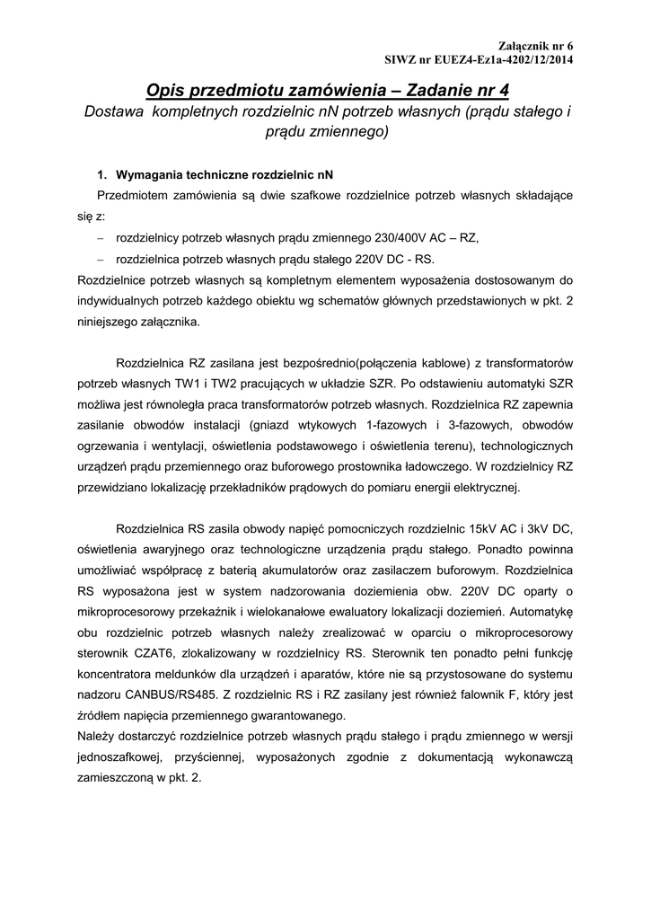 Załącznik nr 6 SIWZ nr EUEZ4-Ez1a-4202/12/2014 Opis przedmiotu zamówienia – Zadanie nr 4 Dostawa kompletnych rozdzielnic nN potrzeb własnych (prądu stałego i prądu zmiennego) 1. Wymagania techniczne rozdzielnic nN Przedmiotem zamówienia są dwie szafkowe rozdzielnice potrzeb własnych składające się z: rozdzielnicy potrzeb własnych prądu zmiennego 230/400V AC – RZ, rozdzielnica potrzeb własnych prądu stałego 220V DC - RS. Rozdzielnice potrzeb własnych są kompletnym elementem wyposażenia dostosowanym do indywidualnych potrzeb każdego obiektu wg schematów głównych przedstawionych w pkt. 2 niniejszego załącznika. Rozdzielnica RZ zasilana jest bezpośrednio(połączenia kablowe) z transformatorów potrzeb własnych TW1 i TW2 pracujących w układzie SZR. Po odstawieniu automatyki SZR możliwa jest równoległa praca transformatorów potrzeb własnych. Rozdzielnica RZ zapewnia zasilanie obwodów instalacji (gniazd wtykowych 1-fazowych i 3-fazowych, obwodów ogrzewania i wentylacji, oświetlenia podstawowego i oświetlenia terenu), technologicznych urządzeń prądu przemiennego oraz buforowego prostownika ładowczego. W rozdzielnicy RZ przewidziano lokalizację przekładników prądowych do pomiaru energii elektrycznej. Rozdzielnica RS zasila obwody napięć pomocniczych rozdzielnic 15kV AC i 3kV DC, oświetlenia awaryjnego oraz technologiczne urządzenia prądu stałego. Ponadto powinna umożliwiać współpracę z baterią akumulatorów oraz zasilaczem buforowym. Rozdzielnica RS wyposażona jest w system nadzorowania doziemienia obw. 220V DC oparty o mikroprocesorowy przekaźnik i wielokanałowe ewaluatory lokalizacji doziemień. Automatykę obu rozdzielnic potrzeb własnych należy zrealizować w oparciu o mikroprocesorowy sterownik CZAT6, zlokalizowany w rozdzielnicy RS. Sterownik ten ponadto pełni funkcję koncentratora meldunków dla urządzeń i aparatów, które nie są przystosowane do systemu nadzoru CANBUS/RS485. Z rozdzielnic RS i RZ zasilany jest również falownik F, który jest źródłem napięcia przemiennego gwarantowanego. Należy dostarczyć rozdzielnice potrzeb własnych prądu stałego i prądu zmiennego w wersji jednoszafkowej, przyściennej, wyposażonych zgodnie z dokumentacją wykonawczą zamieszczoną w pkt. 2. Załącznik nr 6 SIWZ nr EUEZ4-Ez1a-4202/12/2014 Zamawiający dopuszcza użycie materiałów i rozwiązań równoważnych producentów, lecz o parametrach zgodnych z zawartymi w załączonych projektach wykonawczych. Zamawiane urządzenia elektroenergetyczne muszą spełniać wymagania zawarte w Rozporządzeniu Ministra Spraw Wewnętrznych i Administracji z dnia 5 sierpnia 1998 roku w sprawie aprobat i kryteriów technicznych oraz jednostkowego stosowania wyrobów budowlanych (Dz. U. Nr 107, poz. 679) wydanego na podstawie Prawa Budowlanego z dnia 7 lipca 1994 roku (Dz. U. Nr 89, poz. 414) oraz odpowiednich norm. Do zamawianych urządzeń należy dostarczyć oprogramowanie, instrukcje eksploatacji, dokumentację techniczno – ruchową (DTR) w języku polskim i informatyczną w 4 egzemplarzach w wersji papierowej i 1 egz. w wersji elektronicznej. 2. Schematy montażowe Schematy montażowe wraz z wykazem materiałowym dla zamawianych urządzeń zawarte są w załączniku nr 6.1 będącym integralną częścią niniejszej Specyfikacji Istotnych Warunków Zamówienia.