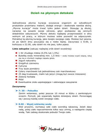 Detoks duszy przez oczyszczenie ciała Dzień na płynnym detoksie Jednodniowa płynna kuracja oczyszcza organizm ze szkodliwych produktów przemiany materii, dodaje energii i doskonale nawilża skórę. „Płynna kuracja” może trwać tylko jeden dzień. Stosując ją dłużej, narazisz na szwank swoje zdrowie, gdyż pozbawisz się cennych składników odżywczych. Płynny detoks najlepiej przeprowadzić w dniu wolnym od pracy, w którym możesz sobie pozwolić na odpoczynek. Potraktuj tę płynną kurację, jako święto swojego ciała. Możesz być pewna, że po takim dniu poczujesz się o niebo lepiej. Zaczynasz o 8.00, a kończysz o 22.00, cały dzień nic nie jesz, tylko pijesz. Lista zakupów (zakupy najlepiej zrób dzień wcześniej) 1 litr chudego mleka (0,5% lub 1,5%) Butelkę wody mineralnej min. 1,5 litra – wody możesz wypić więcej, ratuj się nią w chwilach nagłego napadu głodu Jogurt naturalny Grejpfrut czerwony Cytryna Trzy duże pomidory Cztery marchewki lub jednodniowy sok marchewkowy 25 dag truskawek, malin lub jeżyn (mogą być owoce mieszane) Zielona herbata Miód Ewentualnie zioła uspokajające i ułatwiające zasypianie Zaczynamy 7: 30 – Pobudka Zanim wstaniesz, poleż jeszcze 10 minut w łóżku z zamkniętymi oczami. Pomyśl, jak wspaniały będzie dzisiejszy dzień. Porozciągaj się i poczuj każdą cześć swojego ciała. 8.00 – Wypij szklankę wody Weź prysznic, wymasuj całe ciało szorstką rękawicą. Jeżeli dasz radę, polej ciało naprzemiennie kilka razy zimną, a następnie ciepłą wodą. Taki zabieg doskonale pobudzi Twoje ciało. Detoks duszy przez oczyszczenie ciała 8.30 – Wypij szklankę mleka Idź na niezbyt forsowny spacer, oddychaj głęboko i ciesz się otaczającą Cię przyrodą. 10: 00 – wypij szklankę soku z marchwi 10: 30 - wypij szklankę zielonej herbaty Możesz poczuć pierwsze ssanie w żołądku, zajmij się tym, co lubisz, po kilku minutach nieprzyjemne uczucie zniknie 11: 30 – wypij szklankę soku pomidorowego Możesz poczuć się lekko osłabiona, połóż się na chwilę i zrelaksuj 12: 00 – wypij szklankę wody 12: 30 – wypij koktajl mleczny 13: 30 – wypij szklankę wody Pora obiadowa może być kryzysowa, jeżeli to możliwe wyjdź z domu, pospaceruj, idź do kina, na wystawę… 15: 00 – wypij szklankę soku grejpfrutowego 15: 30 – wypij szklankę wody 17: 00 – wypij szklankę zielonej herbaty 18: 30 – wypij szklankę wody Weź kąpiel, poleż chwilę w pianie. Później wmasuj w ciało ulubiony balsam, zawiń się w ciepły koc i odpocznij. 19: 00 – wypij szklankę soku pomidorowego lub marchwiowego 21: 00 – wypij szklankę mleka (dobrze, jeżeli będzie ciepłe) 21: 30 – wypij szklankę ziół ułatwiających zasypianie Pora do łóżka, dla Twojego organizmu to był dzień ciężkiej pracy, pozwól mu, więc odpocząć. Przygotowanie napojów Koktajl mleczny – zmiksuj 100 mililitrów mleka z 25 dag owoców, dwiema łyżeczkami naturalnego jogurtu i łyżeczką miodu Sok z marchwi – przepuść przez sokowirówkę trzy marchewki, wciśnij trochę soku z cytryny i dodaj odrobinę rozmarynu Detoks duszy przez oczyszczenie ciała Sok pomidorowy – zmiksuj dwa pomidory z kilkoma listkami natki pietruszki i dodaj kilka kropel cytryny Sok grejpfrutowy – wyciśnij sok z grejpfruta i dodaj łyżeczkę miodu Co Ci to da? Woda mineralna – nawodni, pobudzi pracę nerek, wypłucze toksyny Mleko – dzięki dużej zawartości wody i laktozy pobudza przemianę materii, zawarty w nim wapń i proteiny wzmacniają kości. Dzięki zawartości aminokwasu tryptofanu działa uspokajająco. Koktajl mleczny – dostarczysz organizmowi witaminę C i flawonoidy: przeciwutleniacze oraz błonnik, który ułatwi trawienie Sok marchwiowy – duża ilość błonnika ułatwi pracę jelit oraz poprawi trawienie, dostarcza dużą dawkę beta-karotenu, który poprawia wygląd skóry Zielona herbata – pomaga oczyszczać organizm Sok pomidorowy – dostarcza minerałów oraz witaminy C i E, wspomaga oczyszczanie układu trawiennego Sok grejpfrutowy – dostarcza dużej dawki witaminy C i potasu, które pomagają oczyścić nerki i wątrobę