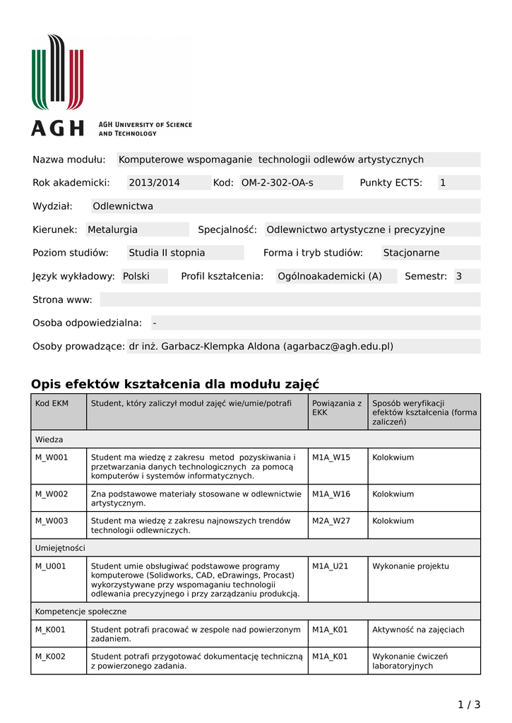 Nazwa modułu: Komputerowe wspomaganie technologii odlewów artystycznych Rok akademicki: Wydział: Kierunek: 2013/2014 Kod: OM-2-302-OA-s Punkty ECTS: 1 Odlewnictwa Metalurgia Poziom studiów: Specjalność: Studia II stopnia Język wykładowy: Polski Odlewnictwo artystyczne i precyzyjne Forma i tryb studiów: Profil kształcenia: Stacjonarne Ogólnoakademicki (A) Semestr: 3 Strona www: Osoba odpowiedzialna: - Osoby prowadzące: dr inż. Garbacz-Klempka Aldona ([email protected]) Opis efektów kształcenia dla modułu zajęć Kod EKM Student, który zaliczył moduł zajęć wie/umie/potrafi Powiązania z EKK Sposób weryfikacji efektów kształcenia (forma zaliczeń) M_W001 Student ma wiedzę z zakresu metod pozyskiwania i przetwarzania danych technologicznych za pomocą komputerów i systemów informatycznych. M1A_W15 Kolokwium M_W002 Zna podstawowe materiały stosowane w odlewnictwie artystycznym. M1A_W16 Kolokwium M_W003 Student ma wiedzę z zakresu najnowszych trendów technologii odlewniczych. M2A_W27 Kolokwium Student umie obsługiwać podstawowe programy komputerowe (Solidworks, CAD, eDrawings, Procast) wykorzystywane przy wspomaganiu technologii odlewania precyzyjnego i przy zarządzaniu produkcją. M1A_U21 Wykonanie projektu Wiedza Umiejętności M_U001 Kompetencje społeczne M_K001 Student potrafi pracować w zespole nad powierzonym zadaniem. M1A_K01 Aktywność na zajęciach M_K002 Student potrafi przygotować dokumentację techniczną z powierzonego zadania. M1A_K01 Wykonanie ćwiczeń laboratoryjnych 1/3 Karta modułu - Komputerowe wspomaganie technologii odlewów artystycznych Matryca efektów kształcenia w odniesieniu do form zajęć Zajęcia praktyczne - + - - - - - - - - M_W002 Zna podstawowe materiały stosowane w odlewnictwie artystycznym. - - + - - - - - - - - M_W003 Student ma wiedzę z zakresu najnowszych trendów technologii odlewniczych. - - + - - - - - - - - Student umie obsługiwać podstawowe programy komputerowe (Solidworks, CAD, eDrawings, Procast) wykorzystywane przy wspomaganiu technologii odlewania precyzyjnego i przy zarządzaniu produkcją. - - + - - - - - - - - E-learning Zajęcia seminaryjne - Zajęcia Konwersatori um Student ma wiedzę z zakresu metod pozyskiwania i przetwarzania danych technologicznych za pomocą komputerów i systemów informatycznych. Zajęcia terenowe Ćwiczenia projektowe M_W001 Inne Ćwiczenia laboratoryjne Forma zajęć Ćwiczenia audytoryjne Student, który zaliczył moduł zajęć wie/umie/potrafi Wykład Kod EKM Wiedza Umiejętności M_U001 Kompetencje społeczne M_K001 Student potrafi pracować w zespole nad powierzonym zadaniem. - - + - - - - - - - - M_K002 Student potrafi przygotować dokumentację techniczną z powierzonego zadania. - - + - - - - - - - - Treść modułu zajęć (program wykładów i pozostałych zajęć) Ćwiczenia laboratoryjne Podstawowe pojęcia i standardy graficzne. Cechy grafiki rastrowej. Cechy grafiki wektorowej. Cechy grafiki prezentacyjnej. Programy grafiki rastrowej. Przetwarzanie obrazu i wizualizacja danych. Programy do grafiki wektorowej. Liternictwo komputerowe. Animacja. Programy do grafiki prezentacyjnej. Rysunek techniczny i komputerowo wspomagane projektowanie. CAD i rysunek techniczny. Komputerowo wspomagane projektowanie. Diagramy i schematy. Sharewarowe i darmowe programy graficzne. Tendencje rozwojowe grafiki komputerowej. Wspomaganie komputerowe wzornictwa. Zastosowanie oprogramowania profesjonalnego do wzornictwa odlewniczego. Oprogramowanie specjalistyczne do wspomagania przygotowania technologii odlewniczej. Możliwości i zastosowanie programu Solidworks. 2/3 Karta modułu - Komputerowe wspomaganie technologii odlewów artystycznych Podstawy tworzenia części w SolidWorksie. Operacje obrotowe i wstawiane po okręgu. Opcje systemu, ustawienia, zastosowanie opcji. Elementy cienkościenne. Konfiguracja (warianty) części. Złożenia tworzone metodą “od dołu do góry”. Edycja części. Zaawansowane modelowanie na bazie poleceń “sweep” i “10ft”. Tworzenie elementów blaszanych. Konfiguracja (warianty) w złożeniu. Zaawansowane złożenia tworzone metodą “od góry do dołu”. Przygotowanie formy odlewniczej – odjęcie elementów wspólnych dla brył (cavity). Tworzenie dokumentacji technicznej. Tworzenie grafiki prezentacyjnej – eDrawings. Wymiana danych z innym oprogramowaniem. Wykonanie projektu. Symulacja komputerowa krzepnięcia z wykorzystaniem oprogramowania Procast. Sposób obliczania oceny końcowej Średnia ocen ze sprawdzianów, sprawozdań oraz projektu. Obecność na zajęciach. Wymagania wstępne i dodatkowe Podstawowa znajomość technologii procesów odlewniczych. Zalecana literatura i pomoce naukowe 1.R. Tadeusiewicz: Wstęp do informatyki 2.Podręczniki do: Microsoft Office, Word, Excel, PowerPoint, Internet. 3.B. Mochnacki, J.S.Suchy, Modelowanie i symulacja krzepnięcia odlewów, Warszawa PWN 1993, stron 219; 4.B. Mochnacki, J.S. Suchy, Numerical methods in computations of foundry processes, Wyd. PFTA, Kraków 1995 (j.ang.);\ 5.Z. Ignaszak, Virtual prototyping w odlewnictwie, Wyd. Politechniki Poznańskiej, 2002. Publikacje naukowe osób prowadzących zajęcia związane z tematyką modułu Nie podano dodatkowych publikacji Informacje dodatkowe Brak Nakład pracy studenta (bilans punktów ECTS) Forma aktywności studenta Obciążenie studenta Udział w ćwiczeniach laboratoryjnych 15 godz Egzamin lub kolokwium zaliczeniowe 5 godz Samodzielne studiowanie tematyki zajęć 5 godz Przygotowanie do zajęć 5 godz Sumaryczne obciążenie pracą studenta 30 godz Punkty ECTS za moduł 1 ECTS 3/3