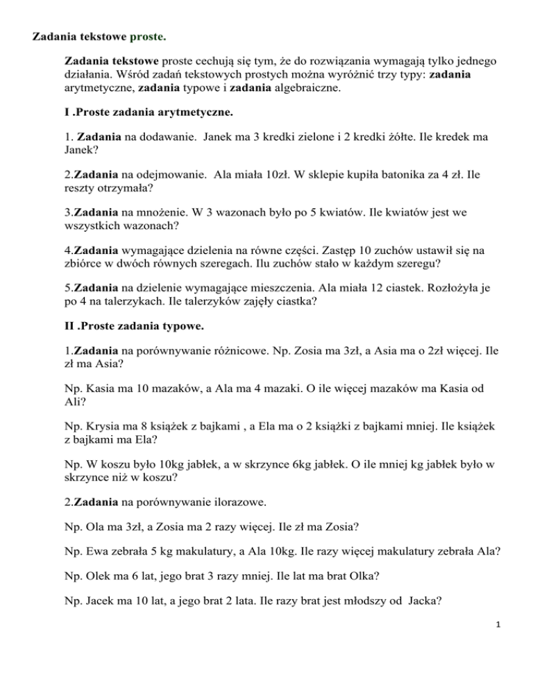 Zadania tekstowe proste. Zadania tekstowe proste cechują się tym, że do rozwiązania wymagają tylko jednego działania. Wśród zadań tekstowych prostych można wyróżnić trzy typy: zadania arytmetyczne, zadania typowe i zadania algebraiczne. I .Proste zadania arytmetyczne. 1. Zadania na dodawanie. Janek ma 3 kredki zielone i 2 kredki żółte. Ile kredek ma Janek? 2.Zadania na odejmowanie. Ala miała 10zł. W sklepie kupiła batonika za 4 zł. Ile reszty otrzymała? 3.Zadania na mnożenie. W 3 wazonach było po 5 kwiatów. Ile kwiatów jest we wszystkich wazonach? 4.Zadania wymagające dzielenia na równe części. Zastęp 10 zuchów ustawił się na zbiórce w dwóch równych szeregach. Ilu zuchów stało w każdym szeregu? 5.Zadania na dzielenie wymagające mieszczenia. Ala miała 12 ciastek. Rozłożyła je po 4 na talerzykach. Ile talerzyków zajęły ciastka? II .Proste zadania typowe. 1.Zadania na porównywanie różnicowe. Np. Zosia ma 3zł, a Asia ma o 2zł więcej. Ile zł ma Asia? Np. Kasia ma 10 mazaków, a Ala ma 4 mazaki. O ile więcej mazaków ma Kasia od Ali? Np. Krysia ma 8 książek z bajkami , a Ela ma o 2 książki z bajkami mniej. Ile książek z bajkami ma Ela? Np. W koszu było 10kg jabłek, a w skrzynce 6kg jabłek. O ile mniej kg jabłek było w skrzynce niż w koszu? 2.Zadania na porównywanie ilorazowe. Np. Ola ma 3zł, a Zosia ma 2 razy więcej. Ile zł ma Zosia? Np. Ewa zebrała 5 kg makulatury, a Ala 10kg. Ile razy więcej makulatury zebrała Ala? Np. Olek ma 6 lat, jego brat 3 razy mniej. Ile lat ma brat Olka? Np. Jacek ma 10 lat, a jego brat 2 lata. Ile razy brat jest młodszy od Jacka? 1 3. Zadania na sprowadzanie do jedności. Np. Jedna książka kosztuje 5 zł. Ile trzeba zapłacić za 3 takie książki? Np. Za 4 jednakowe mazaki zapłacono 12zł. Ile kosztował jeden mazak? III. Proste zadania algebraiczne. 1.Zadania na obliczanie pierwszego niewiadomego składnika przy danej sumie i drugim składniku. Np. Ala ustawiła kilka płytkich i 6 głębokich talerzy na stole. Razem ustawiła 10 talerzy. Ile talerzy płytkich ustawiła Ala? 2.Zadania na obliczanie drugiego niewiadomego składnika na podstawie danej sumy i pierwszego składnika. Np.. W ogródku kwitło 6 tulipanów. W nocy zakwitło jeszcze kilka. Rano w ogródku kwitło 13 tulipanów. Ile tulipanów zakwitło w nocy? 3.Zadania na znajdywanie niewiadomego odjemnika przy danej różnicy i odjemnej. Np. Na półce było 15 książek. Kiedy Zosia wzięła pewną ilość książek z półki to zostało jeszcze 8 książek. Ile książek wzięła Zosia? 4.Zadania na znajdowanie niewiadomej odjemnej przy danej różnicy i odjemniku. Np. Mama miała w szafce pewną ilość cukru. Kiedy zużyła 3kg cukru, to zostały jeszcze 4kg cukru. Ile kg cukru miała mama w szafce? 5.Zadania na obliczanie pierwszego niewiadomego czynnika przy danym iloczynie i drugim czynniku. Np. Tata posadził w kilku rzędach po 5 drzewek. Razem zasadził 20 drzewek. W ilu rzędach tata posadził drzewka? 6.Zadania na obliczanie drugiego niewiadomego czynnika przy danym iloczynie i pierwszym czynniku. Np. Krawcowa uszyła 4 bluzki. Do każdej przyszyła po tyle samo guzików. Zużyła 20guzików. Po ile guzików przyszyła do jednej bluzki? 7.Zadania na obliczanie niewiadomego dzielnika na podstawie danej dzielnej i ilorazu. Np. Mama rozlała 12l miodu do jednakowych słoików. W każdym słoiku zmieściły się 2l miodu. Ile słoików zużyła mama? 8.Zadania na obliczanie niewiadomej dzielnej przy danym dzielniku i ilorazie. Np. Krysia miała wstążkę. Kiedy rozcięła ją na 4 równe kawałki, to okazało się, że każdy kawałek ma 2m długości. Ile metrów wstążki miała Krysia? Zadania tekstowe złożone. I. Zadania tekstowe złożone o strukturze arytmetycznej. 2 1.Zadania prowadzące do formuł arytmetycznych zawierających takie działania, które mogą być wykonane zgodnie z porządkiem, w jakim zostały zapisane. Np. Krysia miała w skarbonce 20 zł, wyjęła 5zł na kupno zeszytów, a potem dołożyła 7 zł. Ile zł jest w skarbonce? 2.Zadania prowadzące do formuł, w których kolejność działań wyznaczona jest przez nawiasy. Np. W skrzynce mieści się 10 kg jabłek. Pusta skrzynka waży 2kg.Ile waży 5 skrzynek z jabłkami? 3.Zadania tekstowe arytmetyczne, prowadzące do formuł, w których kolejność działań wyznaczona jest przez różne rodzaje działań i nawiasów. Np. Za 637 zł kupiono 9 garnuszków po 45 zł i 8 łyżek . Ile kosztowała 1 łyżka? II. Zadania tekstowe złożone typowe. Porównywanie różnicowe 1. Zadania wymagające dwukrotnego porównywania różnicowego. Np. Ala ma 6 lat, mama jest od niej starsza o 20 lat, a babcia jest starsza o 25 lat od mamy. Ile lat ma babcia? 2.Zadania wymagające obliczenia wielkości jawnych oraz półjawnych określonych za pomocą porównywania różnicowego. Np. Ala kupiła 4 mazaki czarne, a czerwonych kupiła o 5 więcej. Ile mazaków kupiła Ala? 3. Zadania wymagające wykonywania dodatkowych działań z wielkością wyrażoną za pomocą porównywania różnicowego. Np. Zeszyt 16-kartkowy kosztuje 2zł, a zeszyt 80kartkowy jest o 3zł droższy. Ile kosztuje 5 zeszytów 80-kartkowych? Porównywanie ilorazowe. 1.Zadania wymagające dwukrotnego porównywania ilorazowego. Np. Siostra Janka ma 2 lata, Janek jest 3 razy starszy od siostry, a mama jest 5 razy starsza od Janka. Ile lat ma mama? 2.Zadania wymagające obliczenia sumy wielkości jawnych oraz półjawnych wyrażonych za pomocą porównywania ilorazowego. Np. Zosia przeczytała pierwszego dnia 10 stron książki, drugiego dnia przeczytała 3 razy więcej stron. Ile stron przeczytała Zosia wciągu 2 dni? 3.Zadania wymagające wykonania dodatkowych działań z wielkościami wyrażonymi za pośrednictwem porównywania ilorazowego. Np. Jacek zapłacił za książkę 40zł, a za zeszyt 8 razy mniej. Jego siostra kupiła 4 takie zeszyty. Ile zł wydała siostra? Odrębny typ zadań s