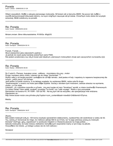 Porada Autor: Lukasz - 2006/02/02 21:29 _____________________________________ Witam wszystkich. My¶lê o zakupie pierwszego motocykla. Sk³aniam siê w kierunku BMW. Na pocz± tek my¶lê o czym¶ starszym(nawet kilkunasto letnim), na czym móg³bym nauczyæ siê je¼dziæ. Chcia³bym moto dobre do turystyki szosowej. Bêdê wdziêczny za poradê. ============================================================================ Re: Porada Autor: franek - 2006/02/03 22:53 _____________________________________ Mniam,mniam .Bmw klikunastoletnie. R100Gs -80gG/S ============================================================================ Re: Porada Autor: Szwajcar - 2006/02/04 00:10 _____________________________________ Franek, Franek..... Sk±d wiedzia³em jaka odpowied¼ padnie;) Ja jednak do nauki jazdy bardziej widzia³bym serie F650. Nie jestem przekonany czy ciê¿ki boxer jest idealnym, pierwszym motocyklem choæ sam zaczyna³em na boxerku:))))) ============================================================================ Re: Porada Autor: Mazby - 2006/02/04 08:35 _____________________________________ S± 2 szko³y. Pierwsz, kupujesz coraz...wiêkszy , mocniejszy dro¿szy...motor Druga: kupujesz dobry motor i starasz sie do niego "dorosnaæ". T Wybór zale¿y od twojej psychiki i podej¶cia do ca³o¶ci tematu. Jesli jestes m³ody i napalony to napewno bezpieczniej dla innych ,¿ebys zacz±³ od ma³ego. Jesli jestes cz³owiek mysl±cy, a na takiego wyglada, bo wybierasz BMW, radze szko³ê drug±. "Awansowanie" z motoru na motor jest do¶æ szybkie. Gorzej z obrotem tymi motorami, zawsze stracisz na wymianie, chyba, ¿e Cie staæ. Uwazam, ¿ê z odrobina rozs±dku w g³owie , mo¿esz kupiæ od razu "docelowy" sprzêt, w miare mozliwo¶ci finansowych. Co lubisz robiæ? Sam asfalt, szuterki, turystyka "no limits" czy "cafe voyage". Warto o tym pomysleæ. Namawiam na boxera 4V, R1100R - GS lub RS . Na ka¿dym siê da wszystko, ale specjalizacja mile widziana. Zapraszam na : http://www.boxer-motor.one.pl/index.php?option=com_content&task=view&id=24&Itemid=57priva. Mazby ============================================================================ Re: Porada Autor: Szwajcar - 2006/02/04 16:57 _____________________________________ Zbysiu, Mój ostatni motocykl (ciê¿ki, 120 konny turytsyk) sprzeda³em statecznemu, wydawa³oby siê osobnikowi w wieku lat 42. Te¿ zamie¿a³ dorosn±æ do niego, bo nielicz±c jakiejs MZ-ki za m³odu, by³ to jego pierwszy powa¿ny motocykl. Dorasta³ nied³ugo, gdy¿ zaparkowa³ w autobusie miejskim w Olsztynie jeszcze na mojej polisie..... Szkoda motocykla, bo ludzi mówi±c delikatnie niemy¶l±cych racjonalnie mamy w tym kraju na pêczki. Oczywi¶cie nie mówie, ¿e kolego Lukasz sie do nich zalicza:) Szwajcar ============================================================================ ARCHIWUM FoRUM BOXER-MOTOR - MOTOCYKLE BMW sklep BOXER-PARTS.eu MamboBoard czê¶ci i akcesoria Forum Component version: 1.4 Stable Generated: 2 March, 2017, 22:55 Re: Porada Autor: Ron - 2006/02/06 00:54 _____________________________________ lukaszu, wszystko zalezy od tego ile masz kasy. pozdr ron ============================================================================ Re: Porada Autor: Stranger - 2006/02/07 08:40 _____________________________________ Franio, masz racjê, nie ma to jak dobra stara dwózaworówka. Seria F z kolei te¿ nie jest a¿ tak bardzo przyjazna dla pocz±tkuj±cego. To zjawisko hamowania silnika przy odjêciu gazu mo¿e zniechêciæ - mnie sie nie bardzo podoba³o - jak bym heblowa³ bez u¿ycia hamulca. ============================================================================ Re: Porada Autor: deVris - 2006/02/13 20:30 _____________________________________ Ja zacz±³em zabawe z motocyklem jeszcze ciekawiej. W podstawówce - ruski motorower (na pead³y!) Wierchowina. Cholerstwo przegrzewa³o siê i zaciera³o non stop. Pora¿ka. Ale zaciêcie i ochote na dalsz± zabawe robi³o to straszn±. Wiêc dalej prawko kategorii jak nale¿y, i Jawa TS350. Z niema³± nie¶mia³o¶ci±- wszak motor to by³ na wyrost. Po dziadku ca³y czas spoczywa³a w gara¿u tajemnicza kupa ¿elastwa w skrzyniach z napisem BMW. Któego¶ razu po prostu zabra³em siê za to - a by³ to Osio³ek R35. Po prostu papier ¶cierny by rdzê przegnaæ, lakier, czyszczenie i smarowanie silnika, klucze, ¶rubki. Ca³o¶æ z³o¿ona do¶æ zgrabnie w jedn± ca³o¶æ. I co? Odpali³ od drugiego kopa. Wiadomym siê sta³o ¿e BMW i tylko BMW i ju¿ nic wiêcej. Minê³o kilka lat. Finansowo podros³em, przekona³em ma³¿onkê, no i mam. R1100GS. Co gor±co polecam tym co jeszcze nie maj±.. p.s. Podobno mówi± ¿e jak ¿ona nie pozwala kupiæ motoru, to trzeba zmieniæ.. ¿one :) Pozdrawiam ============================================================================ Re: Porada Autor: Lukasz - 2006/02/15 13:07 _____________________________________ Dziêki wszystkim. ============================================================================ ARCHIWUM FoRUM BOXER-MOTOR - MOTOCYKLE BMW sklep BOXER-PARTS.eu MamboBoard czê¶ci i akcesoria Forum Component version: 1.4 Stable Generated: 2 March, 2017, 22:55