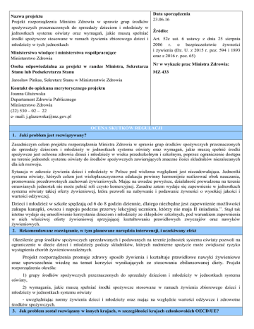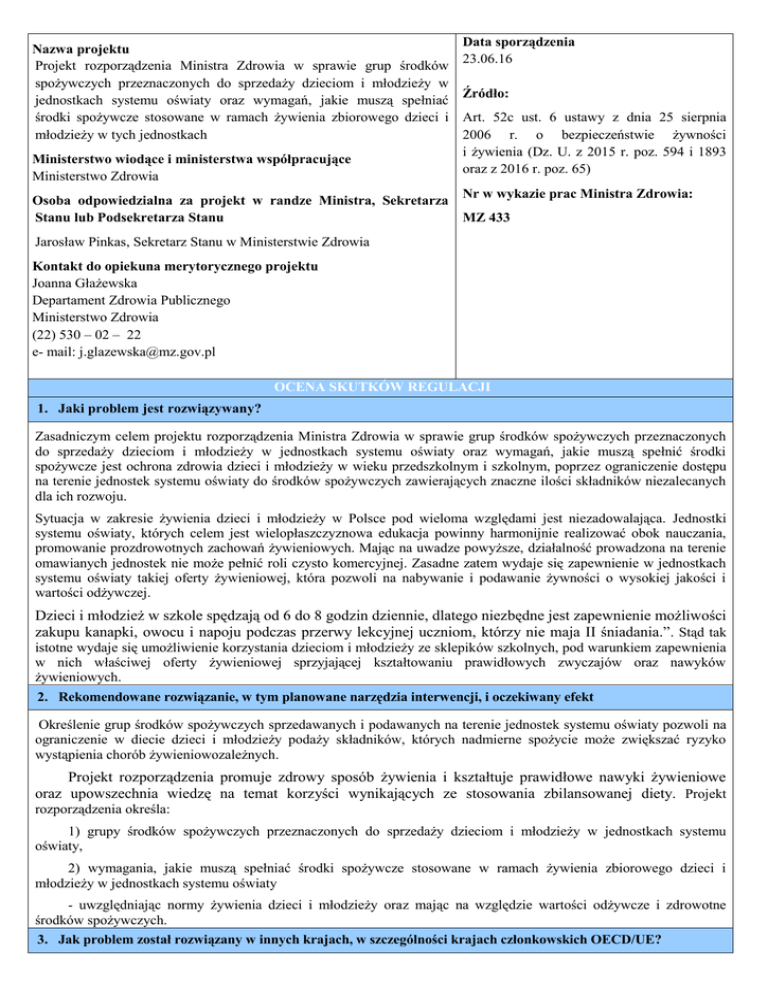 Nazwa projektu Projekt rozporządzenia Ministra Zdrowia w sprawie grup środków spożywczych przeznaczonych do sprzedaży dzieciom i młodzieży w jednostkach systemu oświaty oraz wymagań, jakie muszą spełniać środki spożywcze stosowane w ramach żywienia zbiorowego dzieci i młodzieży w tych jednostkach Ministerstwo wiodące i ministerstwa współpracujące Ministerstwo Zdrowia Data sporządzenia 23.06.16 Źródło: Art. 52c ust. 6 ustawy z dnia 25 sierpnia 2006 r. o bezpieczeństwie żywności i żywienia (Dz. U. z 2015 r. poz. 594 i 1893 oraz z 2016 r. poz. 65) Nr w wykazie prac Ministra Zdrowia: Osoba odpowiedzialna za projekt w randze Ministra, Sekretarza Stanu lub Podsekretarza Stanu MZ 433 Jarosław Pinkas, Sekretarz Stanu w Ministerstwie Zdrowia Kontakt do opiekuna merytorycznego projektu Joanna Głażewska Departament Zdrowia Publicznego Ministerstwo Zdrowia (22) 530 – 02 – 22 e- mail: [email protected] OCENA SKUTKÓW REGULACJI 1. Jaki problem jest rozwiązywany? Zasadniczym celem projektu rozporządzenia Ministra Zdrowia w sprawie grup środków spożywczych przeznaczonych do sprzedaży dzieciom i młodzieży w jednostkach systemu oświaty oraz wymagań, jakie muszą spełnić środki spożywcze jest ochrona zdrowia dzieci i młodzieży w wieku przedszkolnym i szkolnym, poprzez ograniczenie dostępu na terenie jednostek systemu oświaty do środków spożywczych zawierających znaczne ilości składników niezalecanych dla ich rozwoju. Sytuacja w zakresie żywienia dzieci i młodzieży w Polsce pod wieloma względami jest niezadowalająca. Jednostki systemu oświaty, których celem jest wielopłaszczyznowa edukacja powinny harmonijnie realizować obok nauczania, promowanie prozdrowotnych zachowań żywieniowych. Mając na uwadze powyższe, działalność prowadzona na terenie omawianych jednostek nie może pełnić roli czysto komercyjnej. Zasadne zatem wydaje się zapewnienie w jednostkach systemu oświaty takiej oferty żywieniowej, która pozwoli na nabywanie i podawanie żywności o wysokiej jakości i wartości odżywczej. Dzieci i młodzież w szkole spędzają od 6 do 8 godzin dziennie, dlatego niezbędne jest zapewnienie możliwości zakupu kanapki, owocu i napoju podczas przerwy lekcyjnej uczniom, którzy nie maja II śniadania.”. Stąd tak istotne wydaje się umożliwienie korzystania dzieciom i młodzieży ze sklepików szkolnych, pod warunkiem zapewnienia w nich właściwej oferty żywieniowej sprzyjającej kształtowaniu prawidłowych zwyczajów oraz nawyków żywieniowych. 2. Rekomendowane rozwiązanie, w tym planowane narzędzia interwencji, i oczekiwany efekt Określenie grup środków spożywczych sprzedawanych i podawanych na terenie jednostek systemu oświaty pozwoli na ograniczenie w diecie dzieci i młodzieży podaży składników, których nadmierne spożycie może zwiększać ryzyko wystąpienia chorób żywieniowozależnych. Projekt rozporządzenia promuje zdrowy sposób żywienia i kształtuje prawidłowe nawyki żywieniowe oraz upowszechnia wiedzę na temat korzyści wynikających ze stosowania zbilansowanej diety. Projekt rozporządzenia określa: 1) grupy środków spożywczych przeznaczonych do sprzedaży dzieciom i młodzieży w jednostkach systemu oświaty, 2) wymagania, jakie muszą spełniać środki spożywcze stosowane w ramach żywienia zbiorowego dzieci i młodzieży w jednostkach systemu oświaty - uwzględniając normy żywienia dzieci i młodzieży oraz mając na względzie wartości odżywcze i zdrowotne środków spożywczych. 3. Jak problem został rozwiązany w innych krajach, w szczególności krajach członkowskich OECD/UE? Zagadnienie zostało uregulowane w wielu krajach regionu europejskiego. 4. Podmioty, na które oddziałuje projekt Grupa Dzieci i młodzież. Wielkość Liczba dzieci w nauczaniu przedszkolnym 1 236 280, liczba wychowanków korzystających z wyżywienia – trudne do oszacowania. Źródło danych System Informacji Oświatowej (wrzesień 2014 r.), Główny Urząd Statystyczny (wrzesień 2013 r.). Oddziaływanie Profilaktyka, mająca na celu zmniejszenie ryzyka rozwoju przewlekłych chorób niezakaźnych w okresie dorastania i w wieku dorosłym (takich jak: otyłość, cukrzyca typu 2, choroby układu krążenia, choroby nowotworowe dietozależne) oraz promocja zdrowych nawyków żywieniowych wśród dzieci i młodzieży. System Informacji Oświatowej (wrzesień 2014 r.), Główny Urząd Statystyczny (wrzesień 2013 r.). W przypadku dyrektorów przedszkoli, osób kierujących inną formą wychowania przedszkolnego, dyrektorów szkół lub innych placówek, na które oddziałuje rozporządzenie – nadzór nad zmianą asortymentu żywności sprzedawanej lub stosowanej w ramach żywienia zbiorowego w jednostkach systemu oświaty, edukacja. Brak danych. Zmiana asortymentu sprzedawanej żywności zgodnie z §1 rozporządzenia, dostosowanie żywienia zbiorowego w jednostkach systemu oświaty do wymagań zaprezentowanych w §2rozporządzenia. Nadzór nad asortymentem żywności sprzedawanej, reklamowanej, promowanej i podawanej w ramach żywienia zbiorowego w jednostkach systemu Liczba uczniów 4 737 780, w tym liczba korzystających ze stołówek to 1 186 196. Organy prowadzące przedszkole, oddziały przedszkolne przy szkole podstawowej, punkty przedszkolne i zespoły wychowania przedszkolnego oraz szkoły (np. jednostki samorządu terytorialnego, właściwy minister). Podmioty prowadzące sprzedaż środków spożywczych lub działalność w zakresie zbiorowego żywienia dzieci i młodzieży. Organy Państwowej Inspekcji Sanitarnej Liczba przedszkoli, oddziałów przedszkolnych przy szkole podstawowej, punkty przedszkolne i zespoły wychowania przedszkolnego 21 661 (miasto 10 296, wieś 11 365). Liczba szkół dla dzieci i młodzieży 28 940, w tym liczba posiadanych stołówek 11 694. Brak danych. Liczba Państwowych Powiatowych Inspektorów Sanitarnych – 318, liczba Państwowych Główny Inspektorat