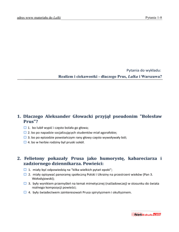 adres www materiału do Lalki Pytania 1-8 Pytania do wykładu: Realizm i ciekawostki - dlaczego Prus, Lalka i Warszawa? 1. Dlaczego Aleksander Głowacki przyjął pseudonim "Bolesław Prus"? 1. bo lubił wypić i często bolała go głowa; 2. bo po napadzie socjalizujących studentów miał agorafobie; 3. bo po epizodzie powstańczym rany głowy często wywoływały ból; 4. bo w herbie rodziny był pruski sokół. 2. Felietony pokazały Prusa jako humorystę, kabareciarza i zadziornego dziennikarza. Powieści: 1. miały być odpowiedzią na "kilka wielkich pytań epoki"; 2. miały opisywać panoramę społeczną Polski i Ukrainy na przestrzeni wieków (Pan 3. Wołodyjowski); 3. były wynikiem przemyśleń na temat mimetycznej (naśladowczej) w stosunku do świata realnego kompozycji powieści; 4. były świadectwem zainteresowań Prusa spirytyzmem i okultyzmem. adres www materiału do Lalki 3. Pytania 1-8 Z zadziornego dziennikarza-felietonisty Prus w Lalce przedzierzgnął się w myśliciela, odpowiadającego „na kilka wielkich pytań epoki”. Miał wtedy: 1. 40 lat i 3 powieści, w tym Emancypantki; 2. 35 lat i jedną powieść; 3. 40 lat i wydaną rok wcześniej Placówkę; 4. 38 lat i jeszcze żadnej powieści. 4. Pochodzące z dziennikarskiego warsztatu „obrazki”, składające się na kompozycje powieści - to klucz do w pozytywistycznego realizmu Lalki. Taki "obrazek" to między innymi: 1. wyrazista sytuacja, np. rozmowa Rzeckiego i Wokulskiego na wyścigach; 2. dokumentarny zapis zjawiska obyczajowego, np. wielkanocna kwesta w kościele karmelitów; 3. charakterystyczny dialog (scenka z jadłodalni i winiarni u Hopfera otwierająca powieść); 4. postacie z życia, jak opis wyglądu i zachowanie „Magdalenki”. 5. W powieści opis Powiśla - to pretekst. Marzenia Wokulskiego o jego przebudowie czy sam opis – jest kluczem do przedstawienia kontrastów każdego z przedstawicieli „3 pokoleń” i wielowarstwowości społecznej Warszawy. Powiśle to: 1. wg Wokulskiego to dobry rezerwuar wody dla całej Warszawy; 2. pełen schludnej czystości opis wybudowanych w 1893 roku skromnych domków dla robotników; 3. źródło cuchnących, niemal ruszających się śmieci i zapadających się po bruk, drewnianych domów; 4. miejsce, gdzie pewnej zimowej nocy Wokulski odmroził sobie ręce. adres www materiału do Lalki Pytania 1-8 6. Realizm w Lalce to m.in. zestaw szkiców fizjologicznych i psychologicznych zarówno bohaterów, jak dzielnic czy mniejszych obiektów. Należą do nich: 1. opis mimiki i fizjognomii panny Izabeli; 2. wielokrotny opis wpływu stanów wewnętrznych Wokulskiego na jego zachowanie; 3. opis konia Wysockiego; 4. opis kamienicy Łęckich czy samej Warszawy, zwłaszcza podczas zmian pór roku (np. wiosna czy lato). 7. Nie byłoby nowatorstwa kompozycji w Lalce bez historii starego subiekta. Jego celem są m.in. 1. wprowadzenie romantycznej, gawędziarskiej narracji, odbiegającej od wnikliwej obserwacji współczesnej akcji; 2. zaburzenie chronologii, tak, jak zaburzona jest pamięć ludzka w ogóle; 3. przejaw dziennikarskich ciągot Prusa do zabawy, poplotkowania i oderwania od nielubianego realizmu współczesności; 4. pretekstem do opisu teraźniejszości, która jest „owocem” przeszłości (wiemy, dlaczego Wokulski wyjechał). 8. Nieliczne i dobrze umotywowane zbiegi okoliczności i mentorskie uwagi dają świadectwo zapotrzebowania także na prosty przekaz rodem z minionej, tendencyjnej epoki lat 7oych XIX w. Do takich historii należą: 1. wyjazd Wokulskiego do Paryża, gdzie inwestuje z Suzinem w zakup broni dla Rosji; 2. spotkanie z Geistem, nadzieją zbawienia ludzkości dzięki postępowi nauki; 3. spotkanie z Wysockim w Skierniewicach (ratującym w ostatniej chwili Wokulskiego) by okazać moralną wartość ludu; 4. wyjazd do Zasławka by przygotować finałowy wybuch.
